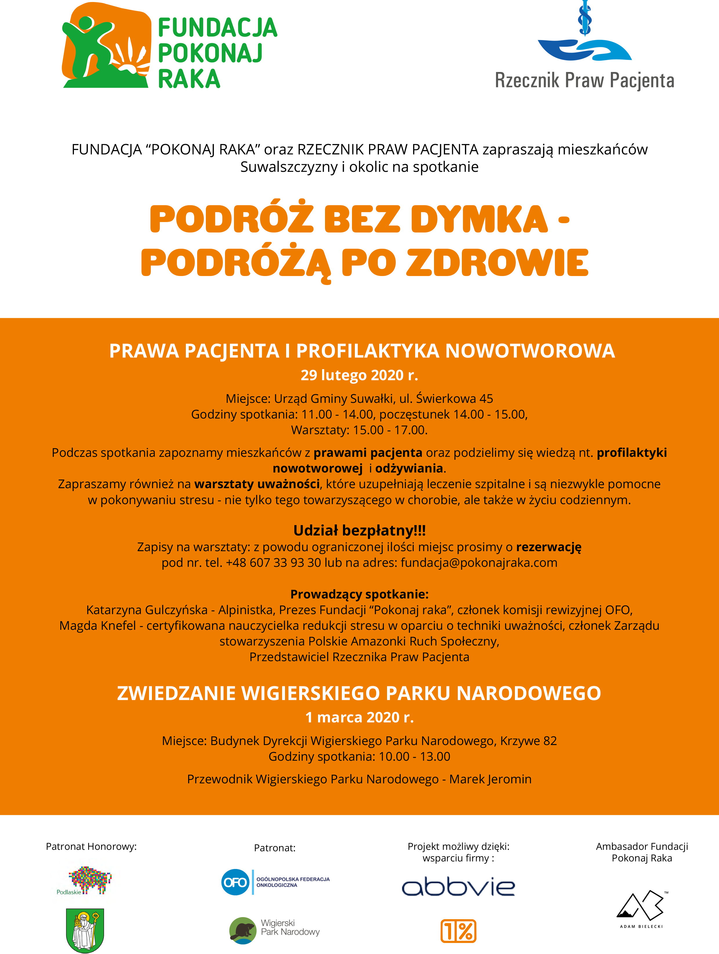 Chcąc zwrócić uwagę jak ważna w naszym życiu jest profilaktyka, aktywność i zdrowy tryb życia - zarówno, gdy jesteśmy zdrowi jak i w sytuacji gdy zmagamy się z chorobą Rzecznik Praw Pacjenta - oraz Prezes Fundacji "Pokonaj raka" zorganizowali wspólną akcję informacyjną pt. "Podróż bez dymka - podróżą po zdrowie" poświęconą prawom pacjenta oraz profilaktyce raka płuc. Pierwsze spotkanie w ramach akcji odbędzie się w najbliższą sobotę 29 lutego w Suwałkach. Szczegóły na poniższym plakacie.