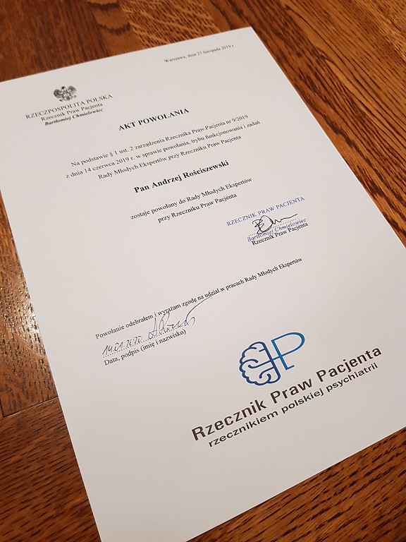 Na zakończenie Bartłomiej Chmielowiec wręczył Andrzejowi Rościszewskiemu akt powołania do Rady Młodych Ekspertów ds. psychiatrii i leczenia uzależnień przy Rzeczniku Praw Pacjenta.