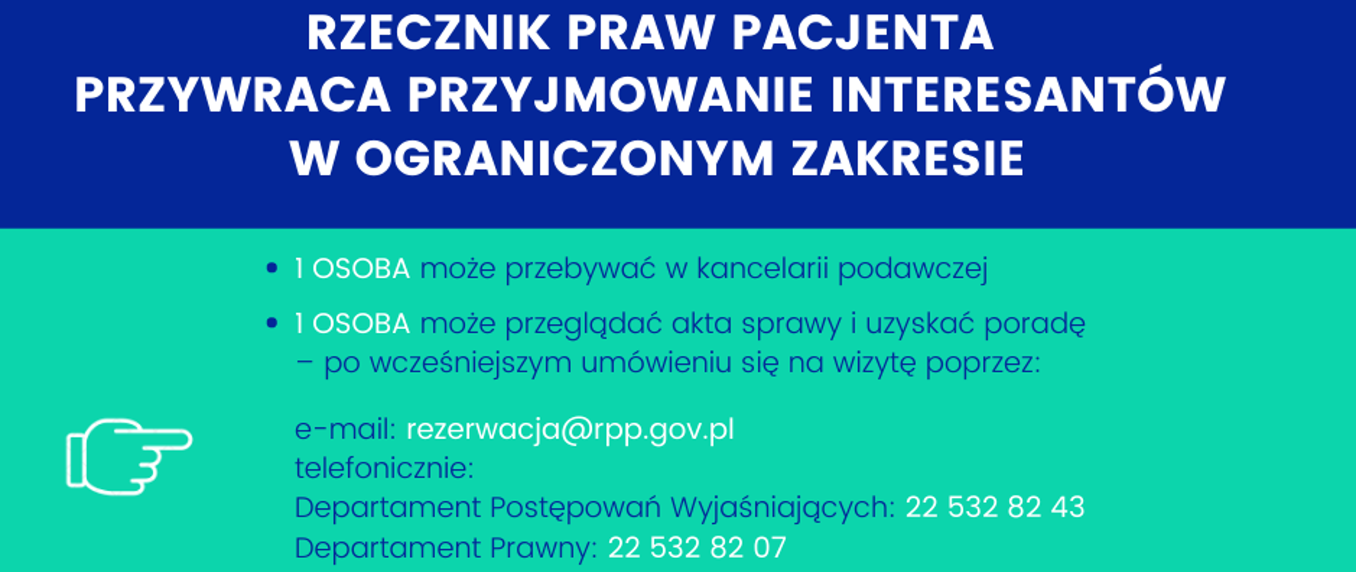 Z uwagi na bezpieczeństwo pacjentów oraz zagrożenie zakażenia koronawirusem covid-19, Rzecznik Praw Pacjenta przywraca przyjmowanie interesantów w siedzibie Biura w Warszawie przy ul. Młynarskiej 46, w ograniczonym zakresie: