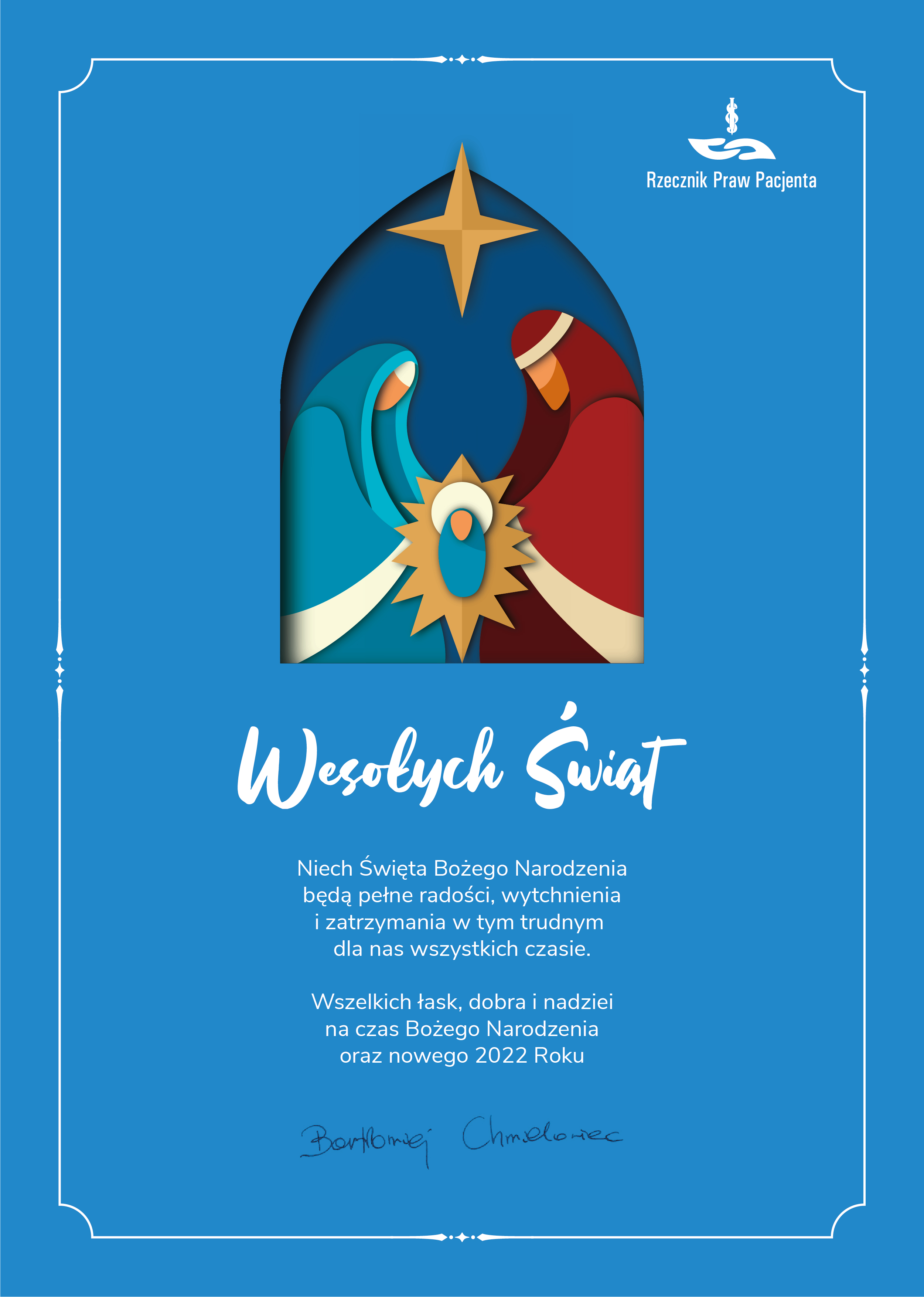 Zdrowych, spokojnych Świąt Bożego Narodzenia, spędzonych w gronie bliskich oraz szczęścia w nadchodzącym roku życzą Bartłomiej Chmielowiec i pracownicy Rzecznika Praw Pacjenta.