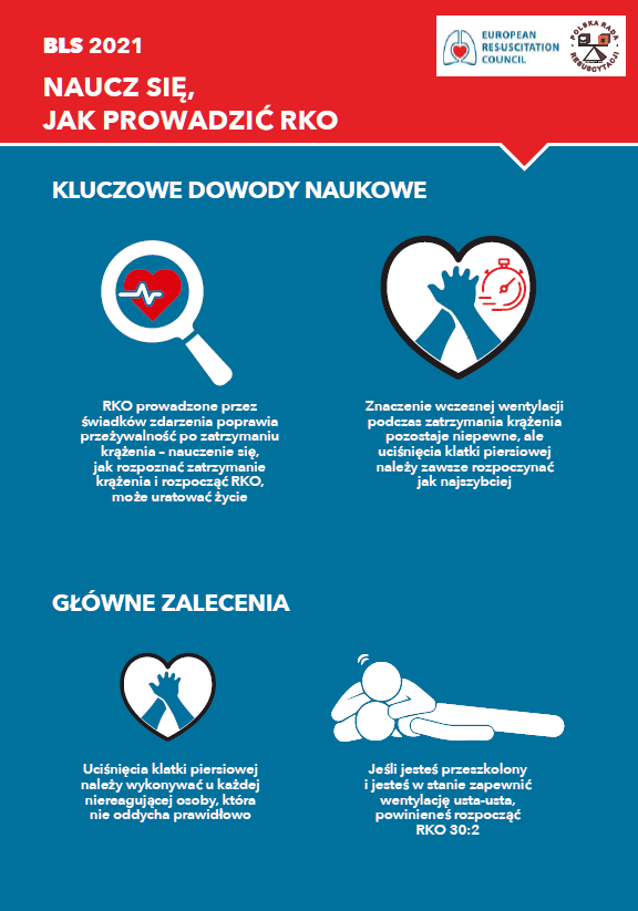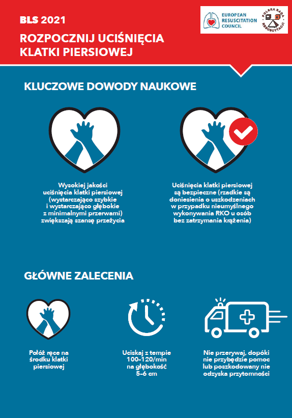 Powyższe zasady doskonale obrazują i uzupełniają opublikowane przez Polską Radę Resuscytacji w swoich wytycznych grafiki. Odsyłamy do źródła i zachęcamy do lektury całości lub chociaż rozdziału 4. Podstawowe zabiegi resuscytacyjne, który można znaleźć pod poniższym linkiem lub wśród zamieszczonych pod opracowaniem materiałów, są tam także infografiki ukazujące poszczególne etapy podstawowych zabiegów ratujących życie w stanie nagłego zatrzymania krążenia w różnych grupach wiekowych.