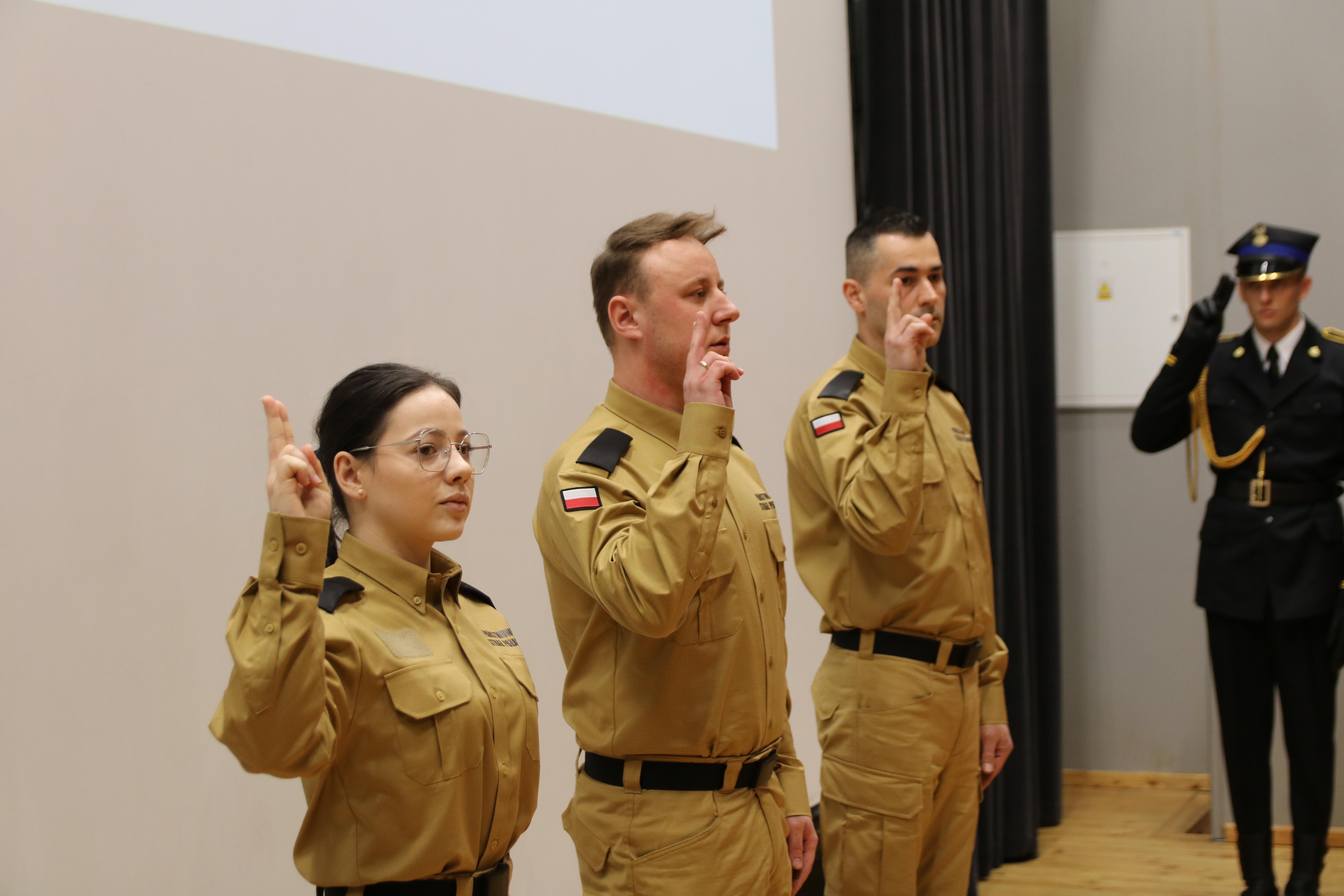 W chwili, gdy z strażak z mariackiej wieży oznajmiał całemu światu nadejście południa 11 kwietnia 2024 roku, w szkolnej auli troje ubranych w służbowe mundury ludzi oświadczało przed sztandarem, komendantem i przybyłymi na uroczystość gośćmi, że chcą pełnić służbę w Państwowej Straży Pożarnej. Pomimo tego, że część z nich zna realia naszej formacji, bo pracując na etatach cywilnych jest w Szkole od lat, to wypowiadając z powagą i należną estymą słowa strażackiego ślubowania z każdą chwilą wszyscy urzeczywistniali swoje marzenia i dochodziło do nich, że właśnie praca zamienia się w służbę, zaangażowanie w poświęcenie, a ryzyko w odwagę.
