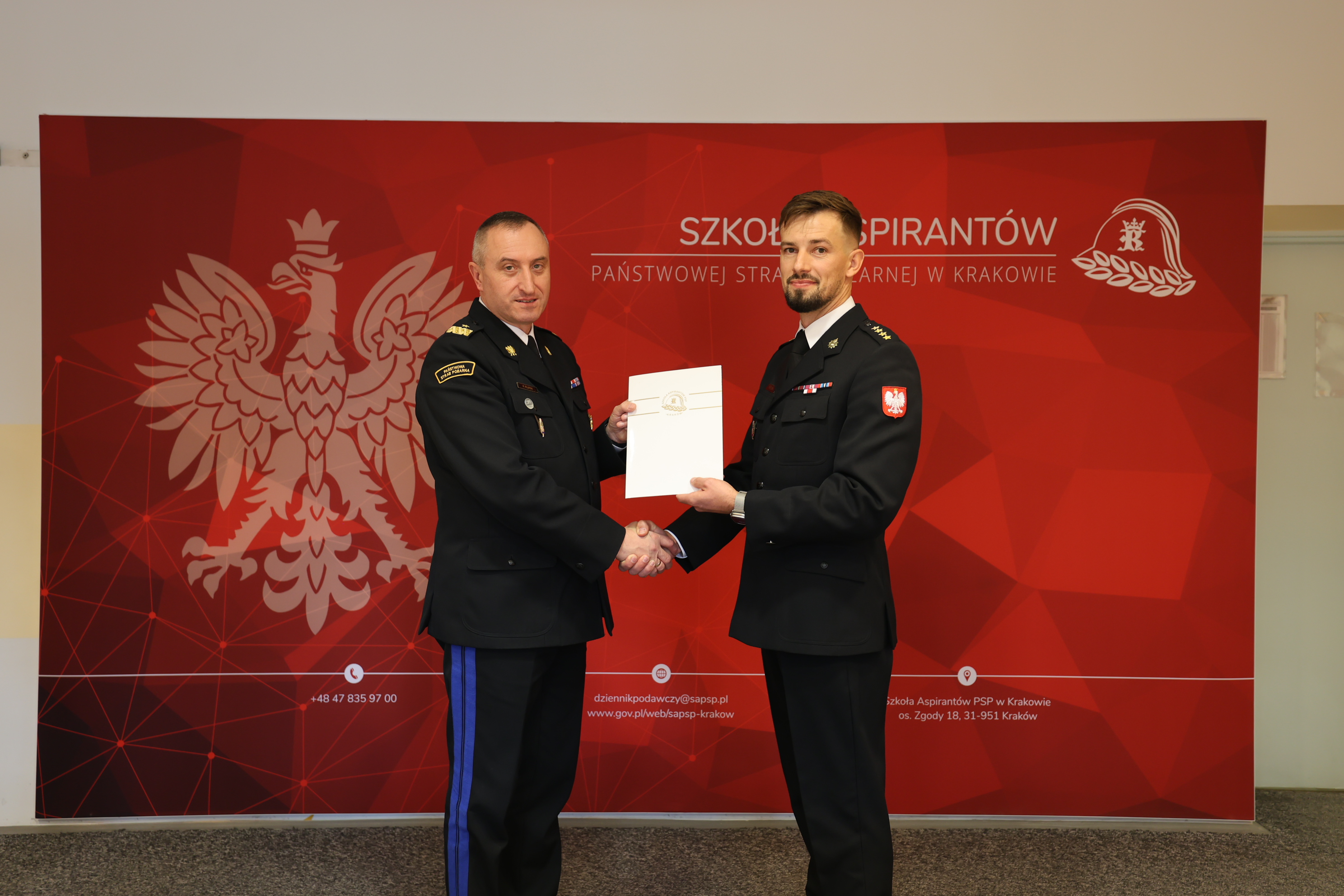 W dniu dzisiejszym Komendant Szkoły Aspirantów PSP w Krakowie, nadbryg. Piotr Filipek, w obecności swoich Zastępców, dokonał uroczystego powierzenia pełnienia obowiązków Naczelnika Wydziału Szkoleń Specjalistycznych w Nowym Sączu. Funkcję tę objął st. kpt. Wojciech Broda.