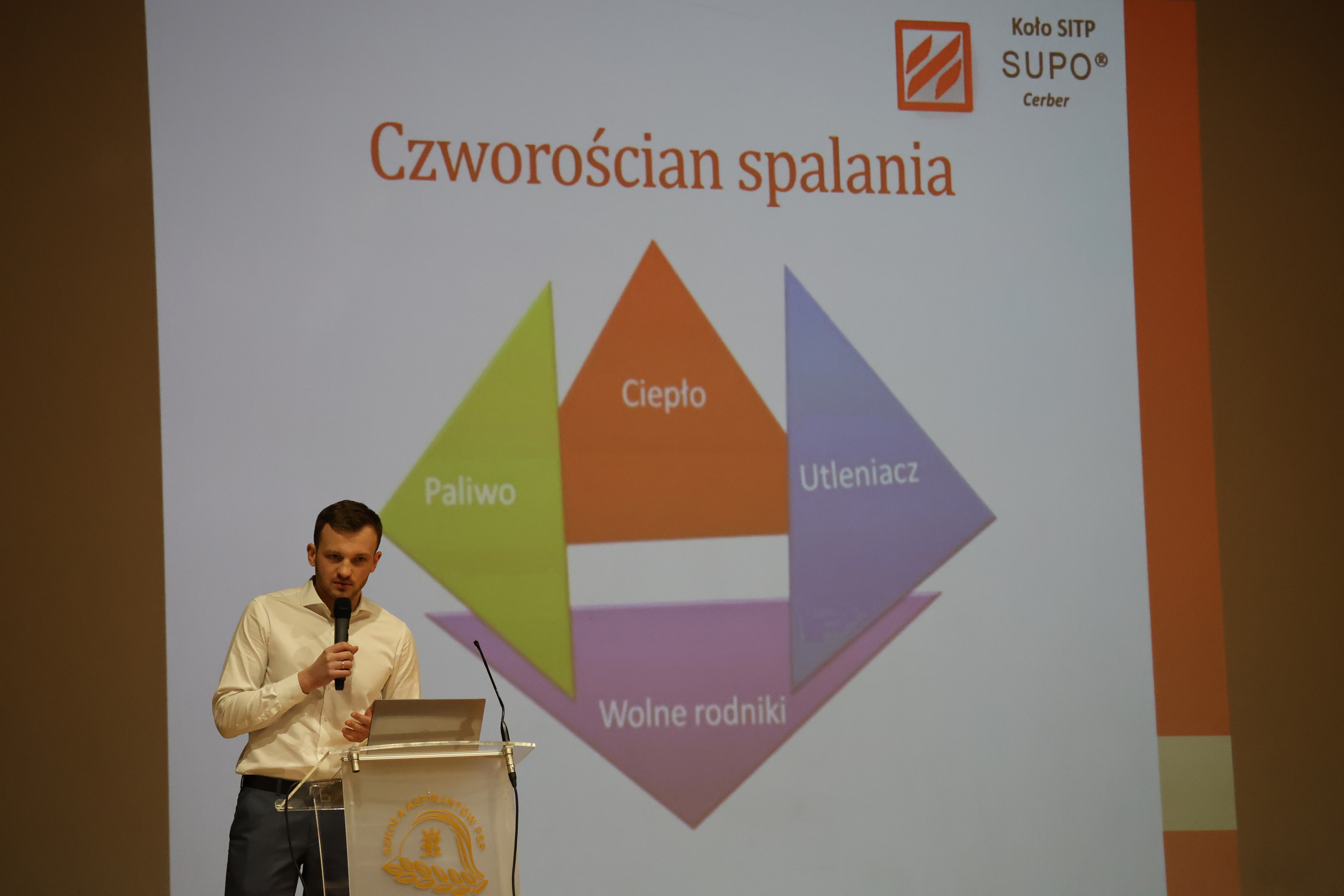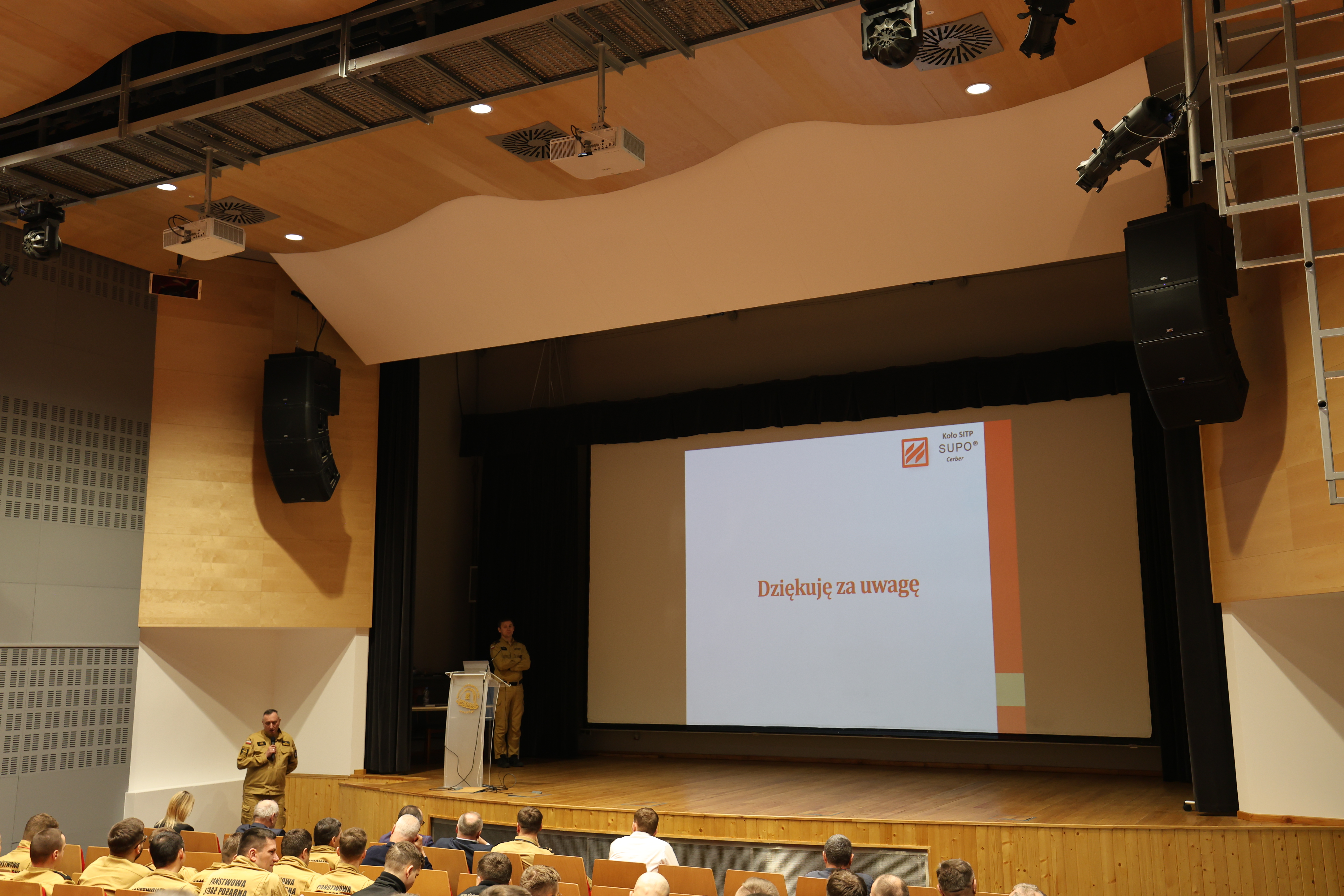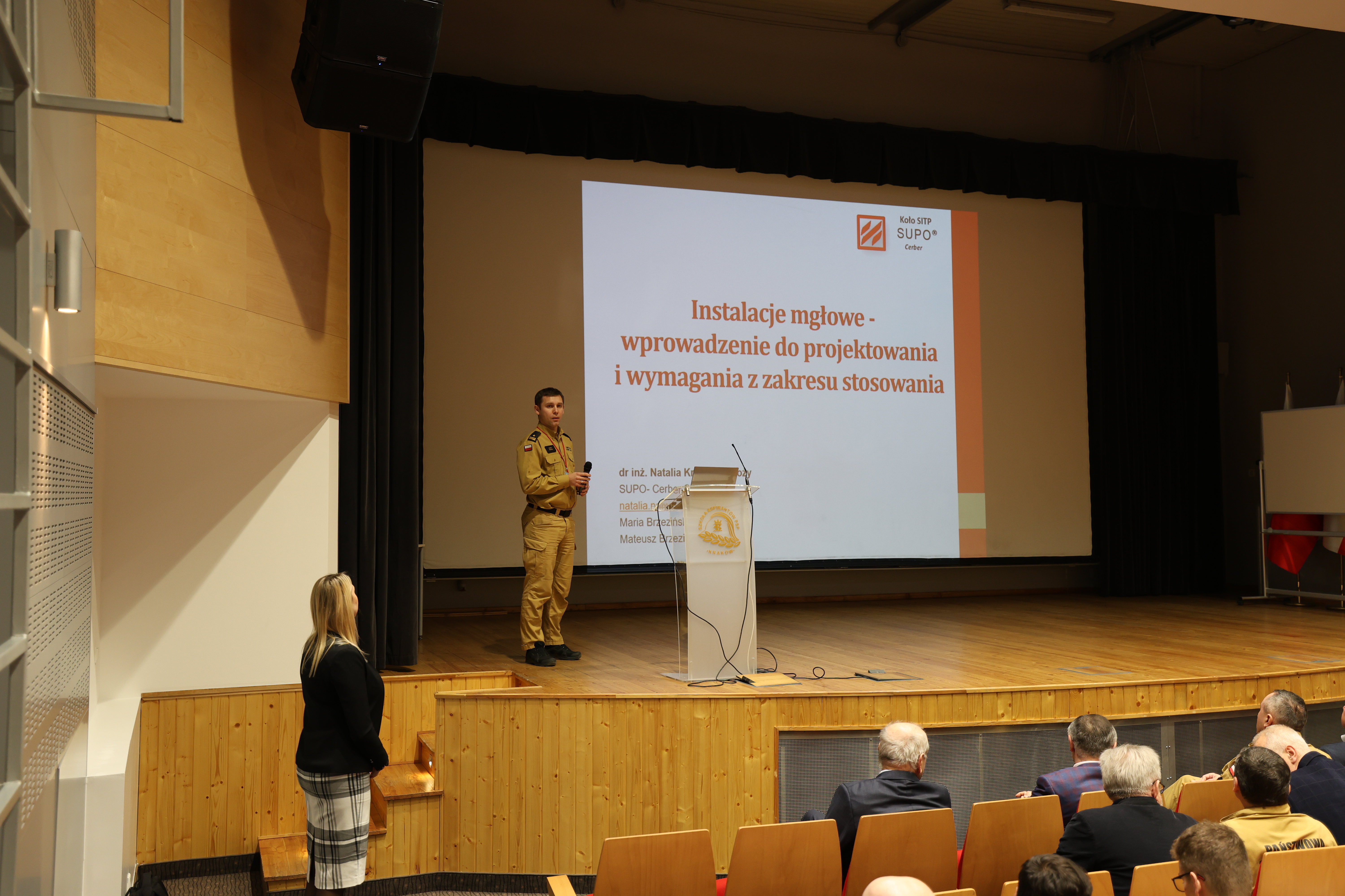Swoją wiedzą i doświadczeniem w tym obszarze podzielili się przedstawiciele koła SITP przy SUPO-Cerber, którzy od lat zajmują się tematyką stałych urządzeń gaśniczych. Zaprezentowali m. in. charakterystykę oraz możliwości zastosowania mgły wodnej w obiektach zabytkowych, zakładach recyklingu odpadów oraz w przypadku gaszenia baterii litowo-jonowych.