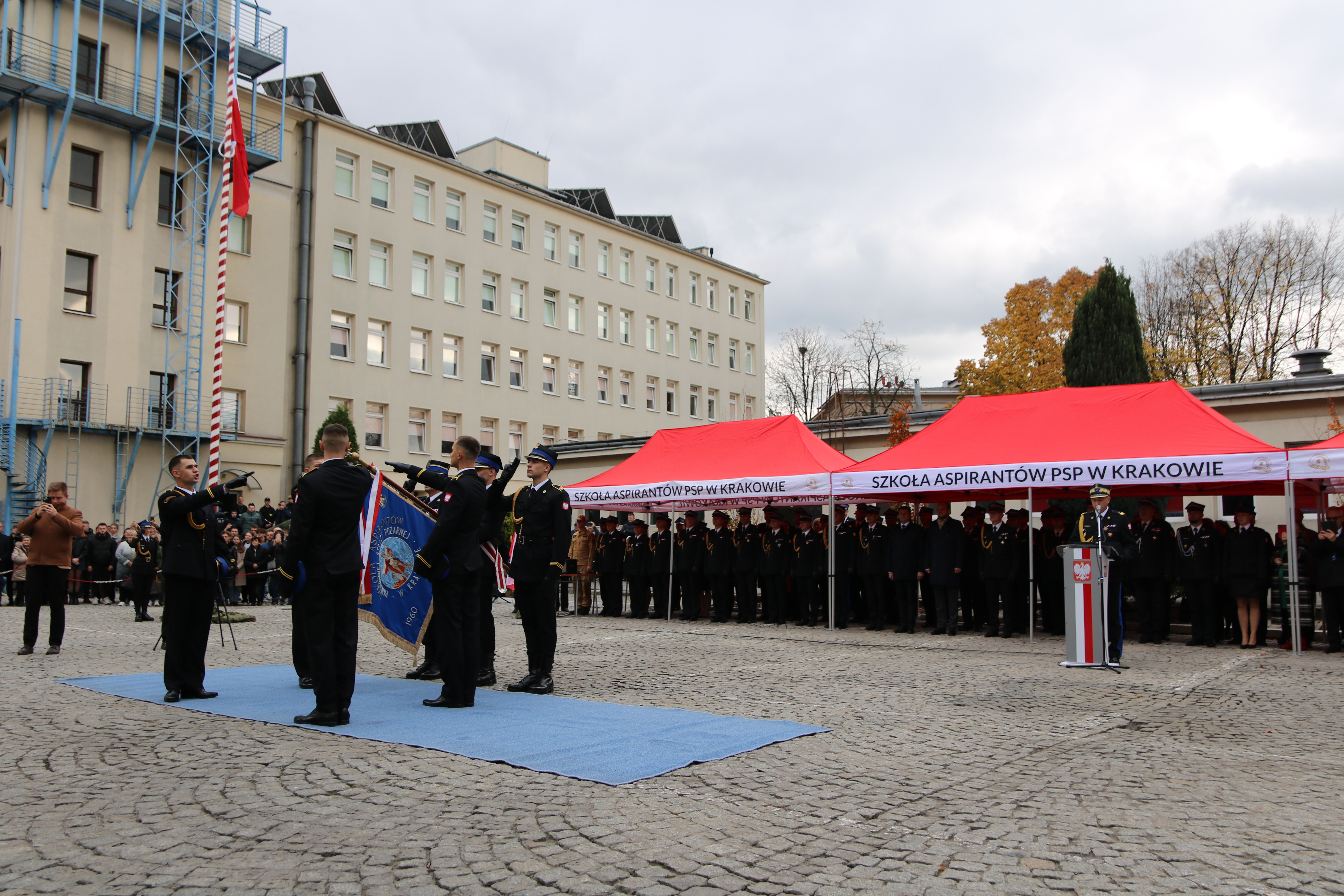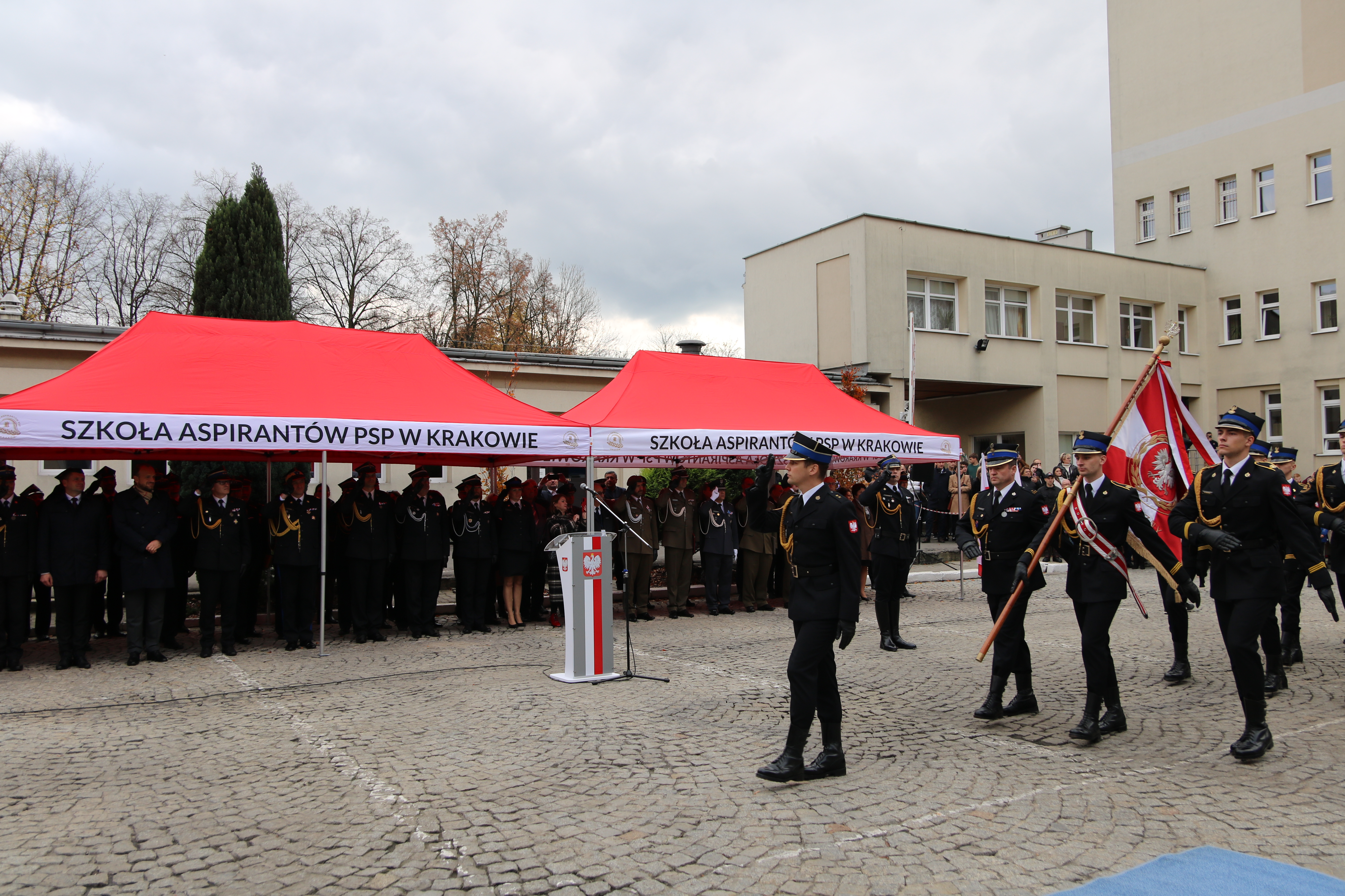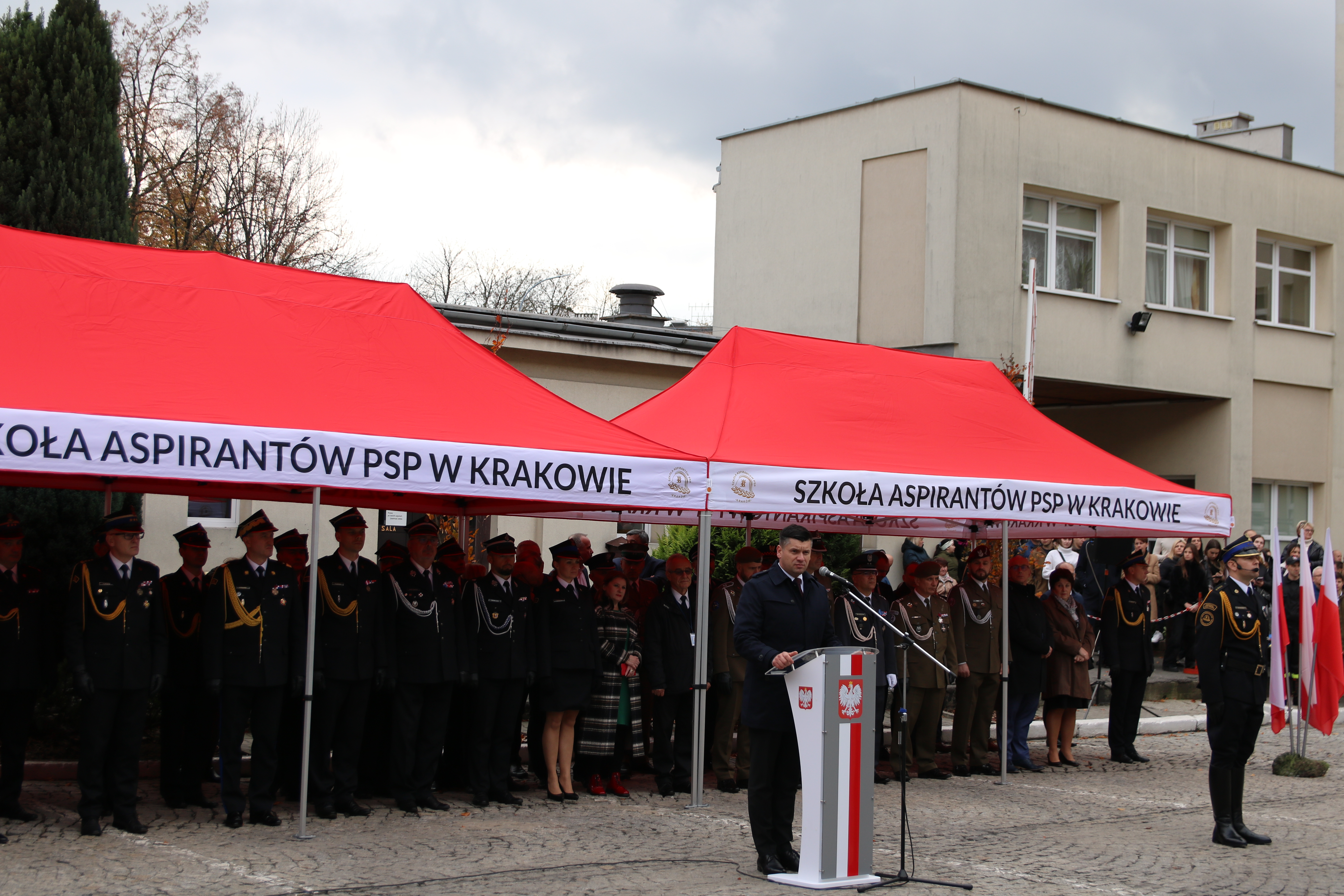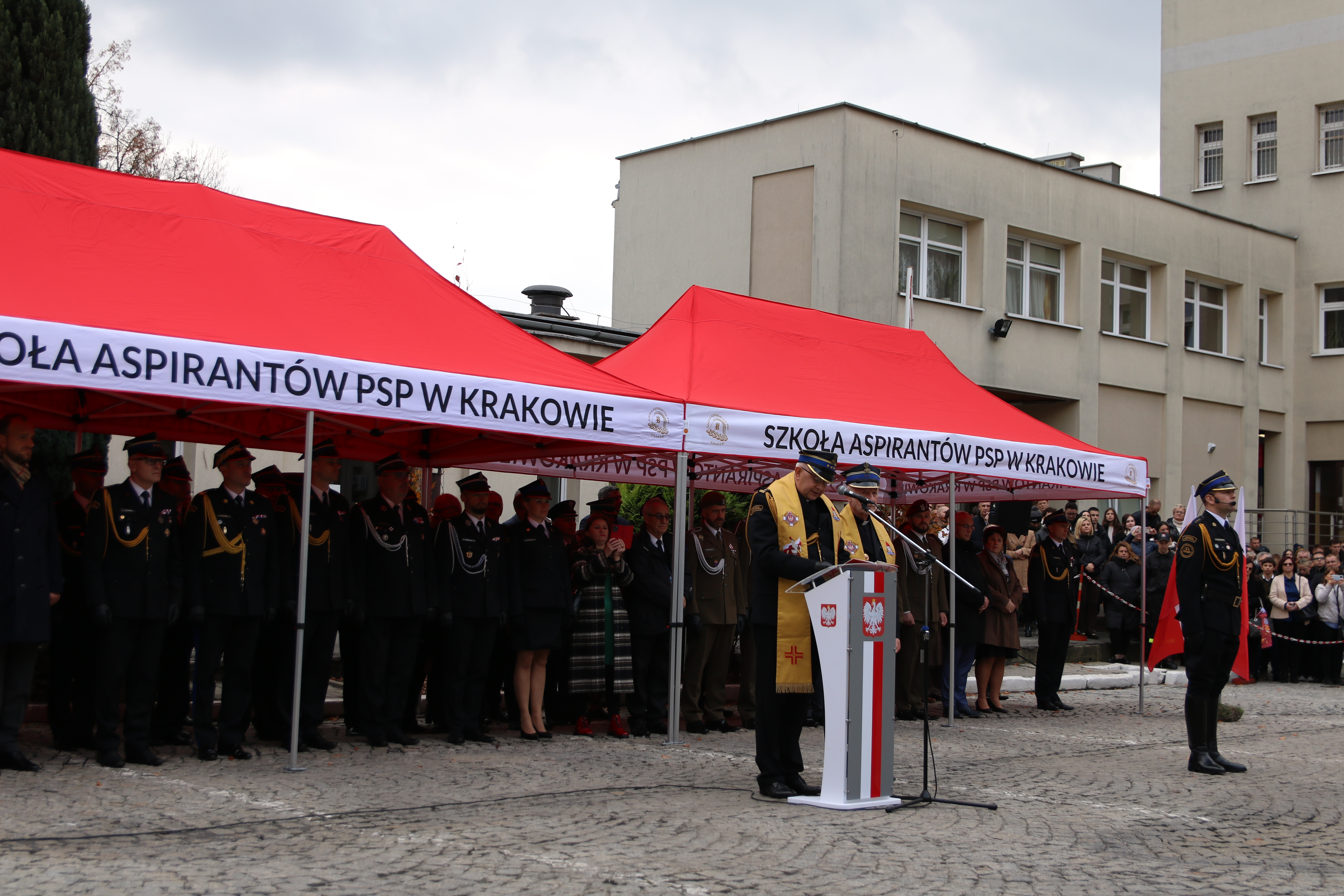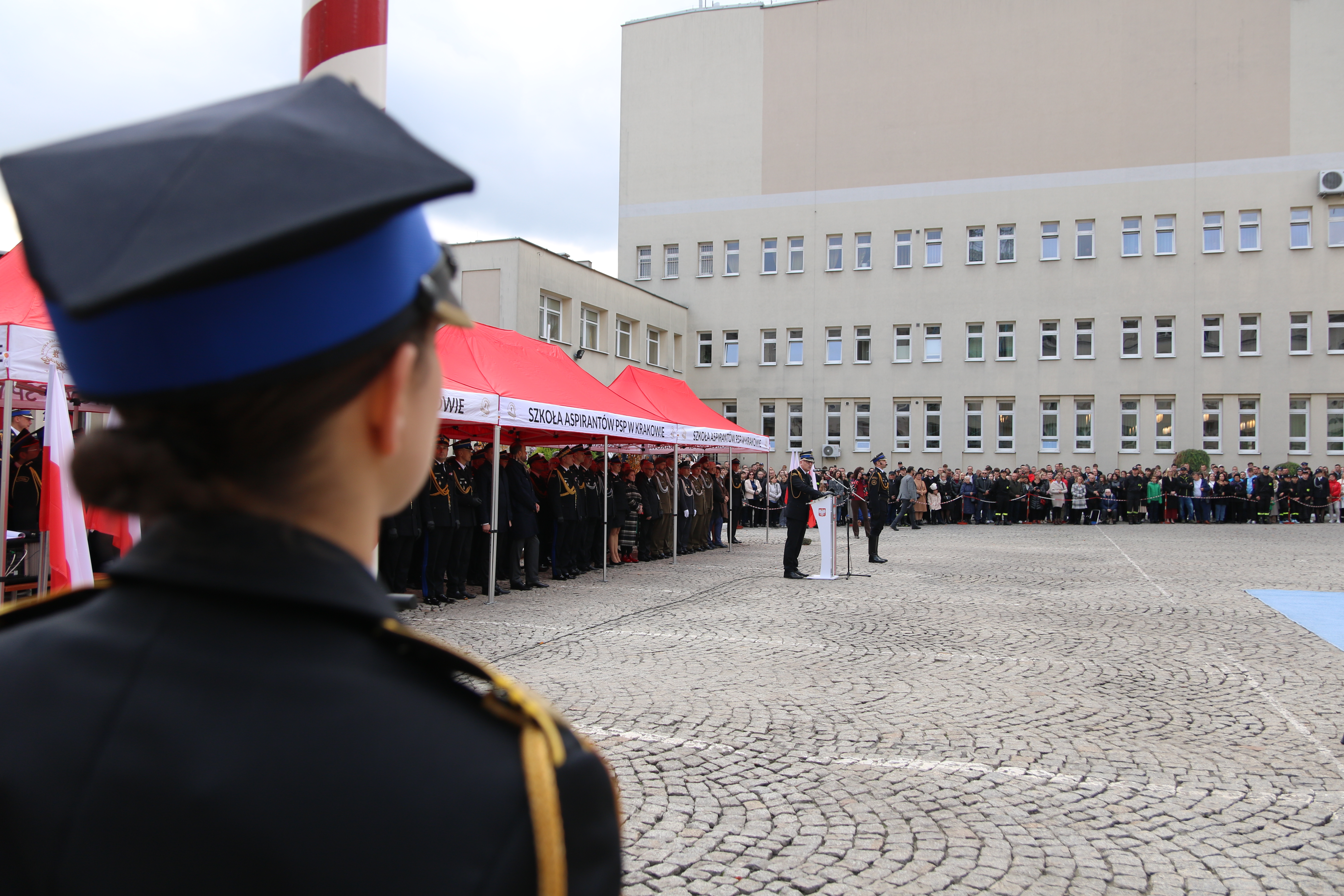 Okolicznościowe przemówienia Komendanta Szkoły Aspirantów PSP w Krakowie nadbryg. Piotra Filipka i Zastępcy Komendanta Głównego PSP st.bryg. Pawła Frysztaka obfitowały w słowa pełne uznania i wdzięczności, podziękowań i życzeń, także tych złożonych na ręce rodziców i opiekunów, którzy wychowali swoje dzieci w duchu patriotyzmu i troski o najwyższe wartości, którymi z pewnością jest dbanie o kraj oraz zdrowie i życie przebywających na jego terytorium ludzi, zwierząt i otaczającej nas przyrody.