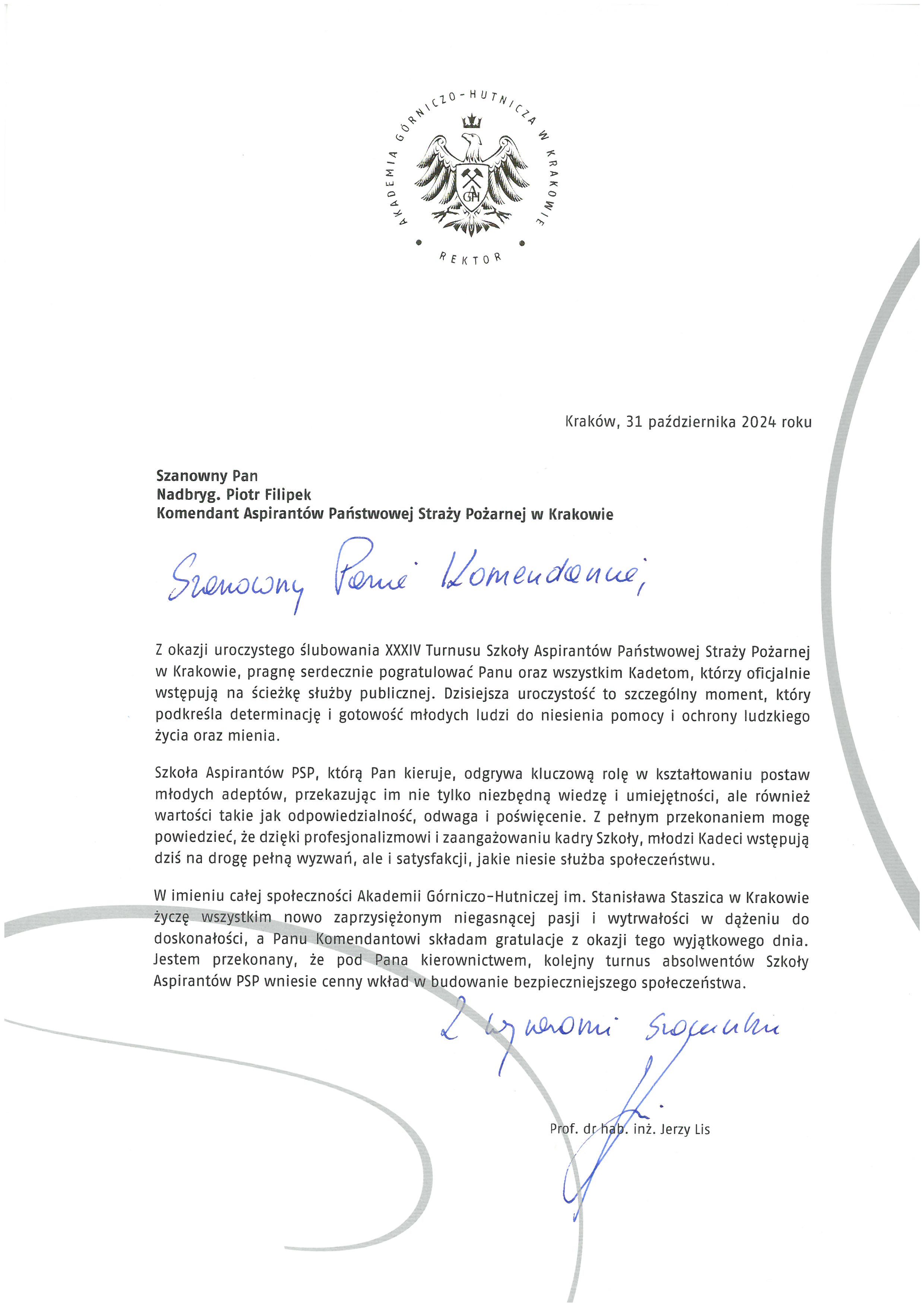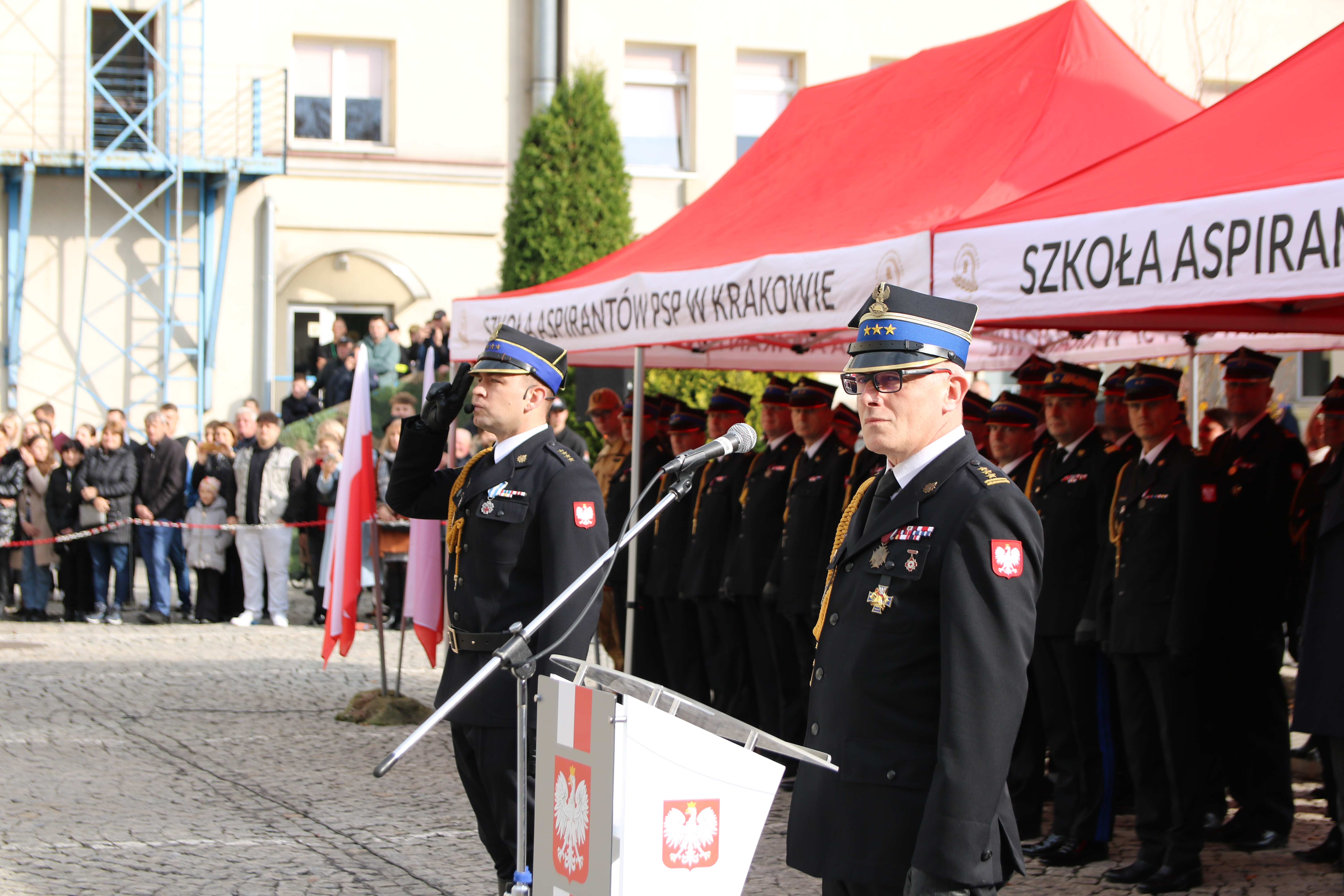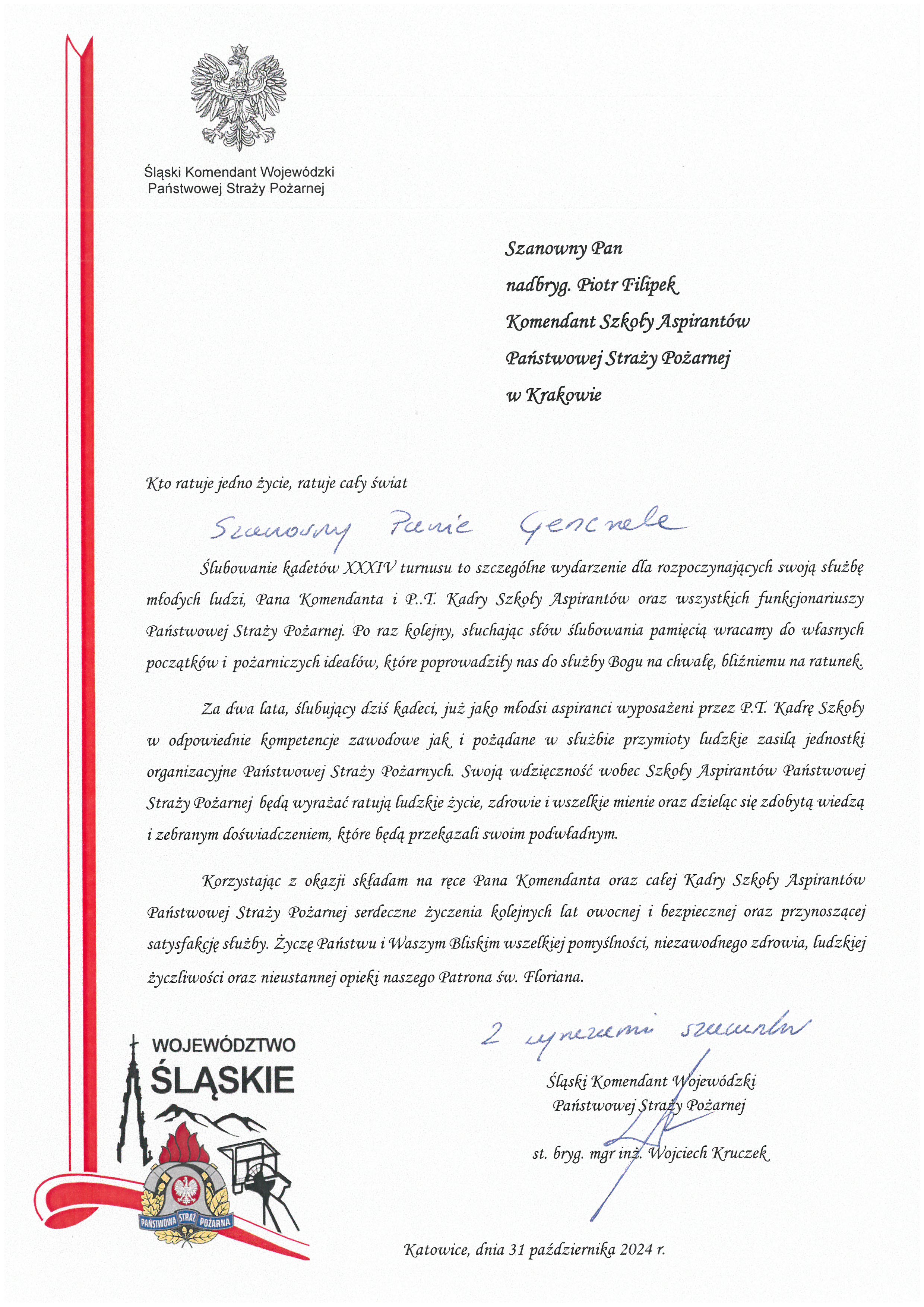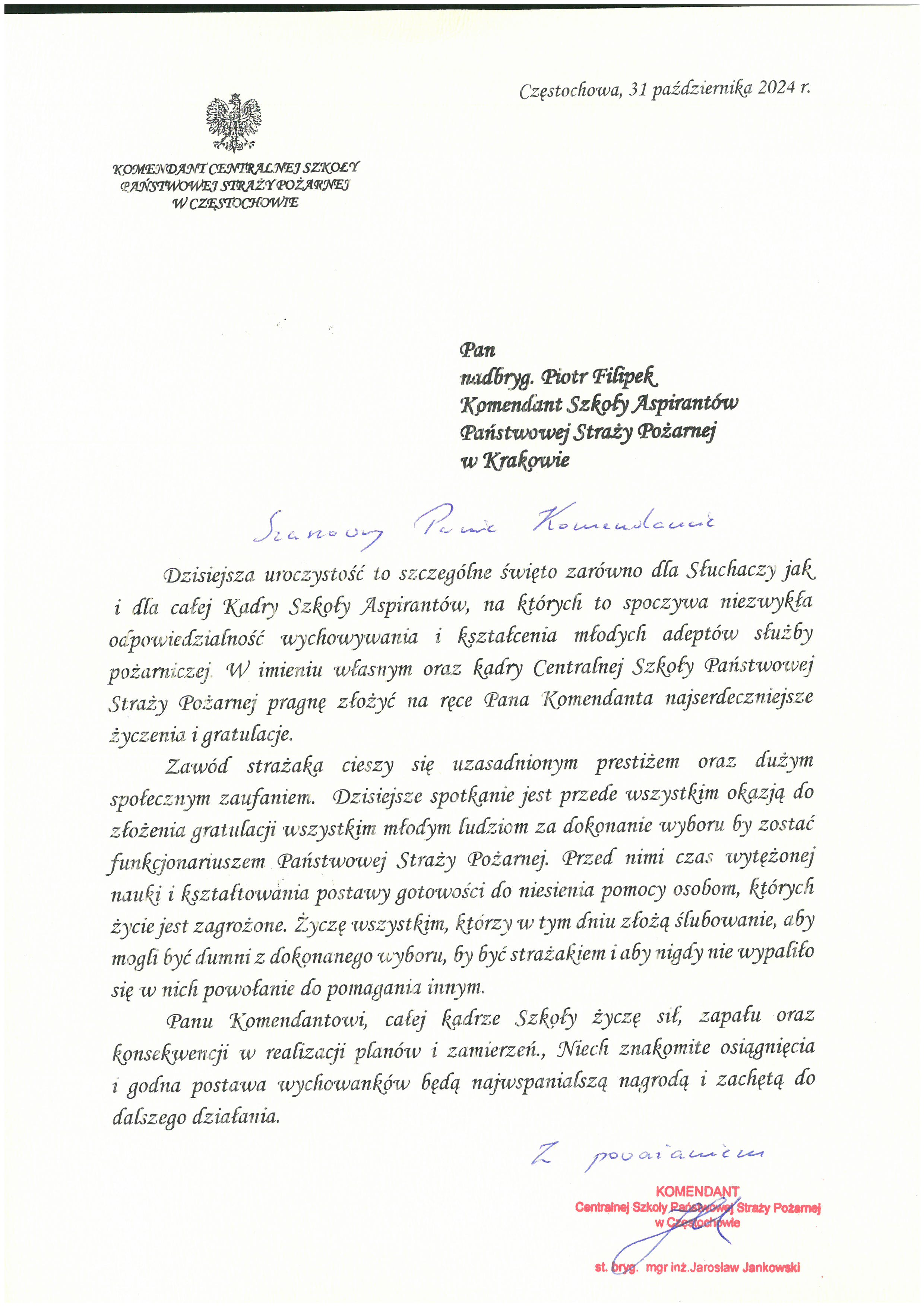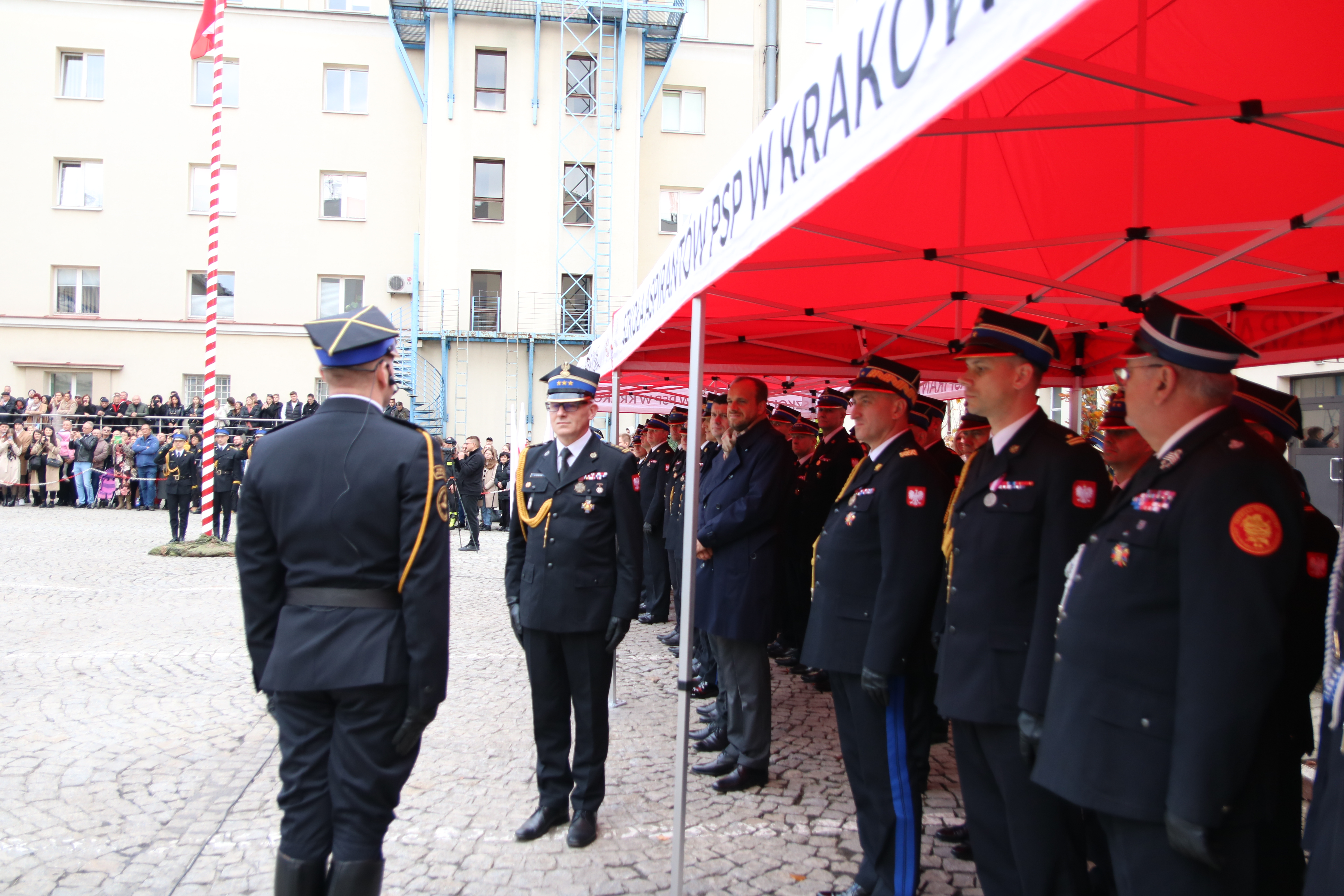 Okolicznościowe przemówienia Komendanta Szkoły Aspirantów PSP w Krakowie nadbryg. Piotra Filipka i Zastępcy Komendanta Głównego PSP st.bryg. Pawła Frysztaka obfitowały w słowa pełne uznania i wdzięczności, podziękowań i życzeń, także tych złożonych na ręce rodziców i opiekunów, którzy wychowali swoje dzieci w duchu patriotyzmu i troski o najwyższe wartości, którymi z pewnością jest dbanie o kraj oraz zdrowie i życie przebywających na jego terytorium ludzi, zwierząt i otaczającej nas przyrody.