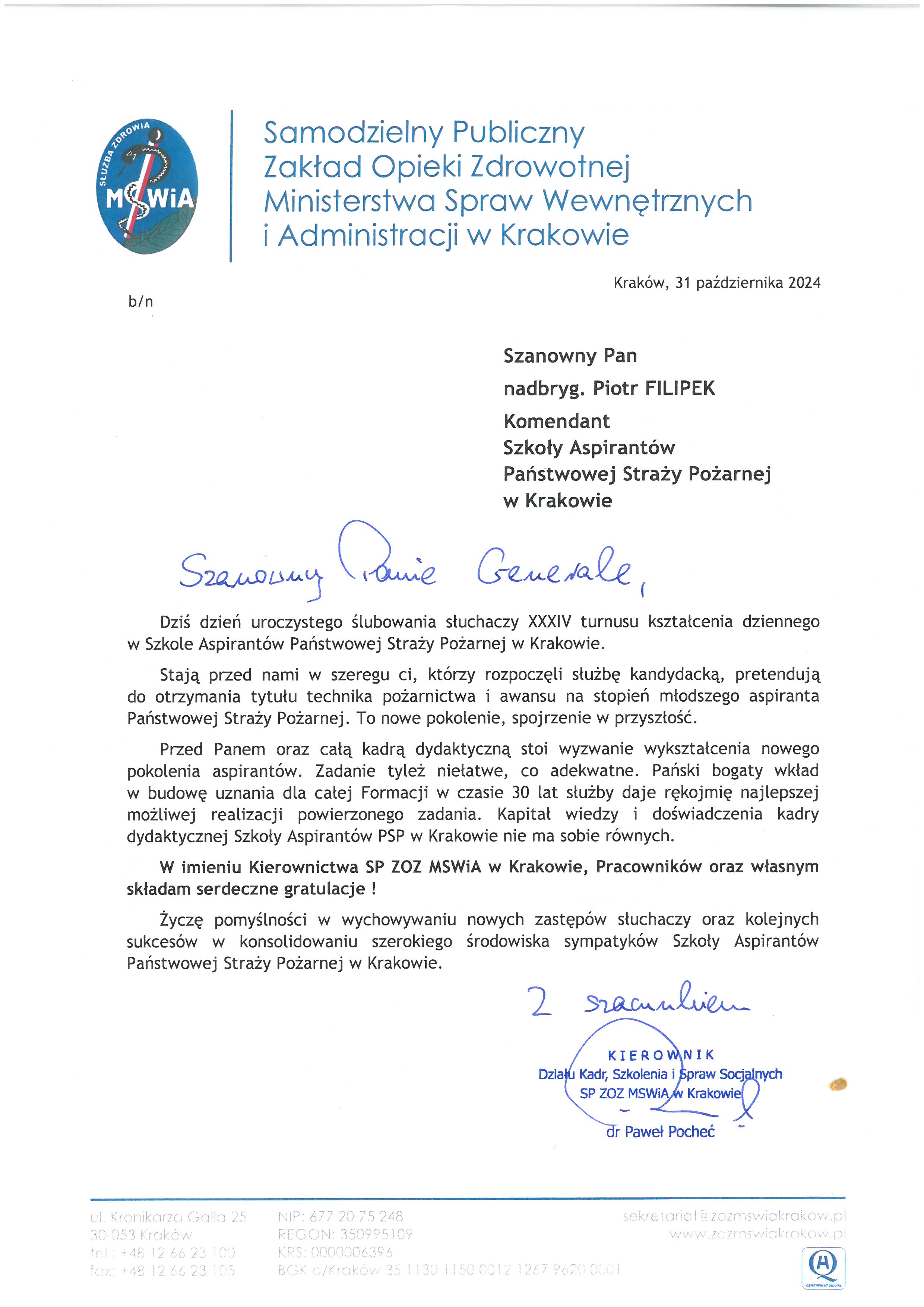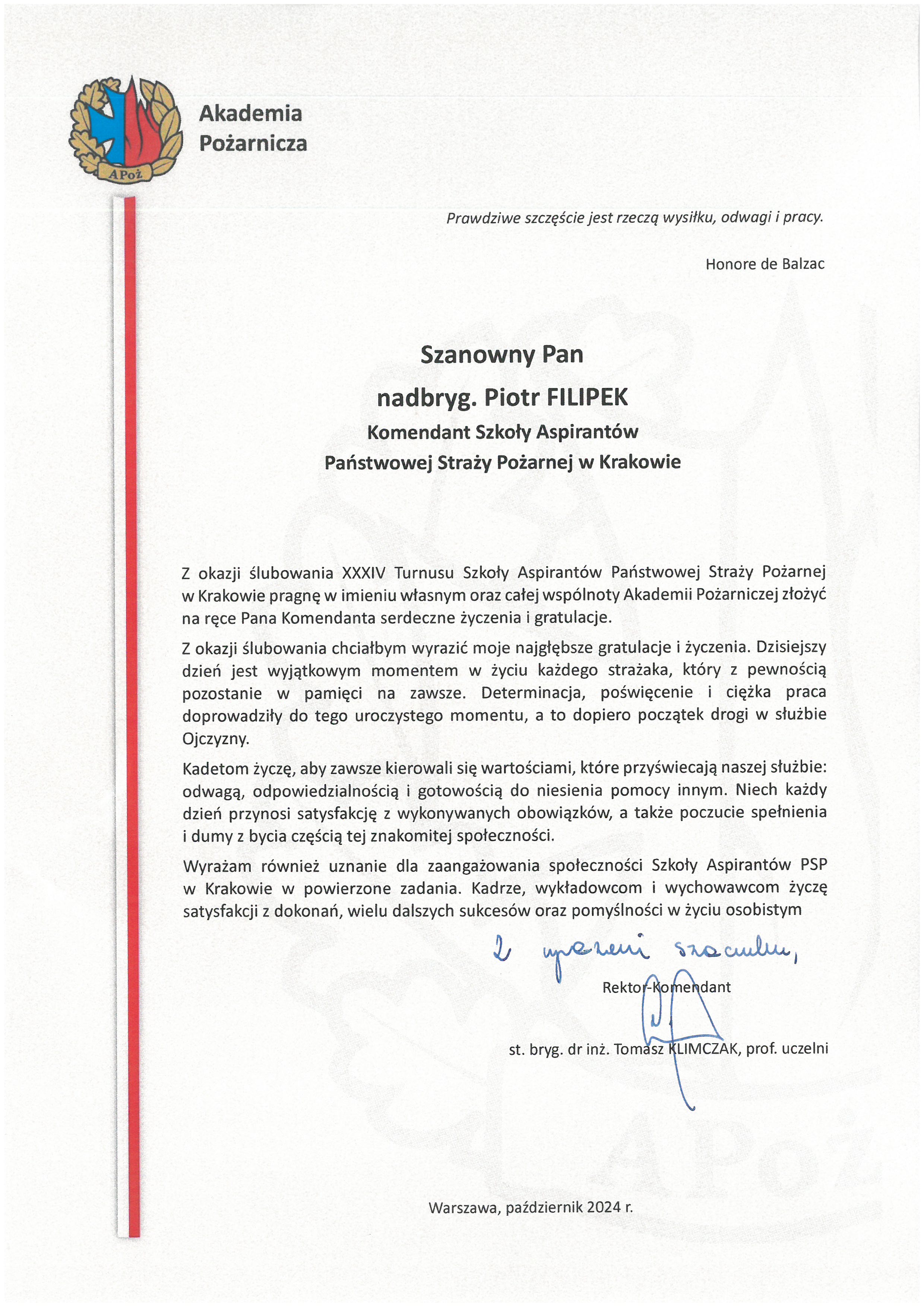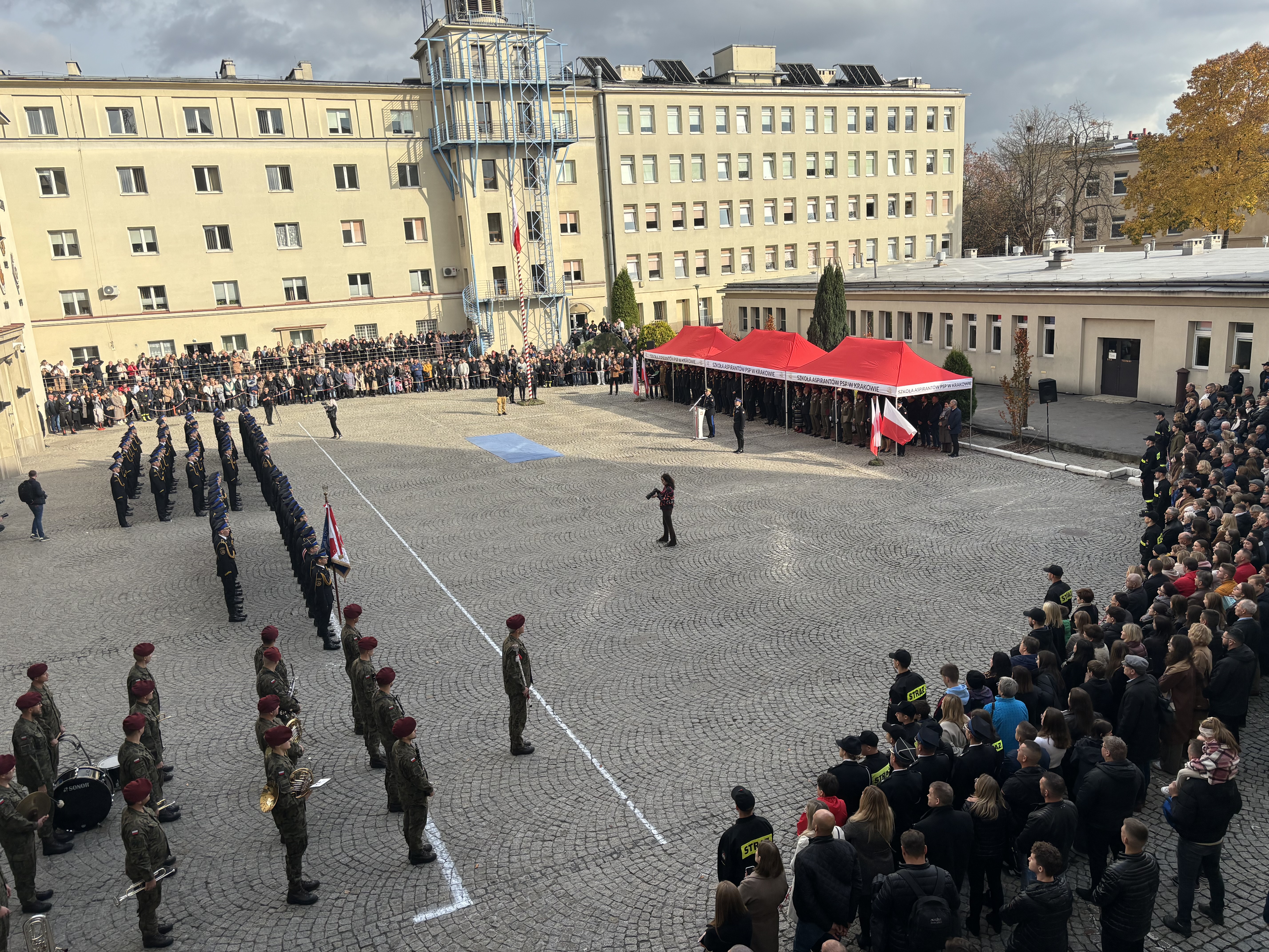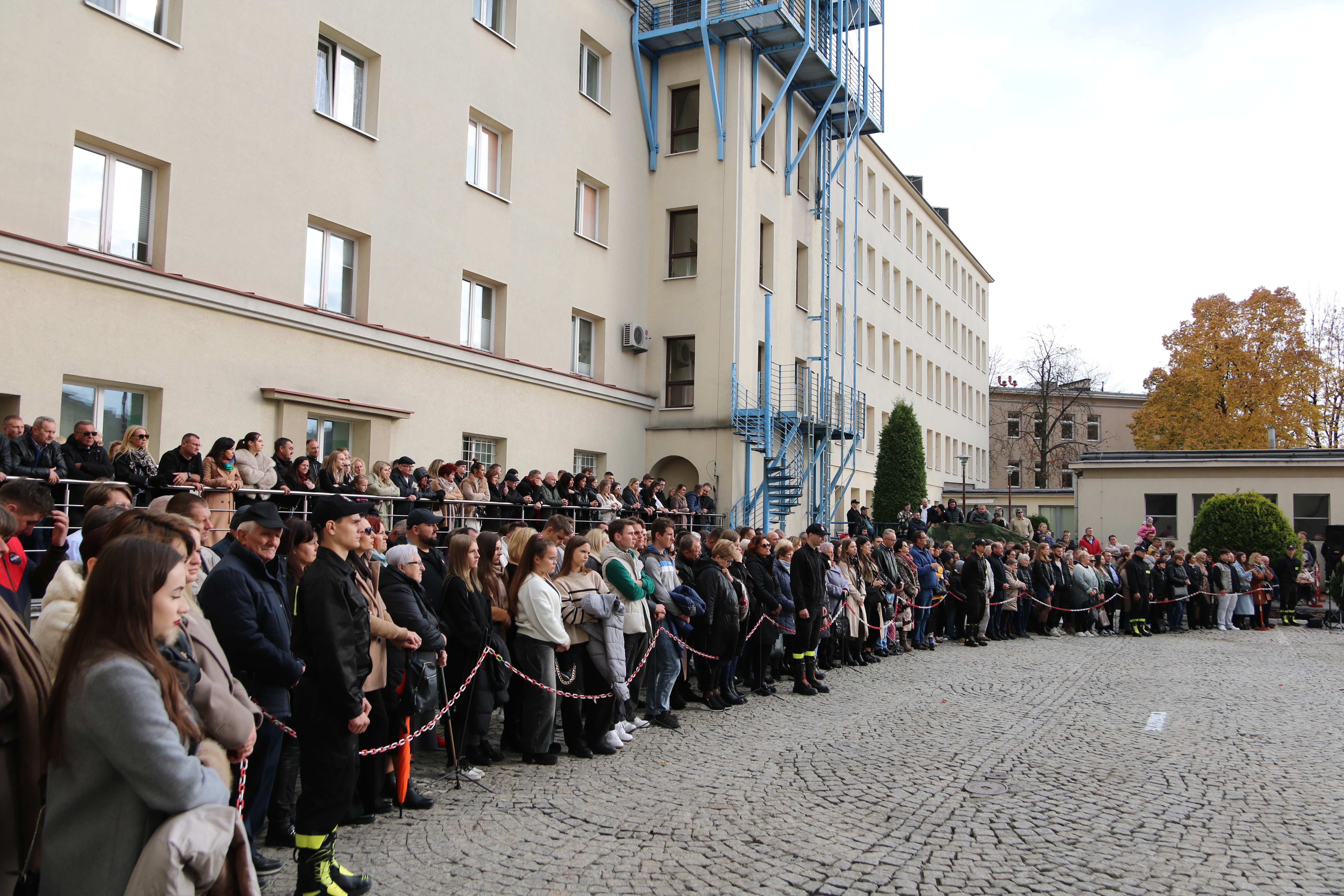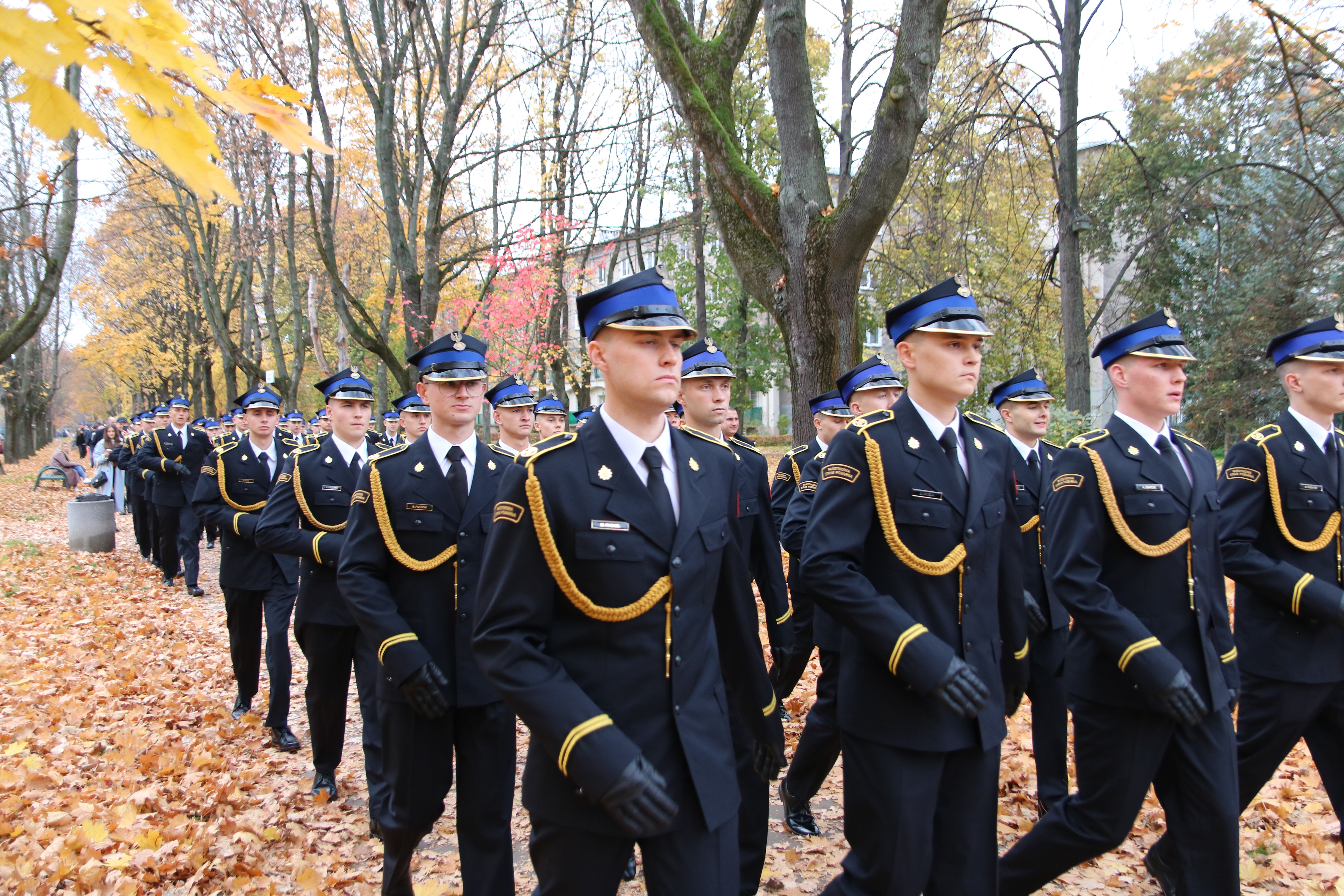 31 października 2024 roku, na mającym cechy dziedzińca, placu wewnętrznym Szkoły, w wyjściowych mundurach, z rumieńcami na twarzach, szybko bijącymi sercami i pełnymi energii oczyma, stanęło 58 słuchaczy XXXIV turnusu kształcenia dziennego, by w obecności zaproszonych gości, rodzin, bliskich, przyjaciół, starszych koleżanek i kolegów, Zastępcy Komendanta Głównego PSP st.bryg. Pawła Frysztaka, przełożonych, kadry wychowawczej i dydaktycznej złożyć ślubowanie funkcjonariusza Państwowej Straży Pożarnej. Celebrowanie tak ważnej chwili w przebiegu służby każdego z nas, nie jest ani dziełem przypadku, ani przerostem formy nad treścią, bo czy może być coś ważniejszego i jednocześnie pięknego, jak zadeklarowanie, że jest się gotowym do bycia ofiarnym i mężnym, a ratując drugiego człowieka narażać samego siebie?