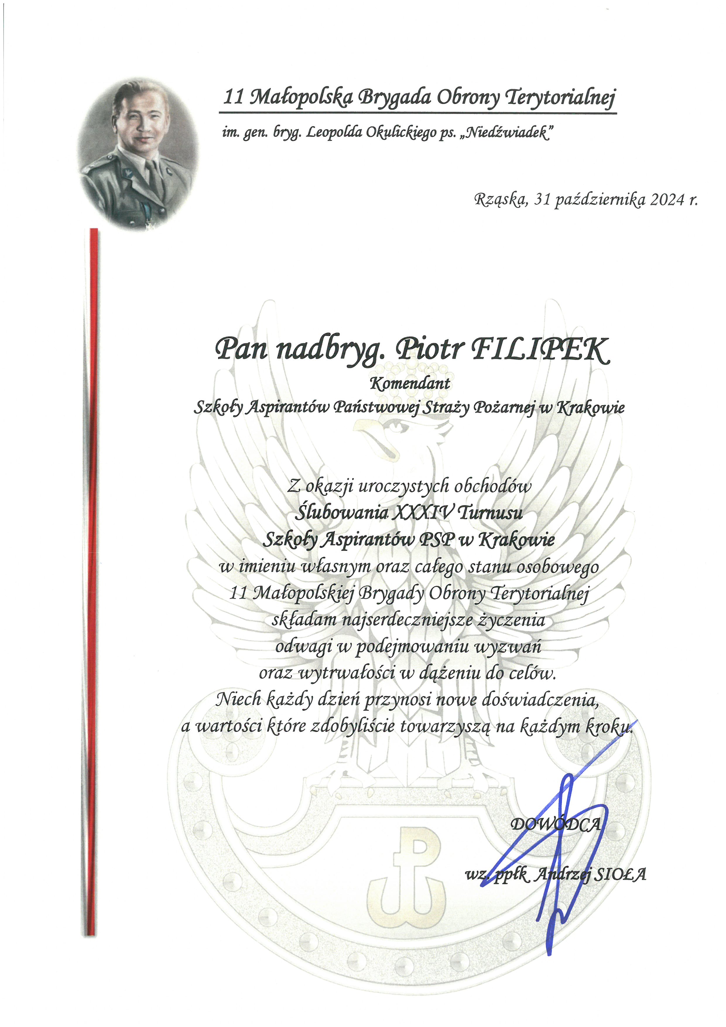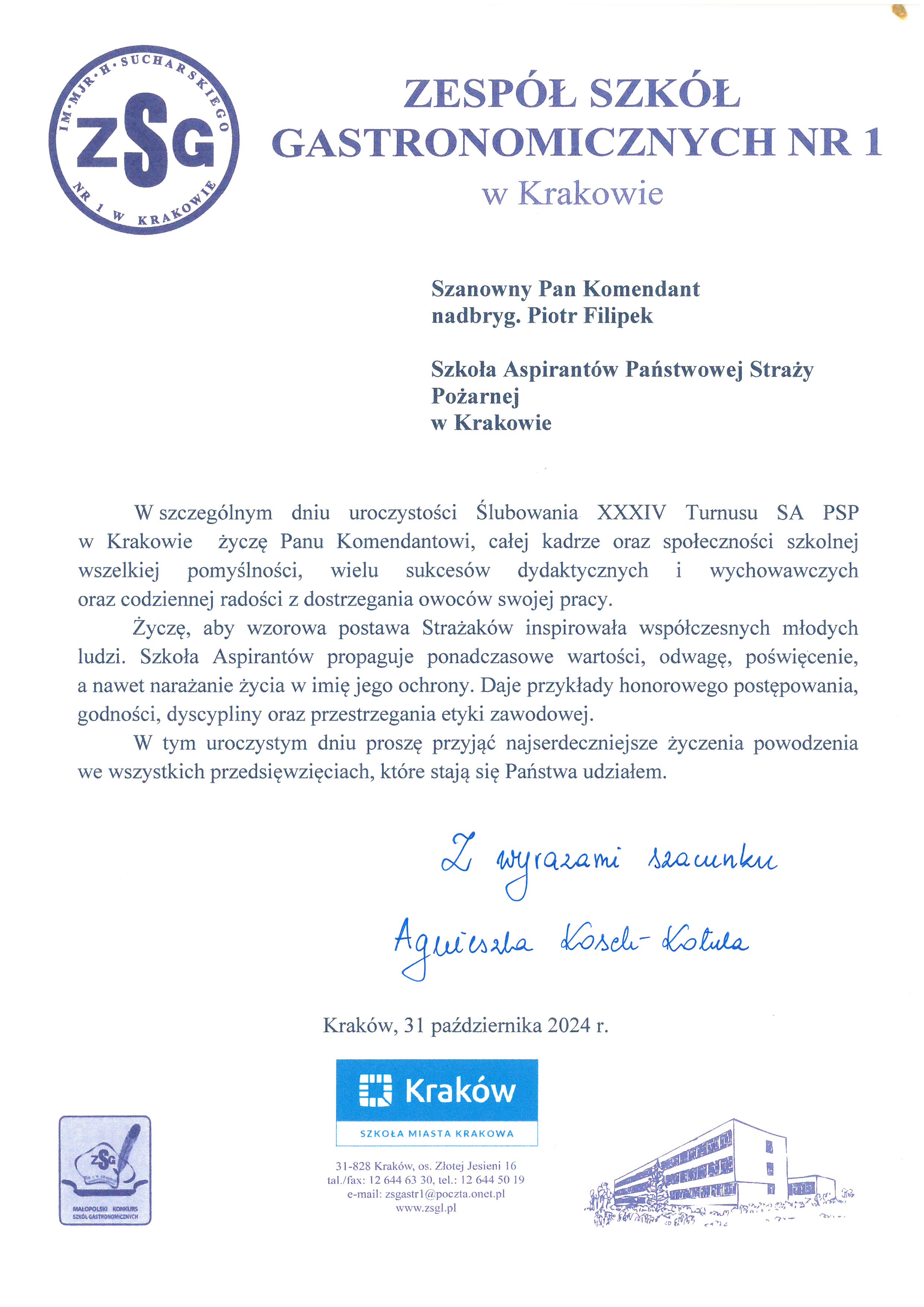 Wszystkim bohaterom dzisiejszego święta życzymy spełnienia, nie tylko edukacyjnych i zawodowych marzeń. Dziękujemy, że w dobie koncentrowania się znacznej części społeczeństwa jedynie na własnych potrzebach, zdecydowaliście się podjąć służbę. To zasługuje na ogromny szacunek i uznanie, który każdy z Was zakładając strażacki mundur dostaje niczym kredyt. Tylko od Was zależy, w jaki sposób napiszecie dalszą historię swojego życia i naszej formacji.