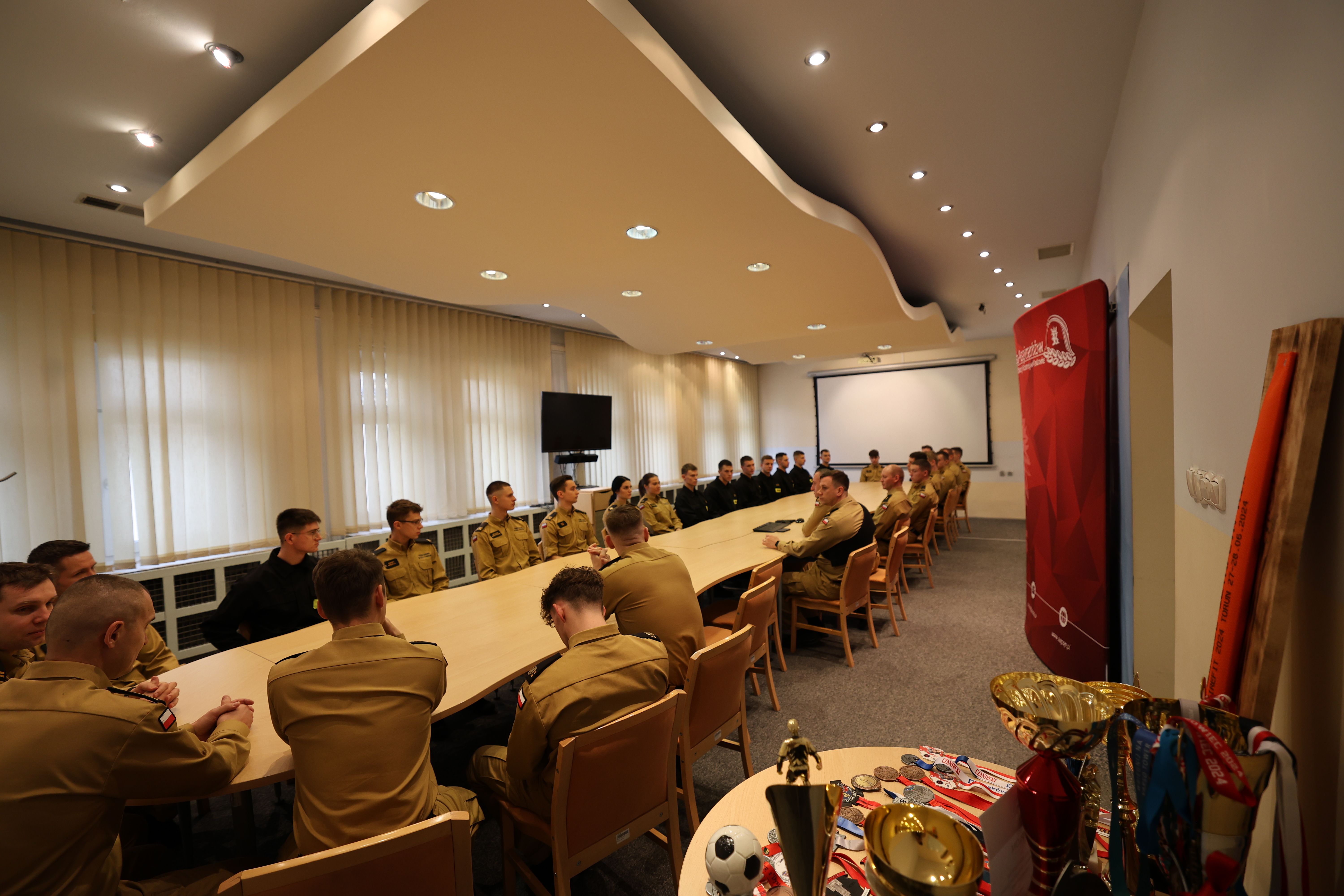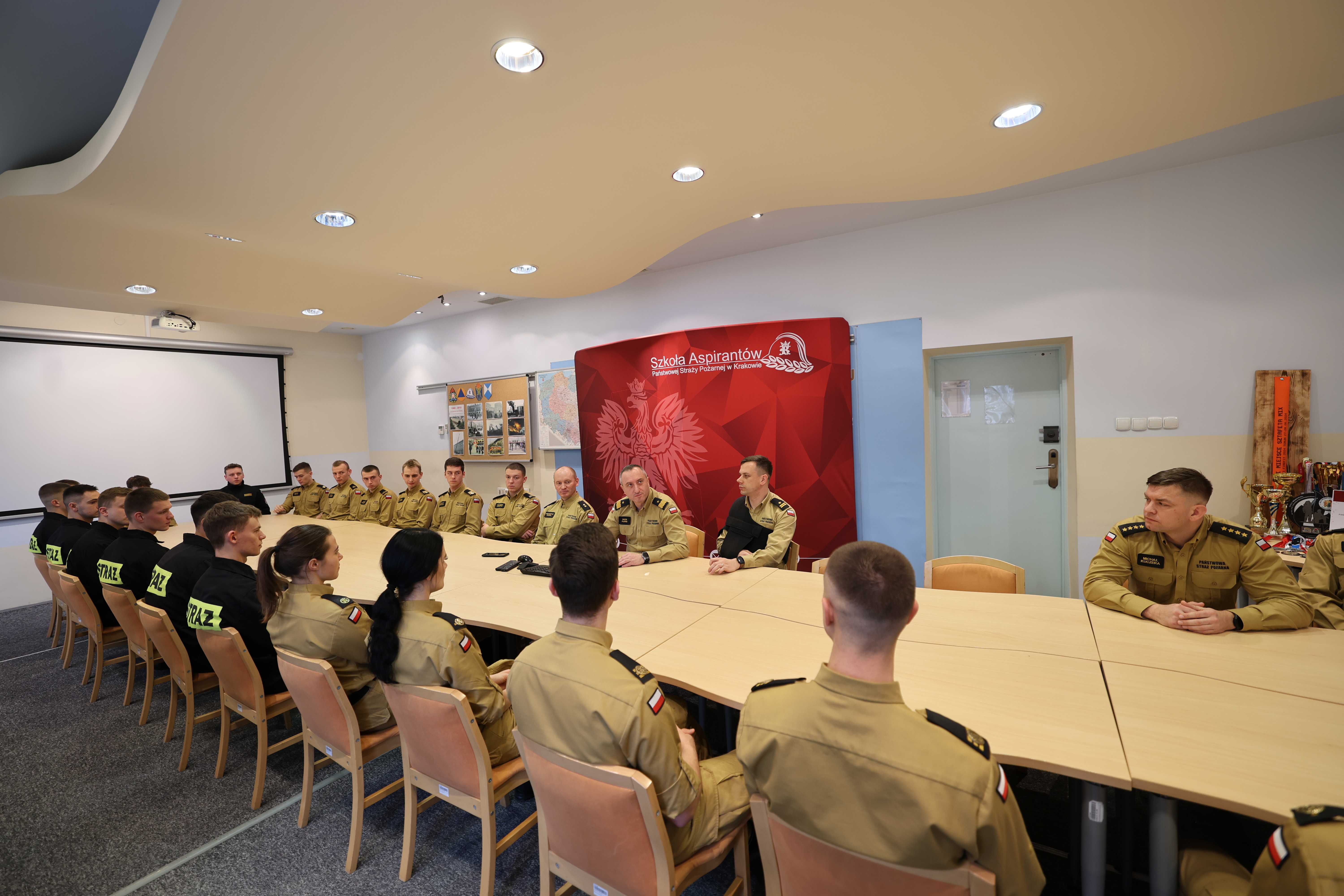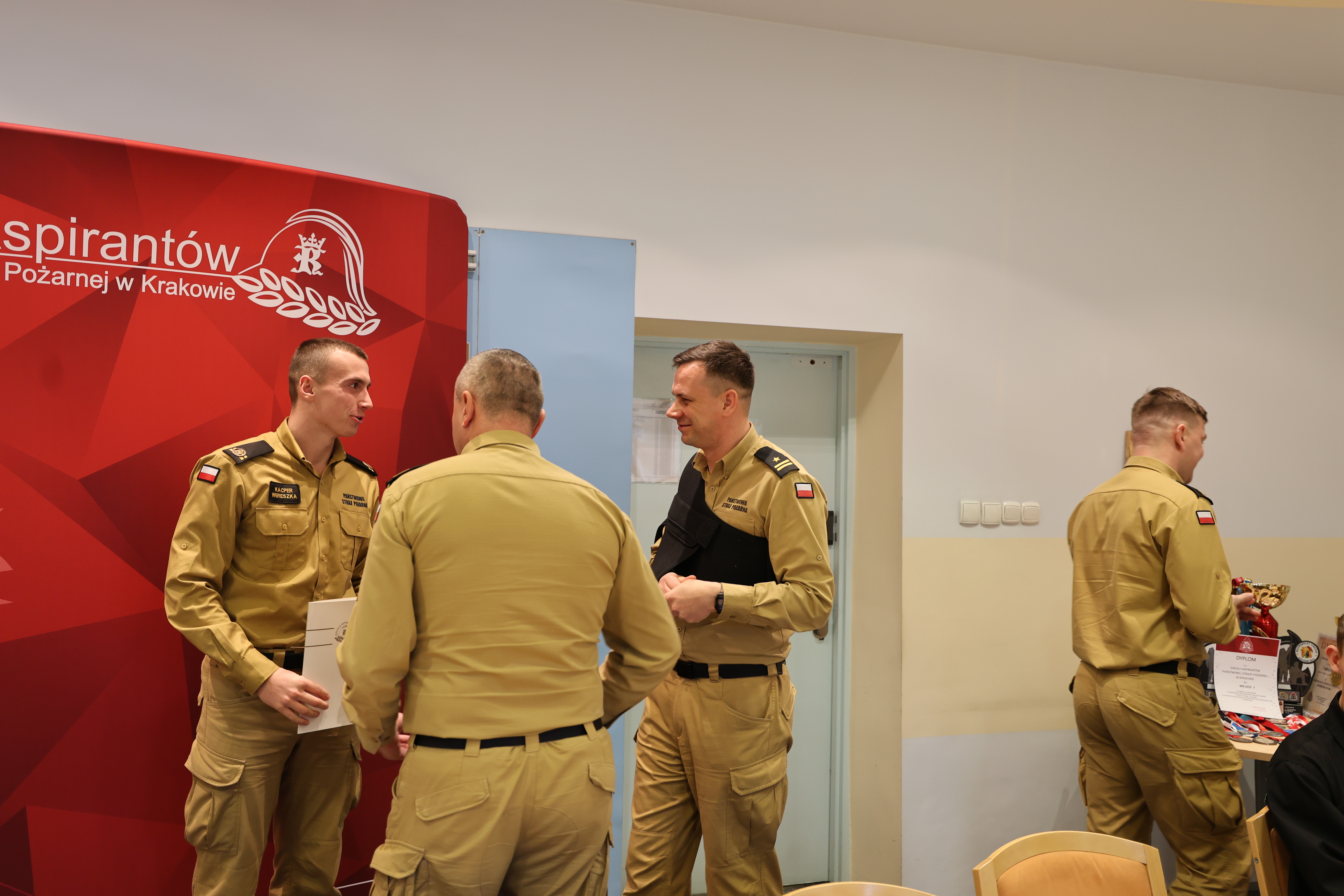 18 grudnia 2024 roku Komendant Szkoły Aspirantów PSP w Krakowie nadbryg. Piotr Filipek wraz ze swoim zastępcą mł.bryg. Bogusławem Szydło i przedstawicielami kadry dydaktyczno-wychowawczej spotkał się z osobami reprezentującymi Szkołę na arenie różnych zawodów sportowych. W czasie zbiórki w imieniu swoim i całej szkolnej społeczności podziękował wszystkim za ponadprzeciętne zaangażowanie, ciężkie treningi, starty, zdobyte medale, puchary i inne trofea. Słowa uznania przeplatały się z życzeniami osobistych, zawodowych i sportowych sukcesów na przyszły rok kalendarzowy i kolejne lata służby. Podkreślając wagę krzewienia kultury fizycznej wśród naszej grupy zawodowej komendant zadeklarował otwartość i gotowość do wspierania inicjatyw na rzecz podnoszenia sprawności fizycznej, w tym rozważenie zgłoszonej w czasie spotkania propozycji poszerzenia stanowisk do ćwiczeń o park do kalisteniki – czyli budowę stanowisk z prostymi przyrządami umożliwiającymi wykonywanie różnego rodzaju ćwiczenia z wykorzystaniem masy własnego ciała.