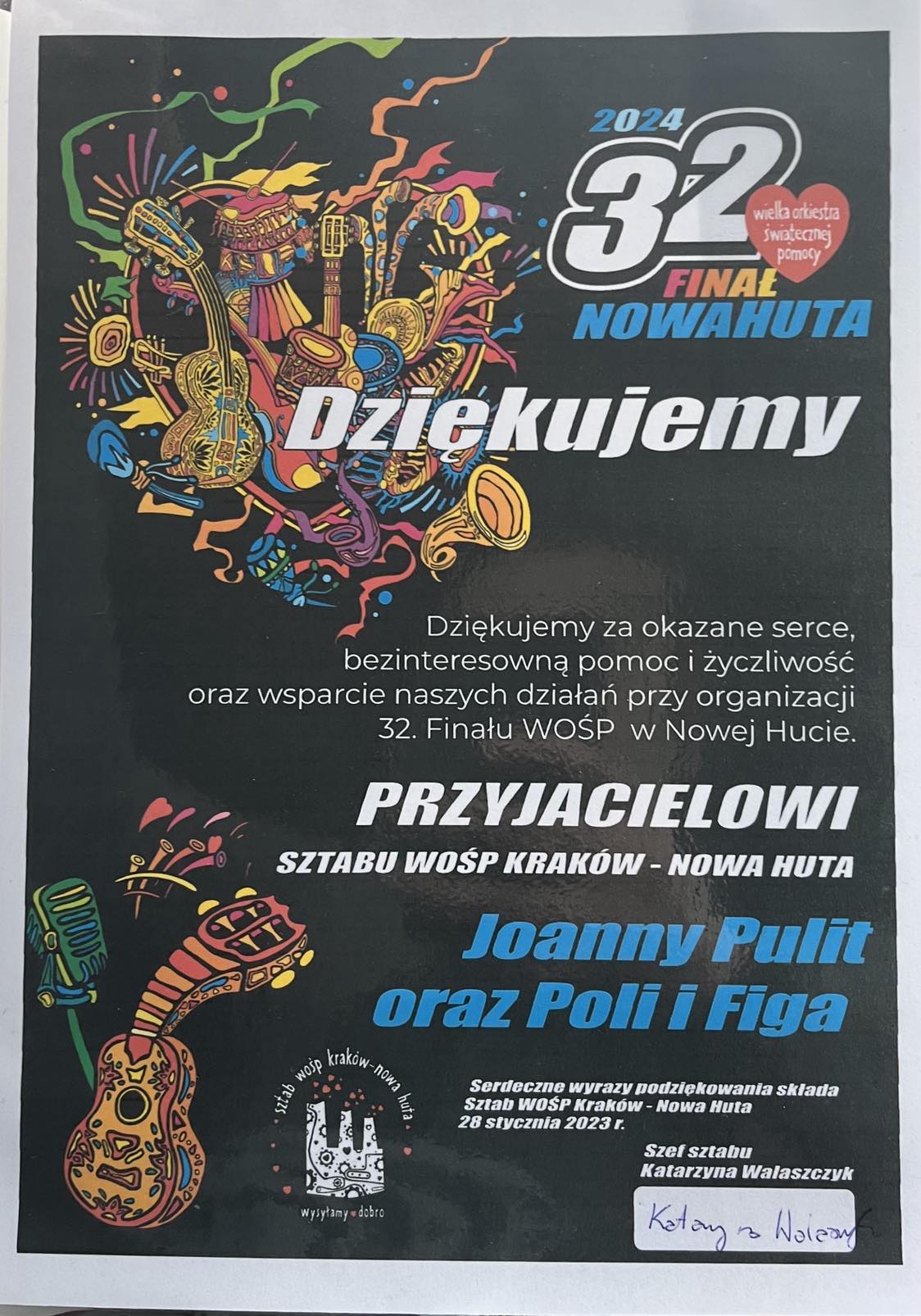 28 stycznia 2024 roku nasza strażacka ekipa z wielkim zaangażowaniem uczestniczyła w 32. Finale Wielkiej Orkiestry Świątecznej Pomocy. Działając w sztabie Nowohuckiego Centrum Kultury włączyliśmy się w zbiórkę środków finansowych na zakup sprzętu do diagnozowania, monitorowania i rehabilitacji chorób płuc u pacjentów hospitalizowanych na oddziałach pulmonologicznych dla dzieci i dorosłych.