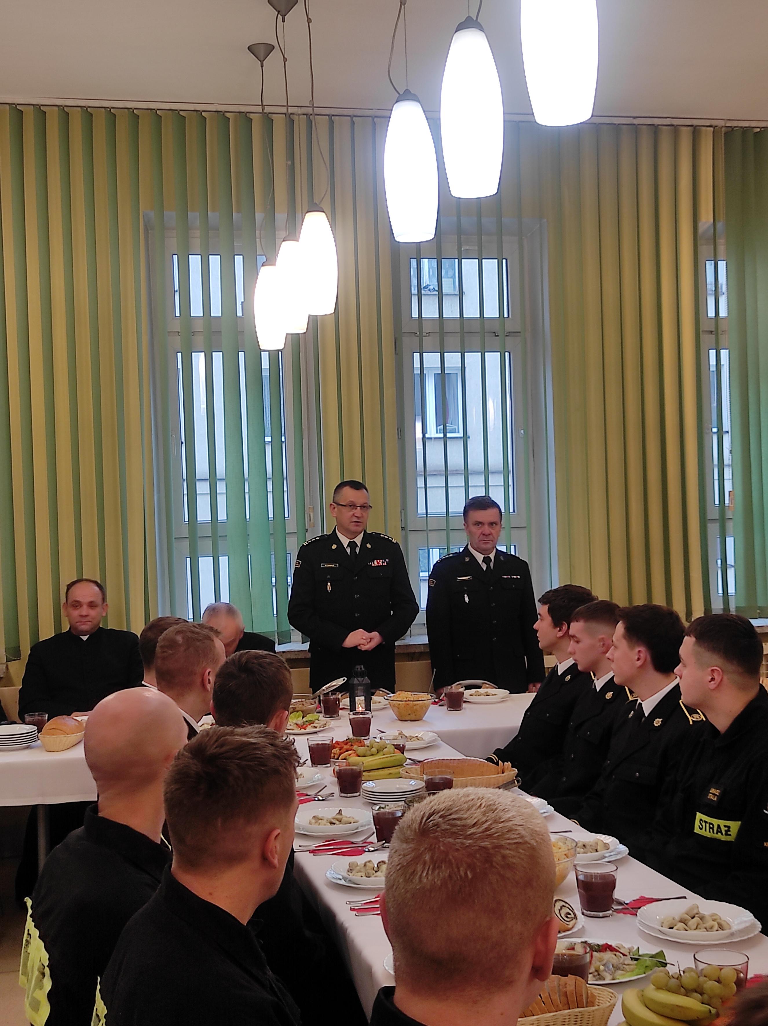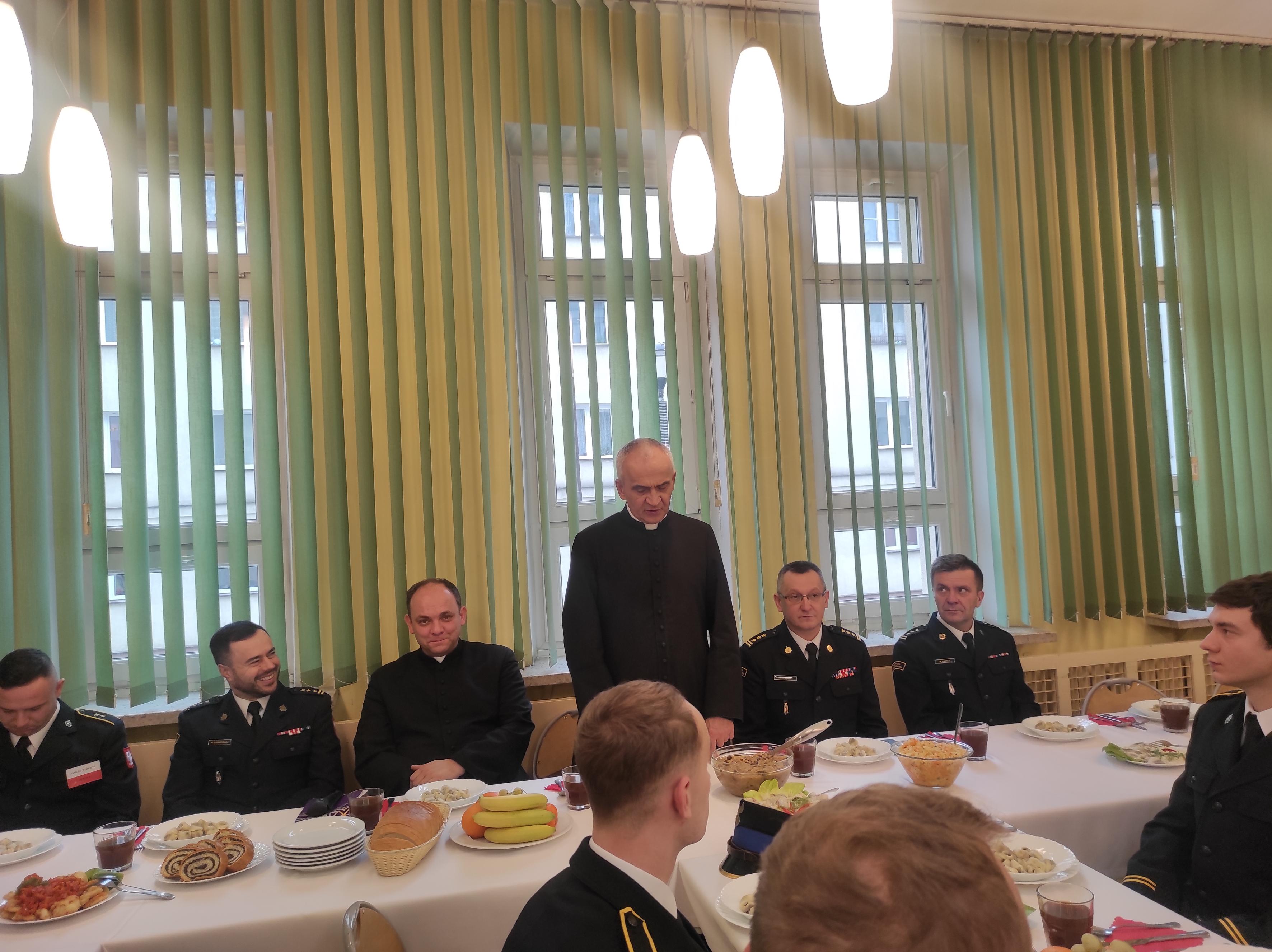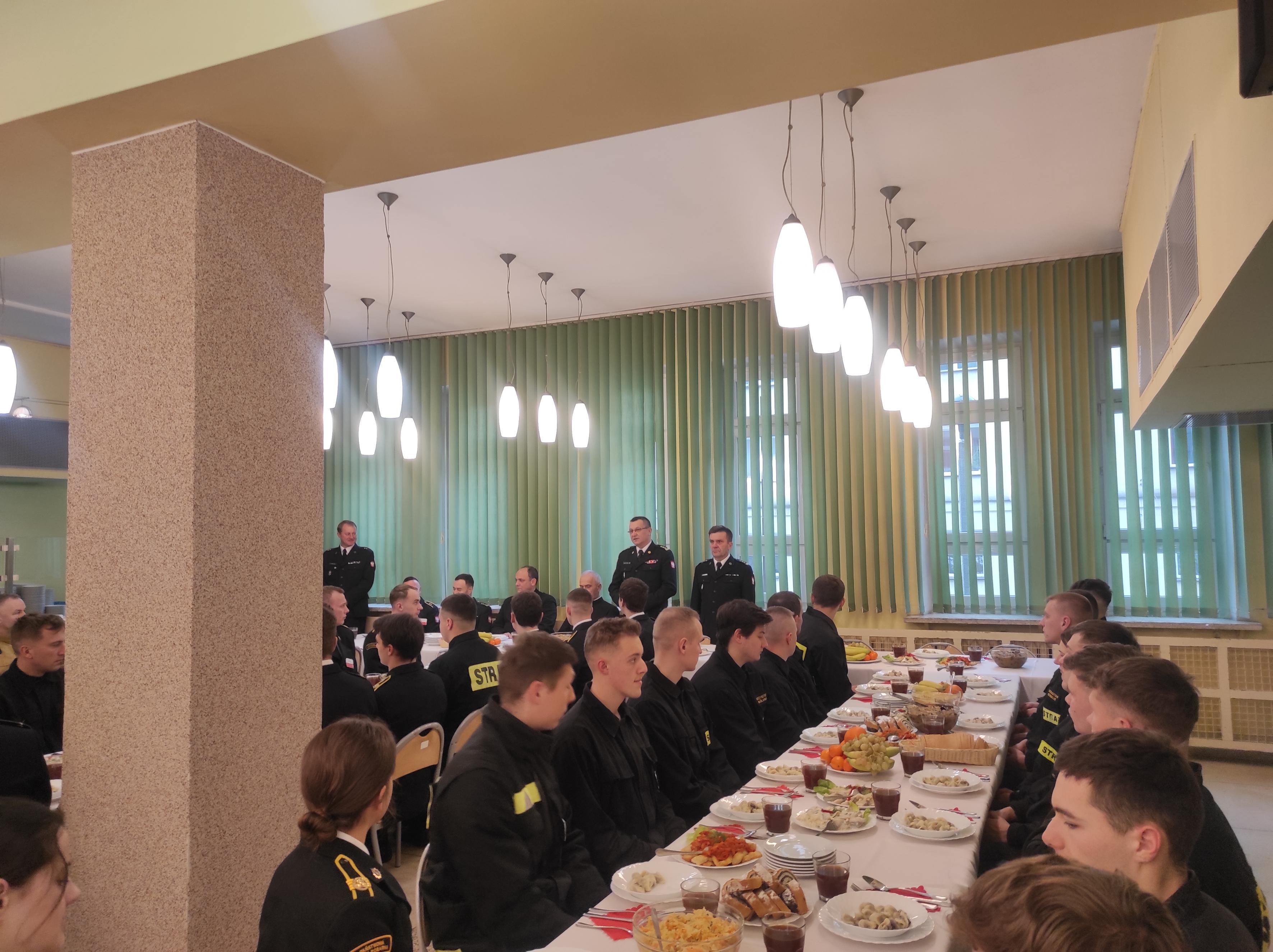 Nazywana służbą kandydacką nauka w naszej Szkole, prócz prestiżu i szansy na zdobycie ciekawego zawodu i fascynującej pracy, wiąże się z szeregiem wyzwań i poświęceń. Jednym z nich jest konieczność zapewnienia całorocznego funkcjonowania Szkolnej Jednostki Ratowniczo-Gaśniczej, gotowości operacyjnej sił centralnego odwodu operacyjnego krajowego systemu ratowniczo -gaśniczego oraz służb i wart mających na celu sprawowanie należytej pieczy nad powierzonymi nam obiektami i mieniem. Powyższe obowiązki wiążą się między innymi z tym, że część z nas okres grudniowych świąt, Sylwestra i Nowego Roku, spędzi z dala od rodzinnych domów i bliskich, co nie oznacza, że w samotności. W trosce o swoich podwładnych, o budowanie i utrzymywanie wzajemnych więzi i poczucia odpowiedzialności, a także w dowód uznania dla swoich uczniów i podopiecznych, w wigilijne popołudnie z kadetami i kadrą JRG spotkał się Komendant SA PSP w Krakowie st.bryg. Marek Chwała wraz ze swoimi zastępcami, kierownictwo Wydziału Pododdziałów Szkolnych, proboszcz pobliskiej parafii pw. Najświętszego Serca Pana Jezusa ks. Stanisław Puzyniak oraz kapelan kadetów ks. Marcin Będkowski.