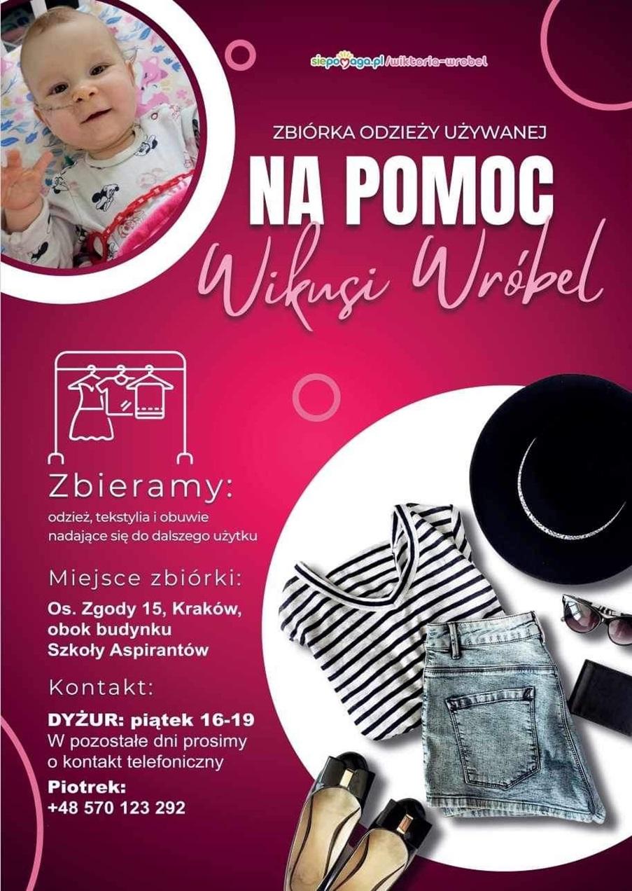 Odpowiadając na apel rodziny i bliskich chorującej na rdzeniowy zanik mięśni Wiktorii Wróbel, kadra i słuchacze Szkoły włączyli się w kolejną akcję charytatywną. Tym razem pomagaliśmy w zebraniu nadającej się do dalszego użycia odzieży, a jeden z obiektów stał się tymczasowym magazynem. Trwająca ponad dwa miesiące zbiórka zakończyła się 11 maja 2024 roku, gdy całość zgromadzonego asortymentu spakowana została na podstawiony przez organizatora samochód dostawczy.