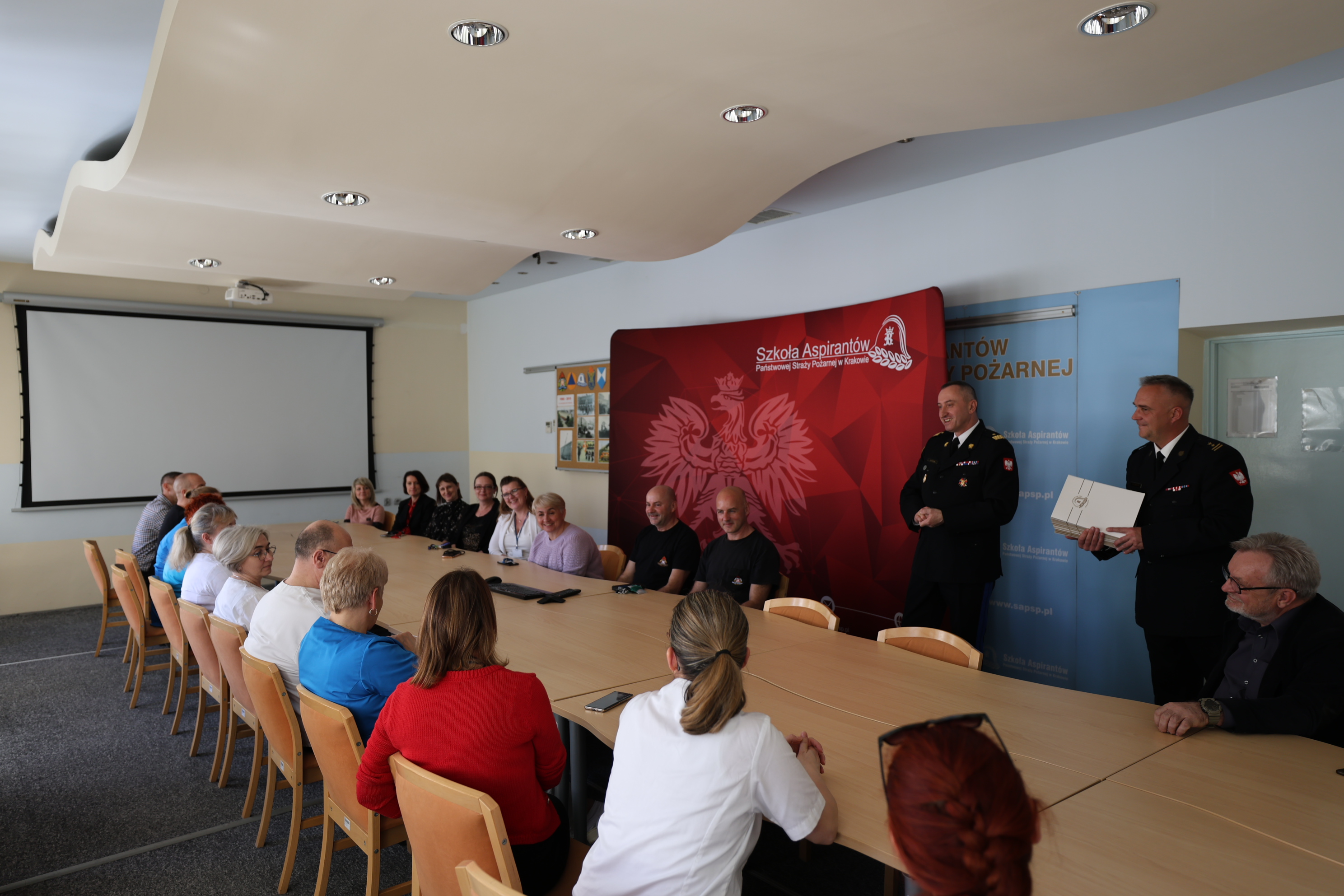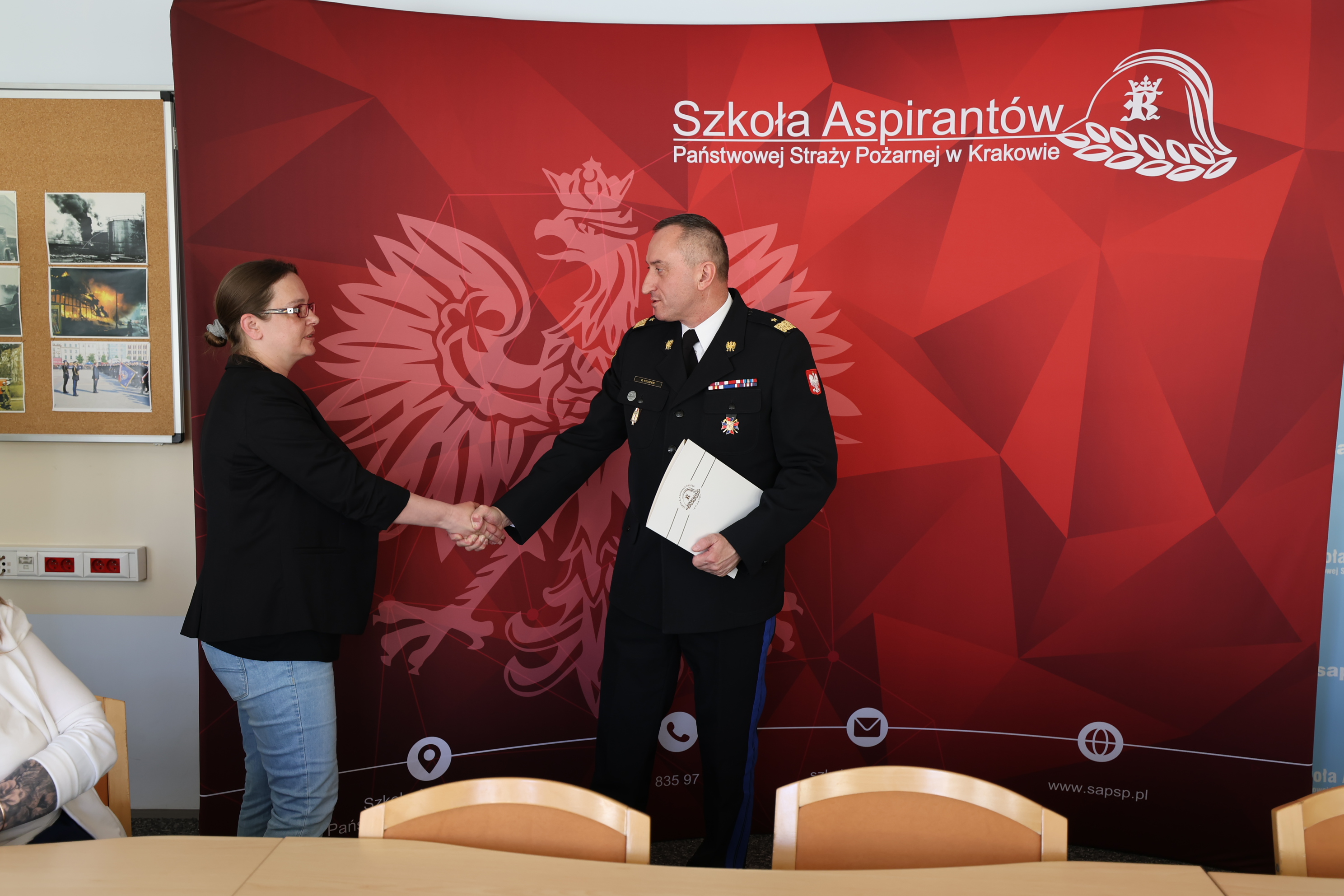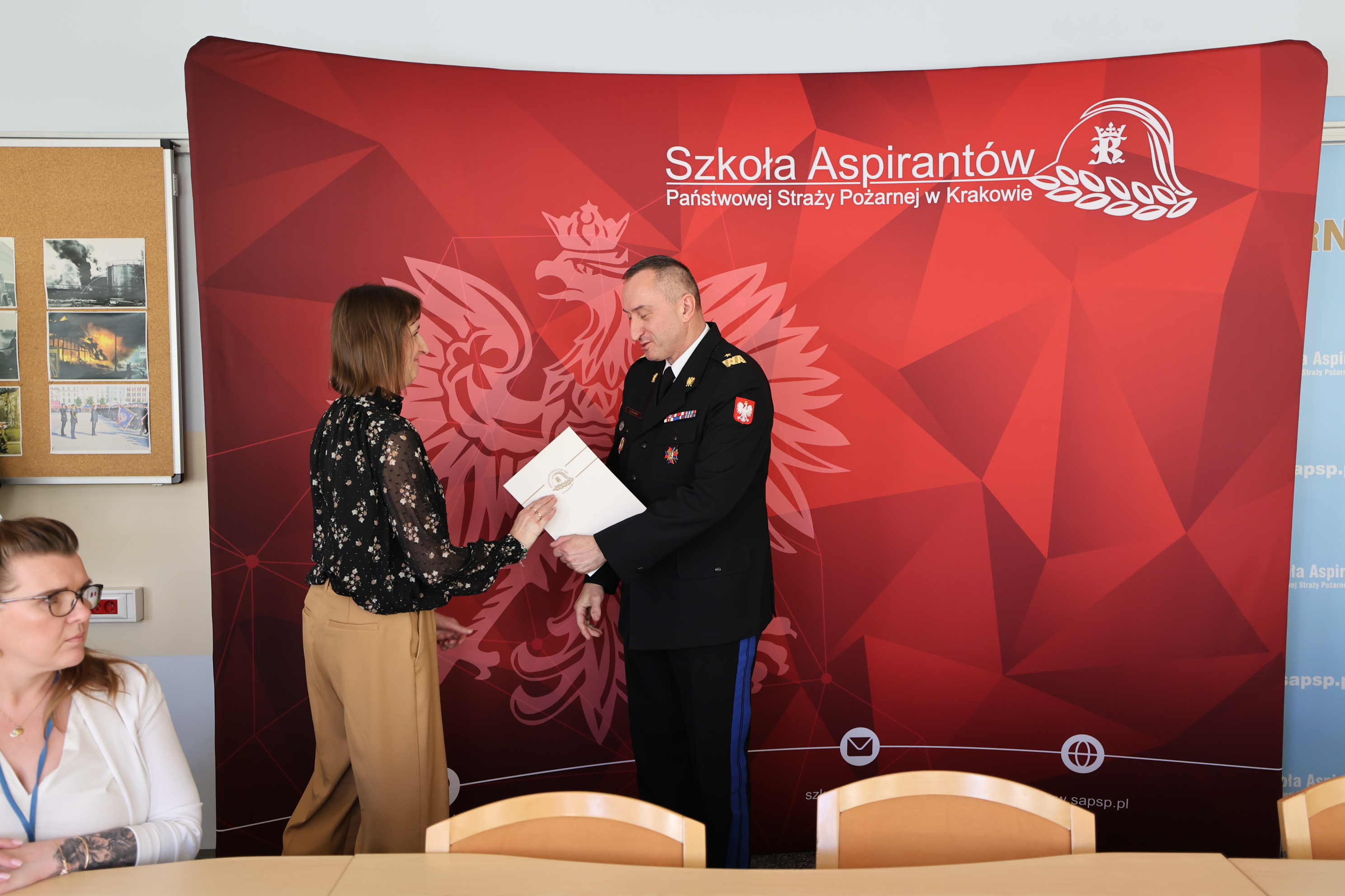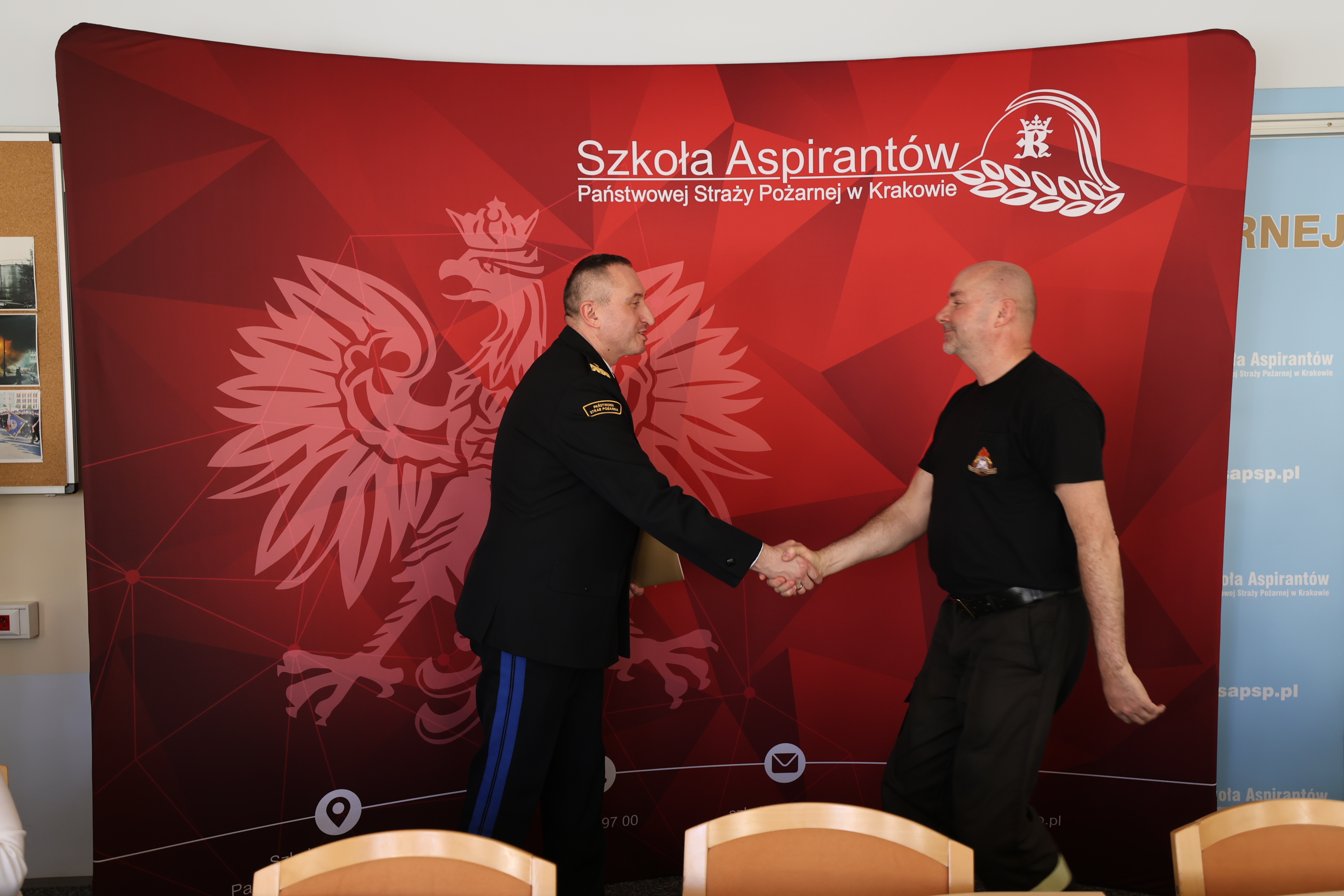 Zwieńczeniem szkolenia było uroczyste wręczenie certyfikatów ukończenia szkolenia, którego 16 kwietnia br. dokonał Komendant Szkoły Aspirantów PSP w Krakowie.
