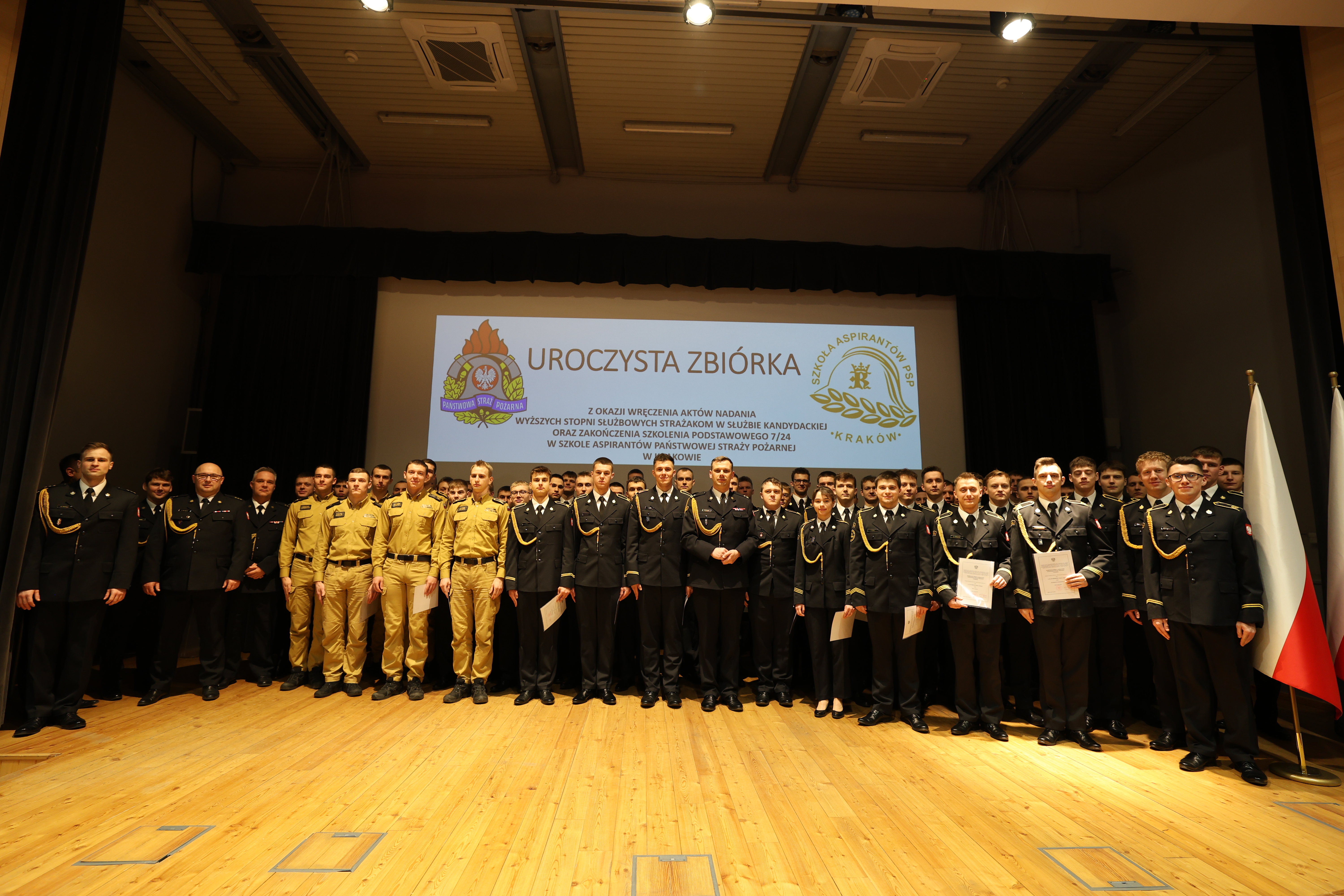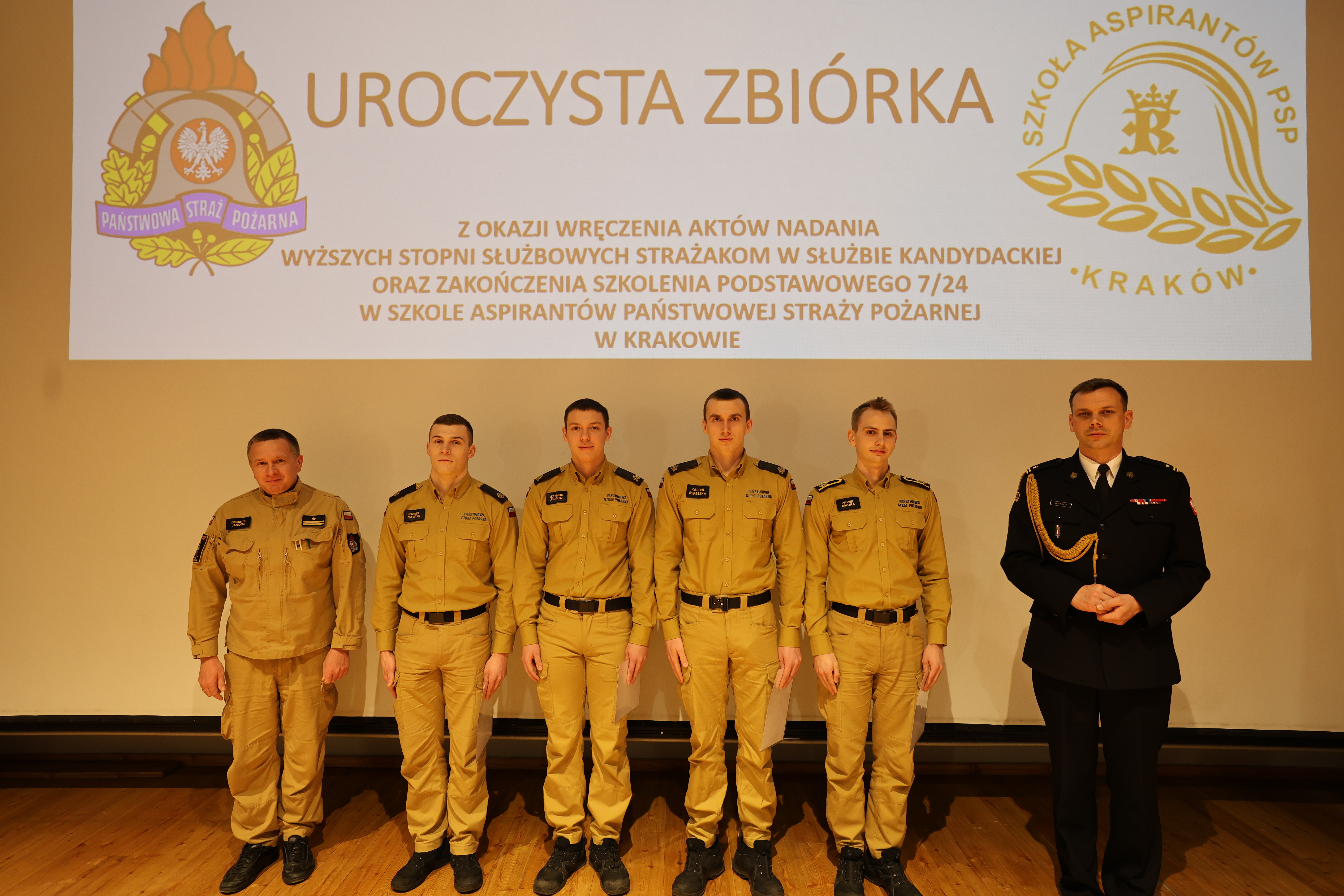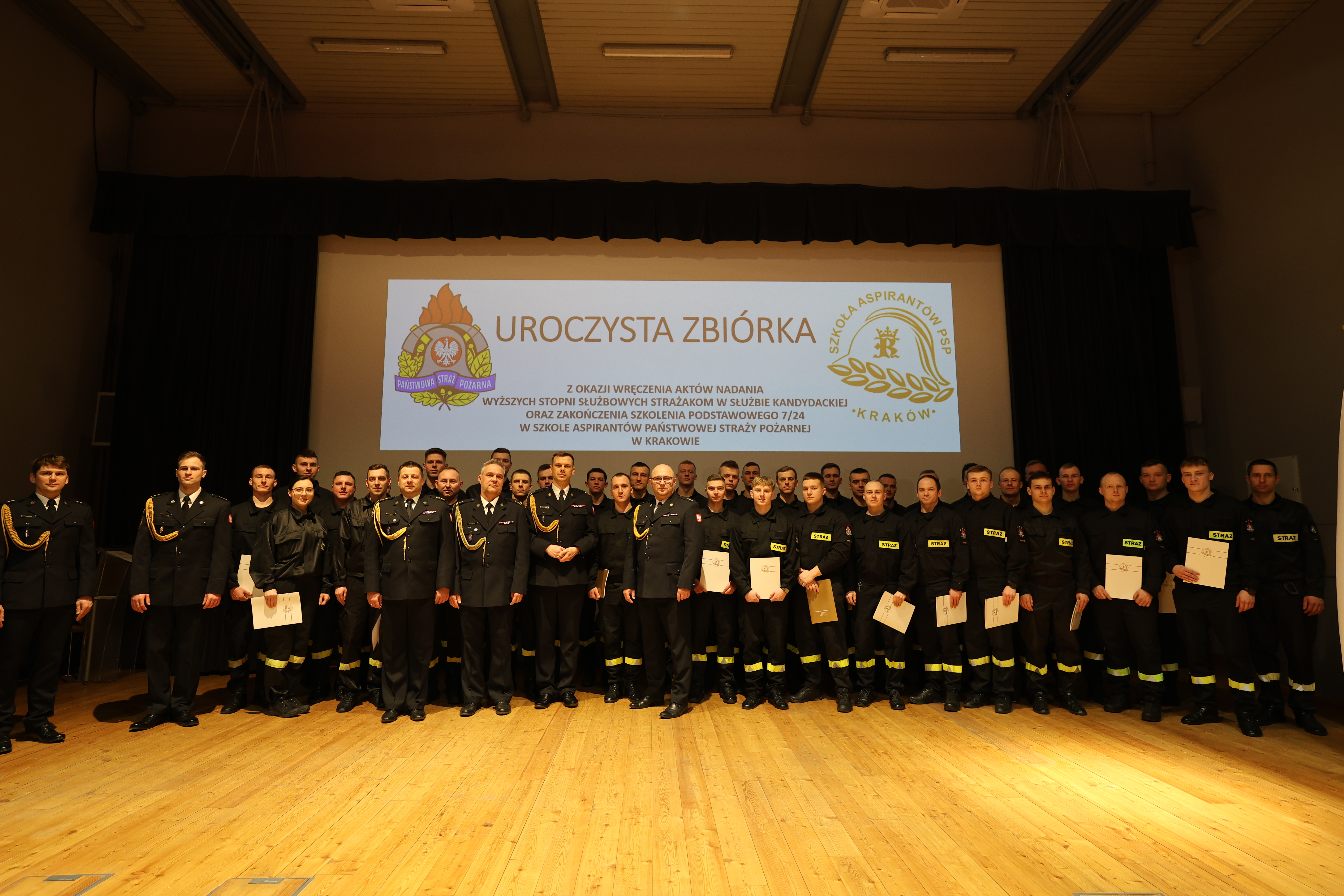 05 lutego 2025 roku w auli Szkoły Aspirantów Państwowej Straży Pożarnej w Krakowie odbyła się uroczysta zbiórka z okazji nadania wyższych stopni strażakom w służbie kandydackiej, wręczenia srebrnych i złotych odznak "Wzorowy Kadet Pożarnictwa" oraz zakończenia Szkolenia Podstawowego SP 7/24.