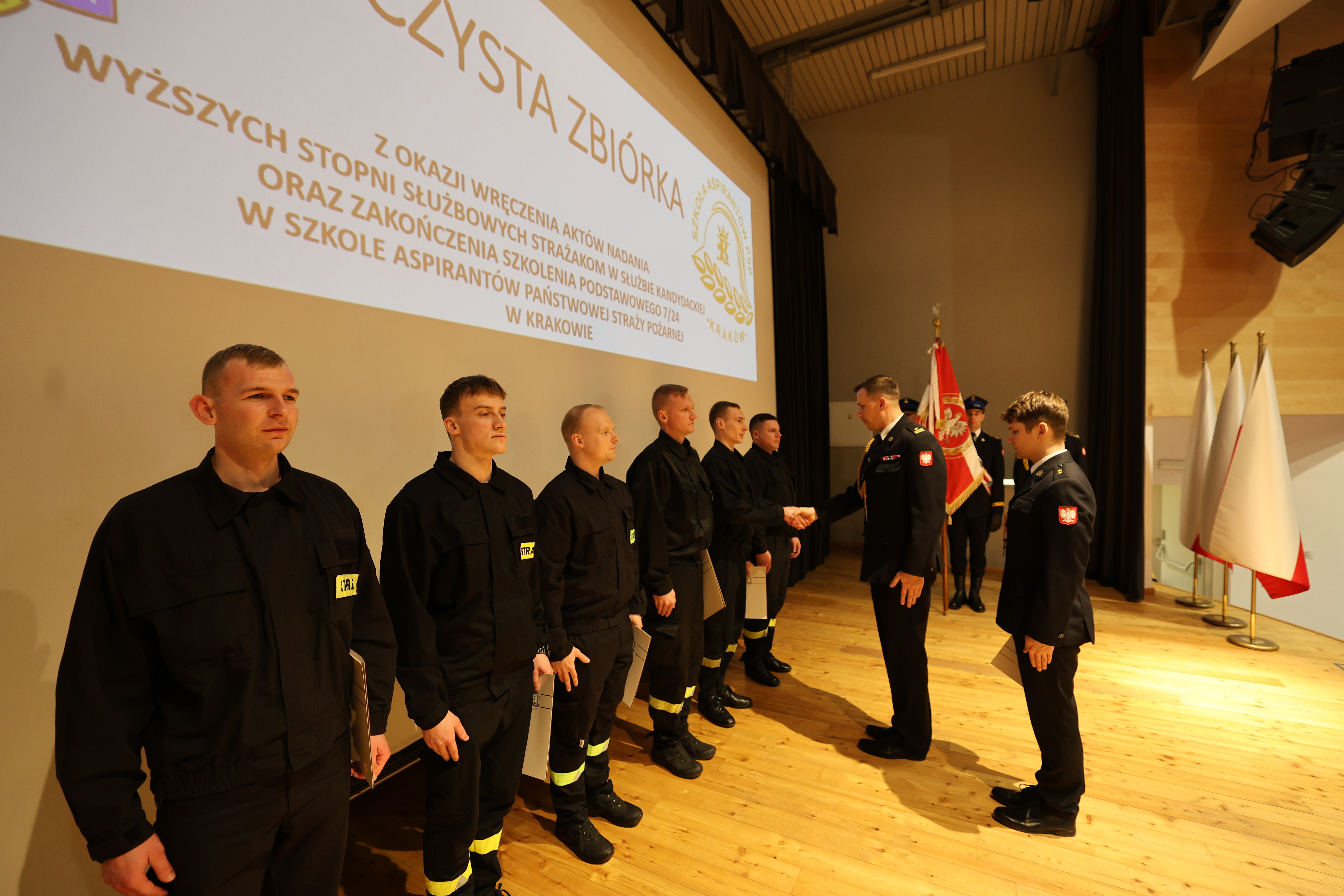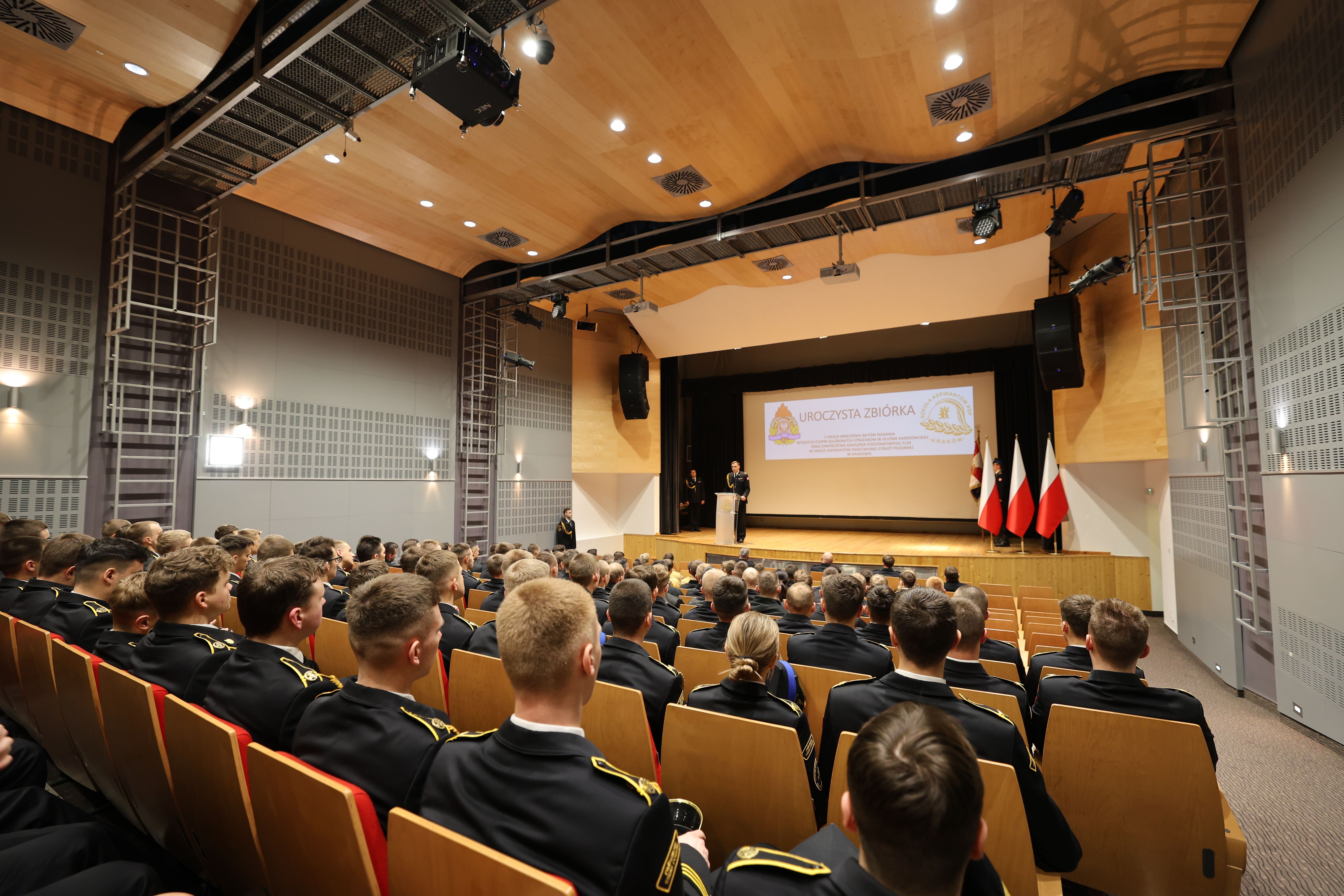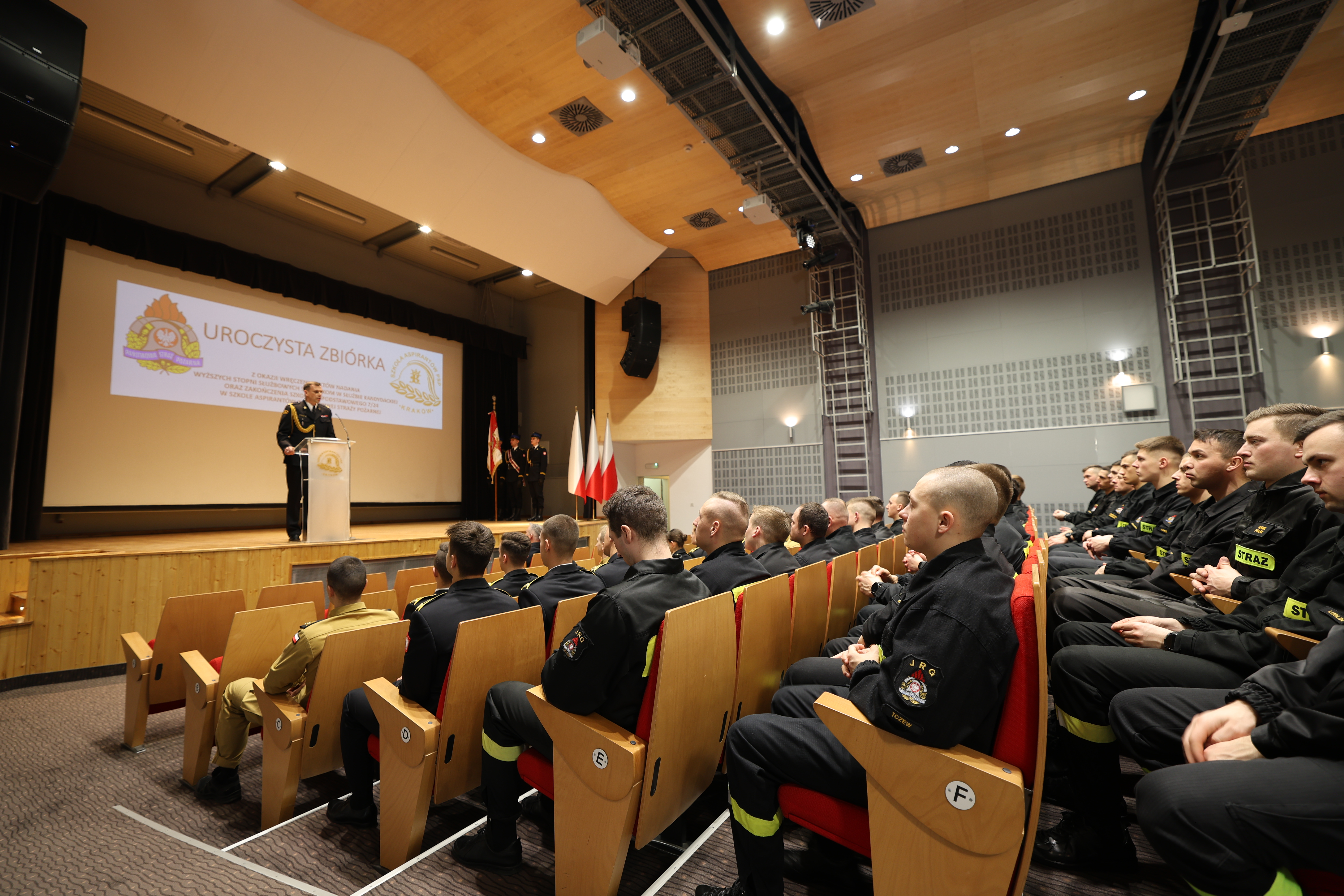 05 lutego 2025 roku w auli Szkoły Aspirantów Państwowej Straży Pożarnej w Krakowie odbyła się uroczysta zbiórka z okazji nadania wyższych stopni strażakom w służbie kandydackiej, wręczenia srebrnych i złotych odznak "Wzorowy Kadet Pożarnictwa" oraz zakończenia Szkolenia Podstawowego SP 7/24.
