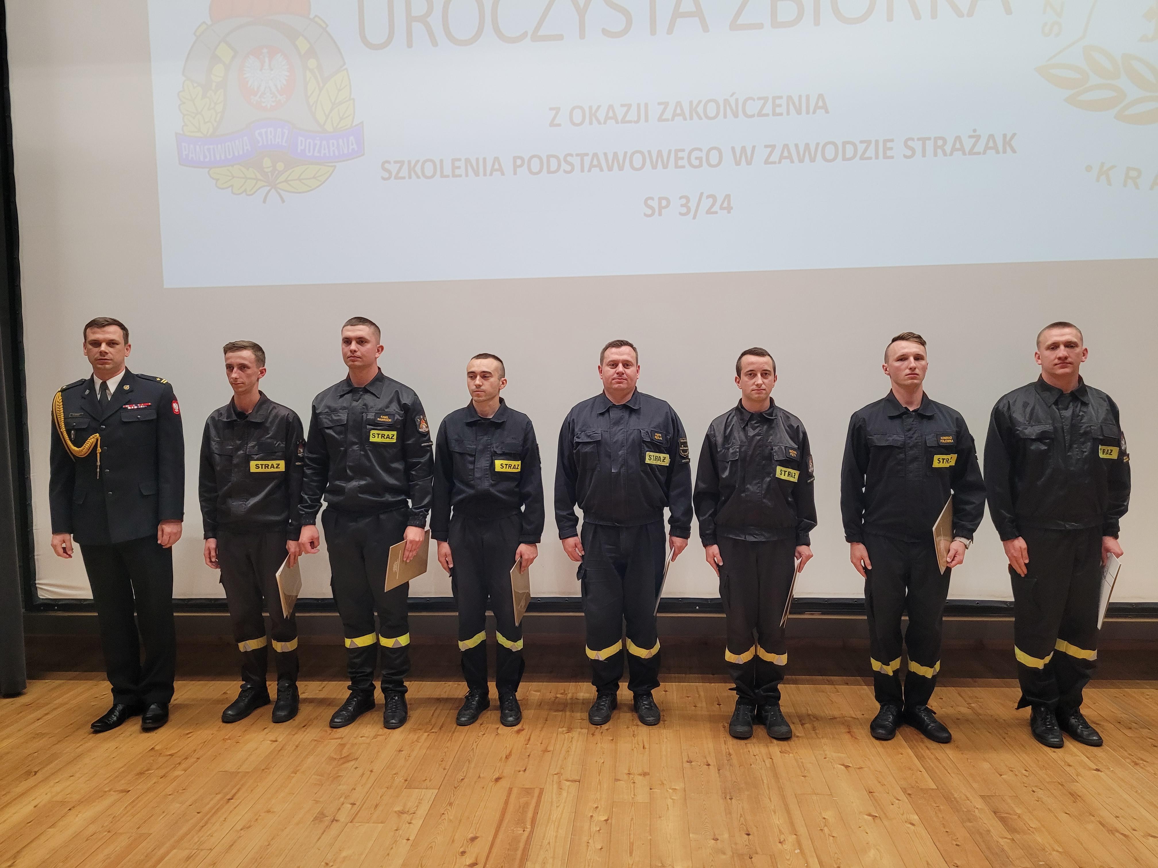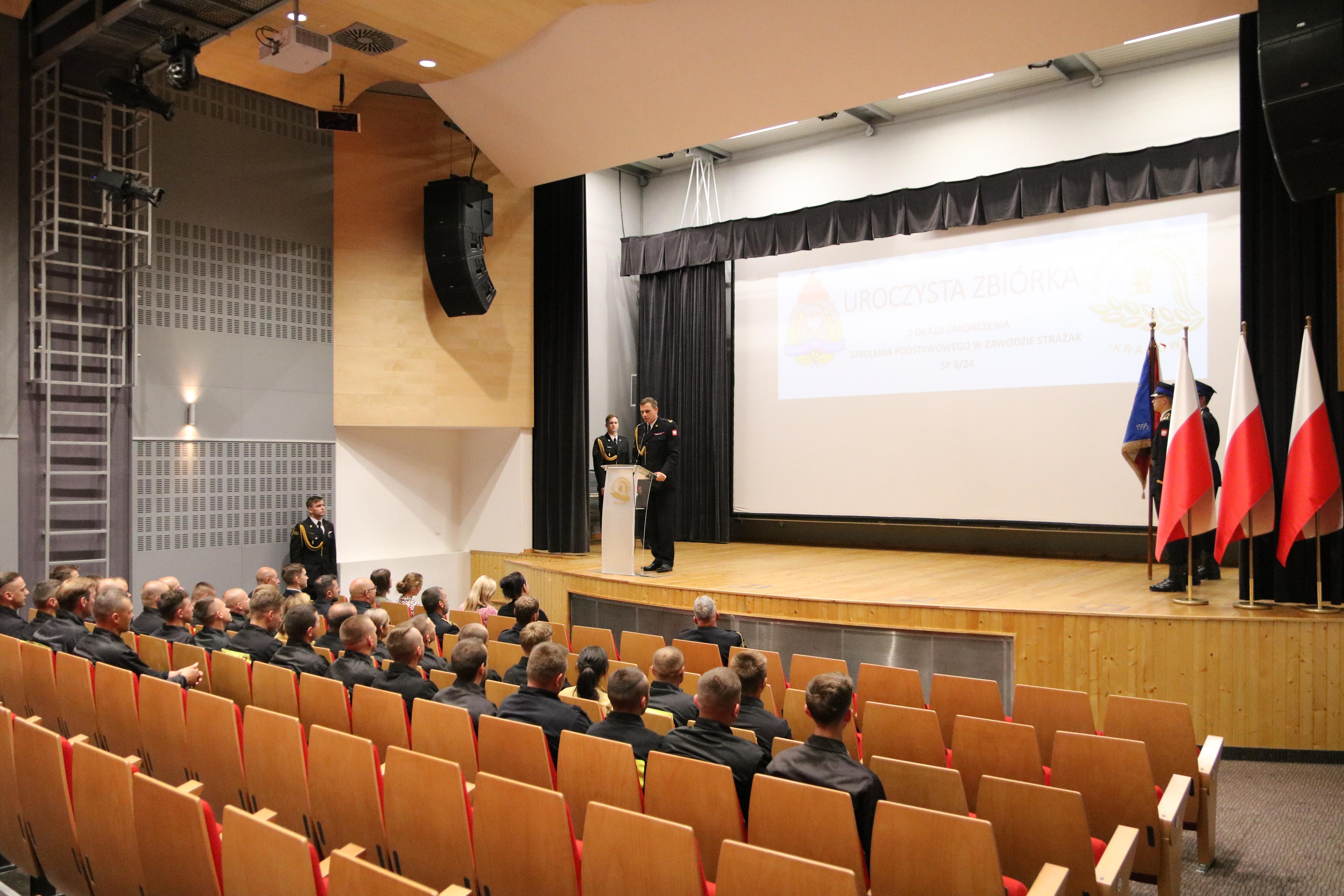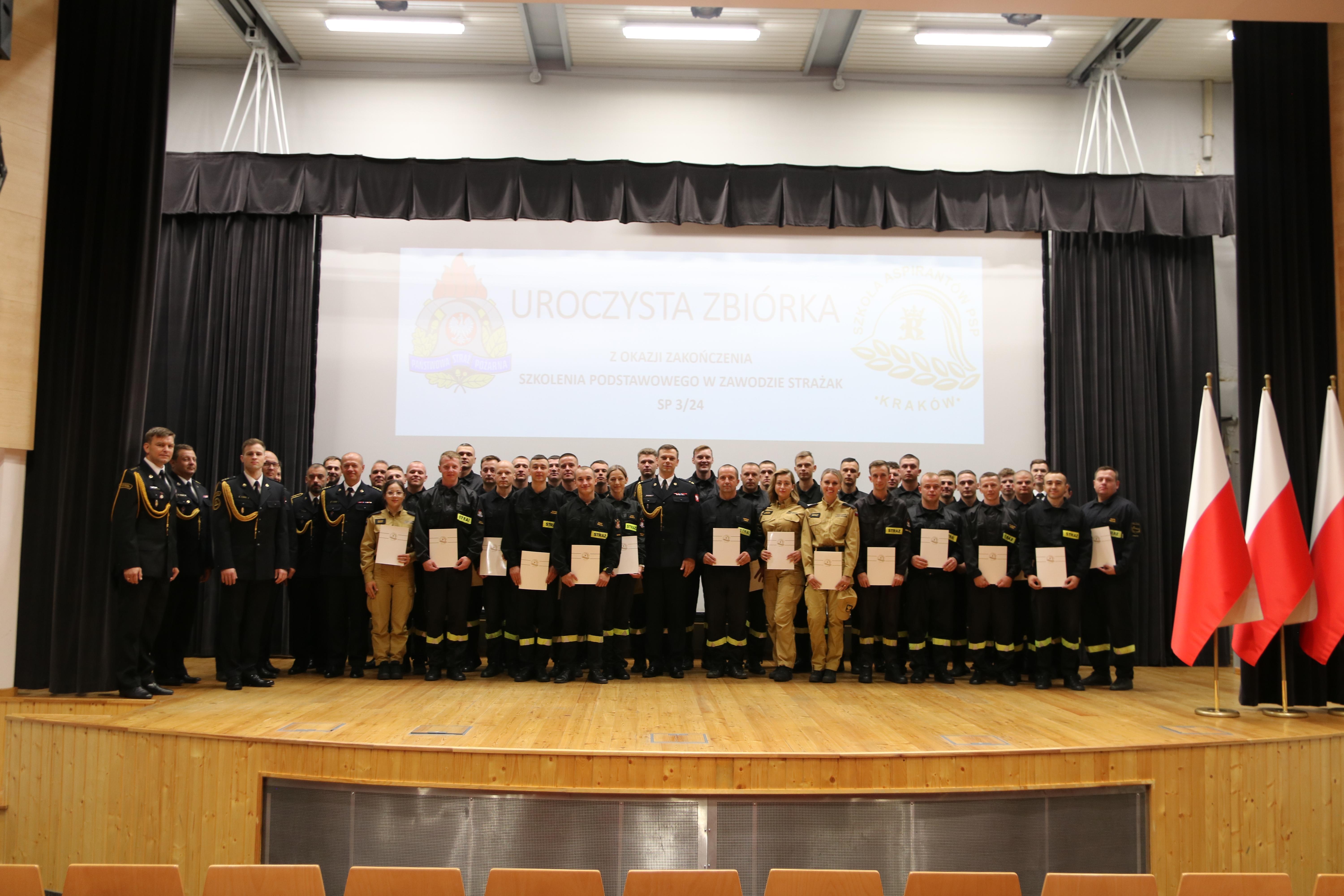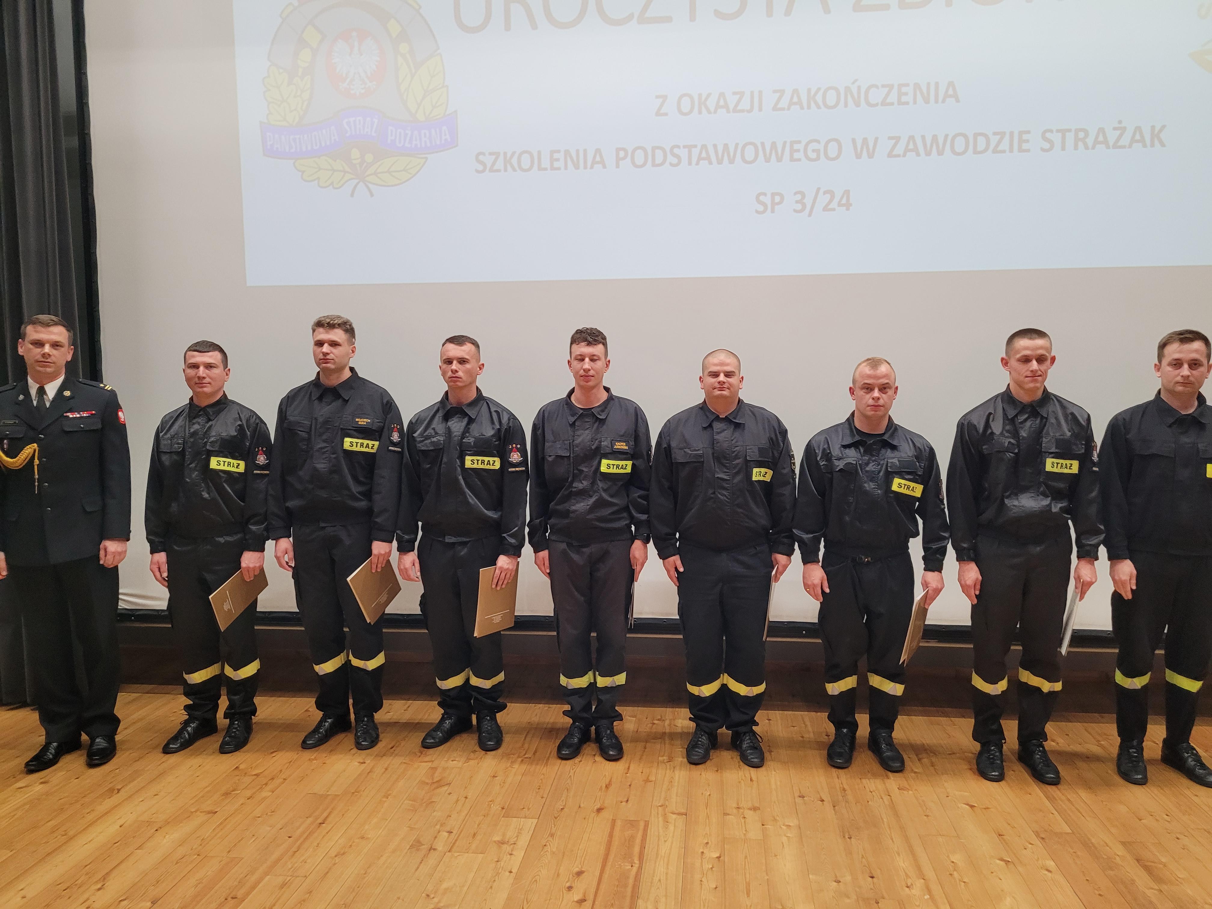 13 sierpnia 2024 roku odbyło się uroczyste zakończenie szkolenia podstawowego w zawodzie strażak funkcjonującego w Szkole pod kryptonimem SP 3/24. W jego trakcie, od początku maja br., tajniki pożarniczego rzemiosła poznawało łącznie 35 osób, w tym 26 pełniących służbę w Państwowej Straży Pożarnej i 4 zatrudnione w innych jednostkach ochrony przeciwpożarowej. W tym czasie posiadły one wiedzę i umiejętności niezbędne do wykonywania czynności ratowniczych na poziomie podstawowym. W ciągu blisko 500 godzin zajęć teoretycznych i praktycznych, zaliczeń oraz egzaminów słuchacze udowodnili, że wybór tak odpowiedzialnego zawodu, nie był dziełem przypadku. Ich zaangażowanie i dociekliwość, pomimo często niesprzyjających wysiłkowi fizycznemu warunków atmosferycznych, trwającego sezonu wakacyjnego i urlopowego, motywowała nas wszystkich do wytężonej pracy.