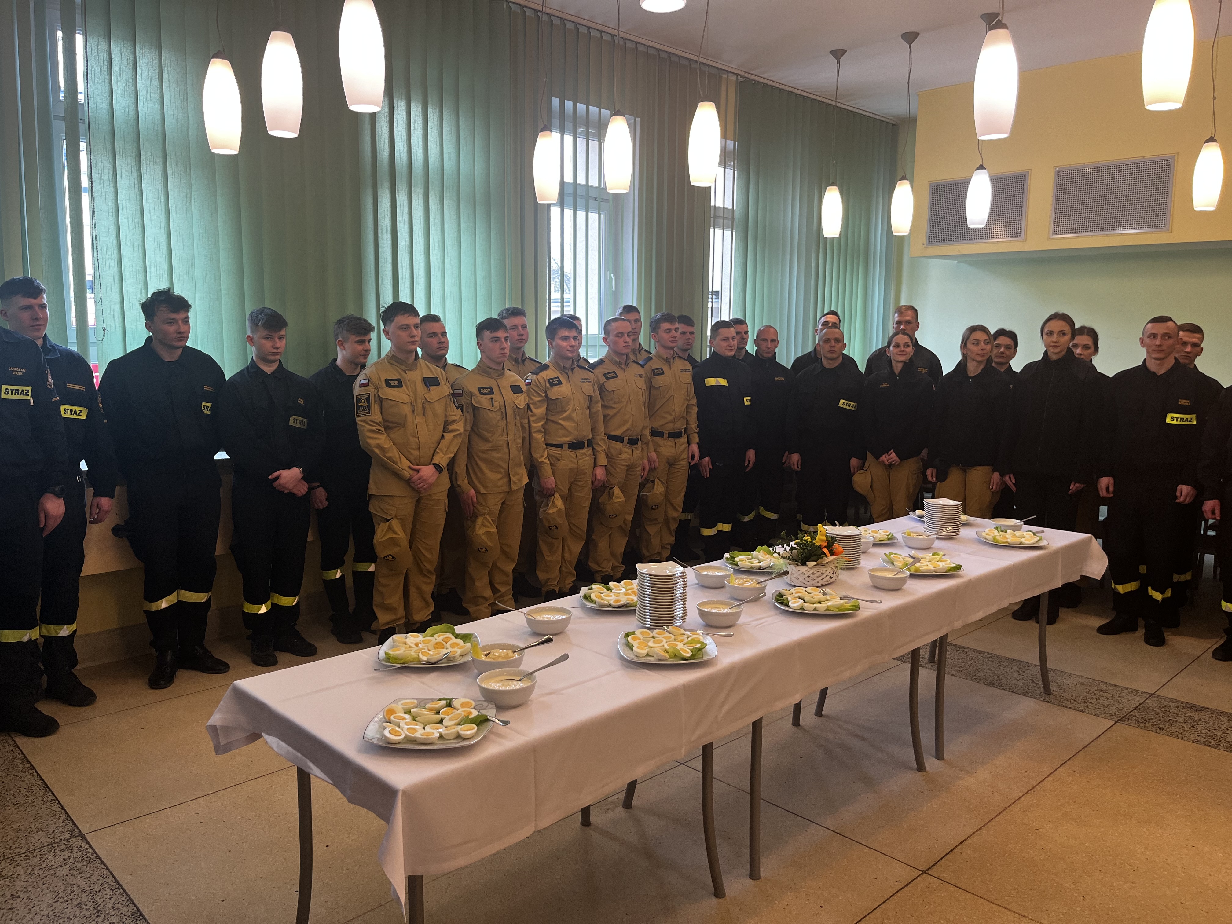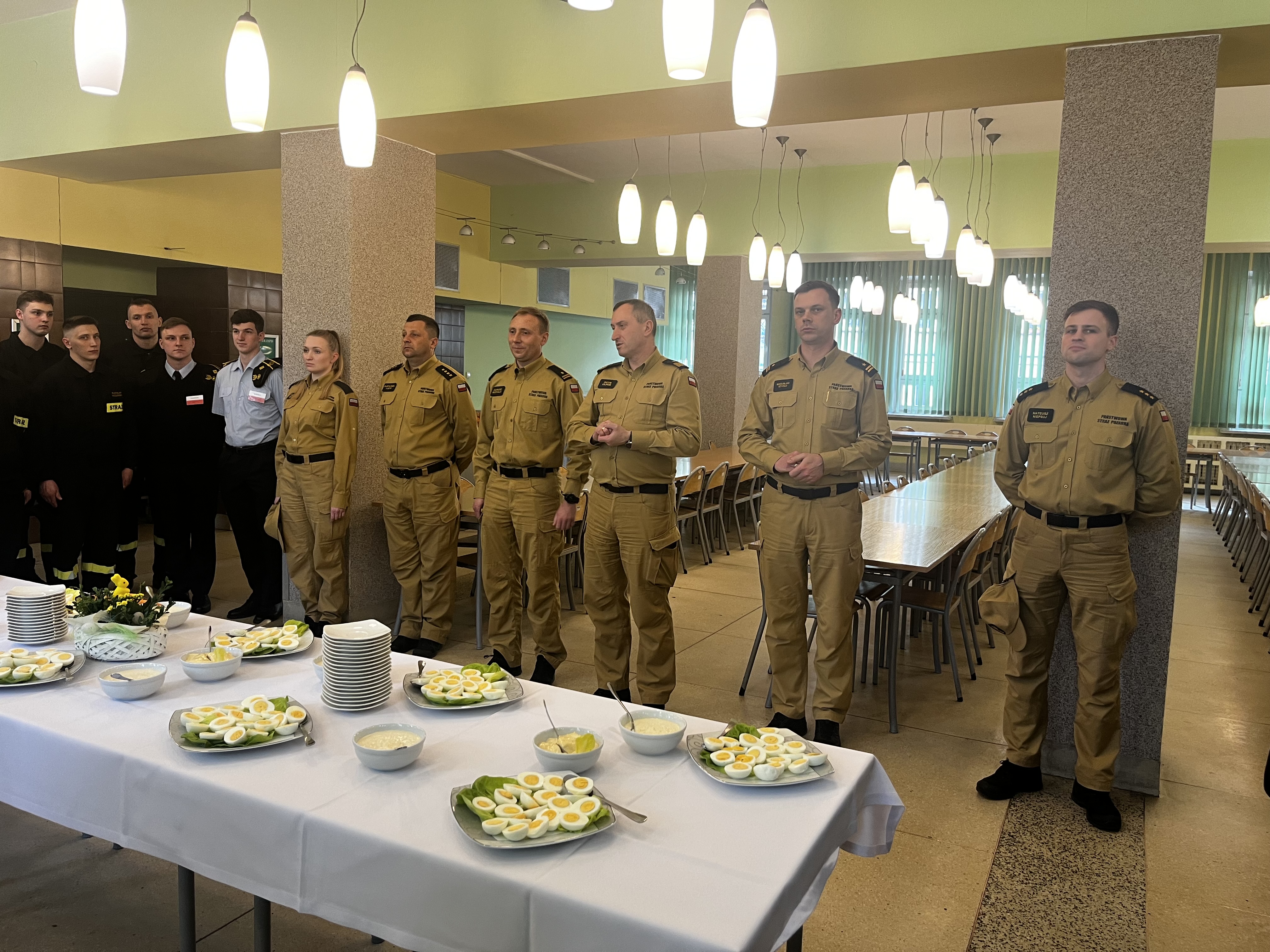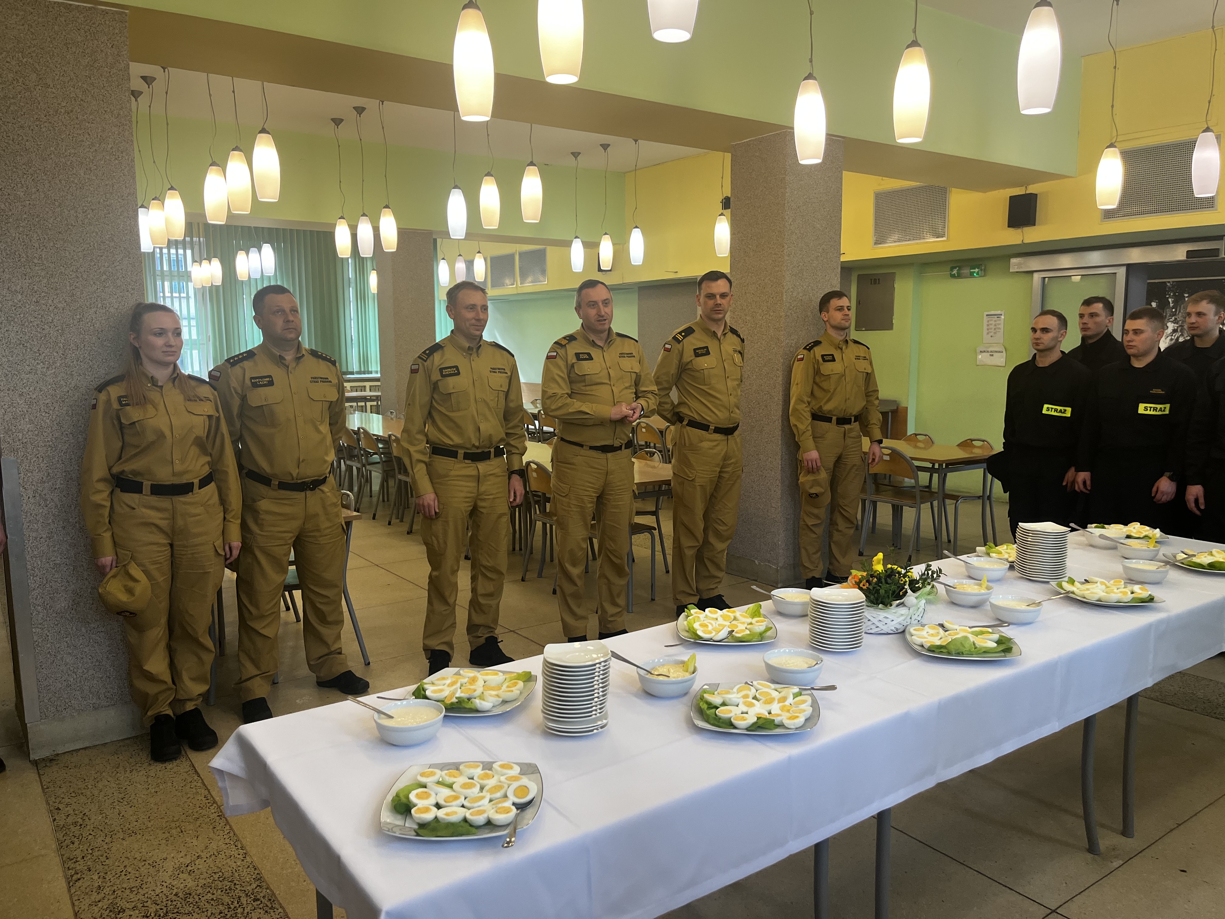 28 marca 2024 roku w szkolnej stołówce odbyło się wielkanocne spotkanie kadry kierowniczej z reprezentacją słuchaczy, którzy pomimo wiosennej przerwy świątecznej pozostaną w murach Szkoły, by pełnić służby, warty i dyżury w ramach centralnego odwodu operacyjnego krajowego systemu ratowniczo-gaśniczego. Z kadetami i uczestnikami szkolenia podstawowego symbolicznym „jajeczkiem” i najserdeczniejszymi życzeniami podzielił się komendant wraz ze swoimi zastępcami oraz pracownicy wydziału pododdziałów szkolnych.
