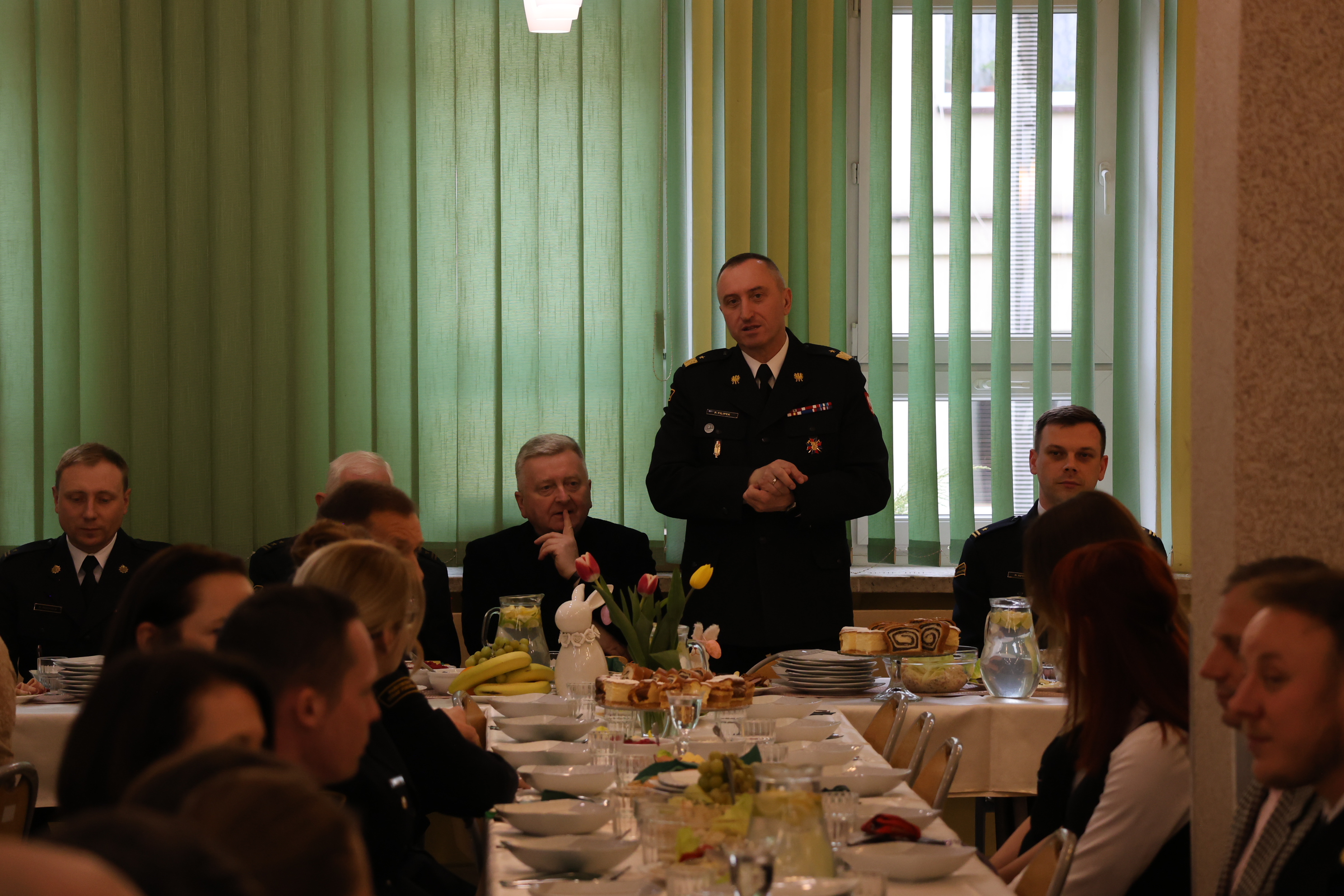 Komendant Szkoły Aspirantów PSP w Krakowie, nadbryg. Piotr Filipek, skierował do zebranych słowa wdzięczności za dotychczasowe zaangażowanie w realizację zadań służbowych oraz przekazał najserdeczniejsze życzenia z okazji nadchodzących Świąt Zmartwychwstania Pańskiego. Podkreślił, jak ważna dla formacji jest jedność oraz wzajemny szacunek, które stanowią fundament wspólnej służby na rzecz bezpieczeństwa.
