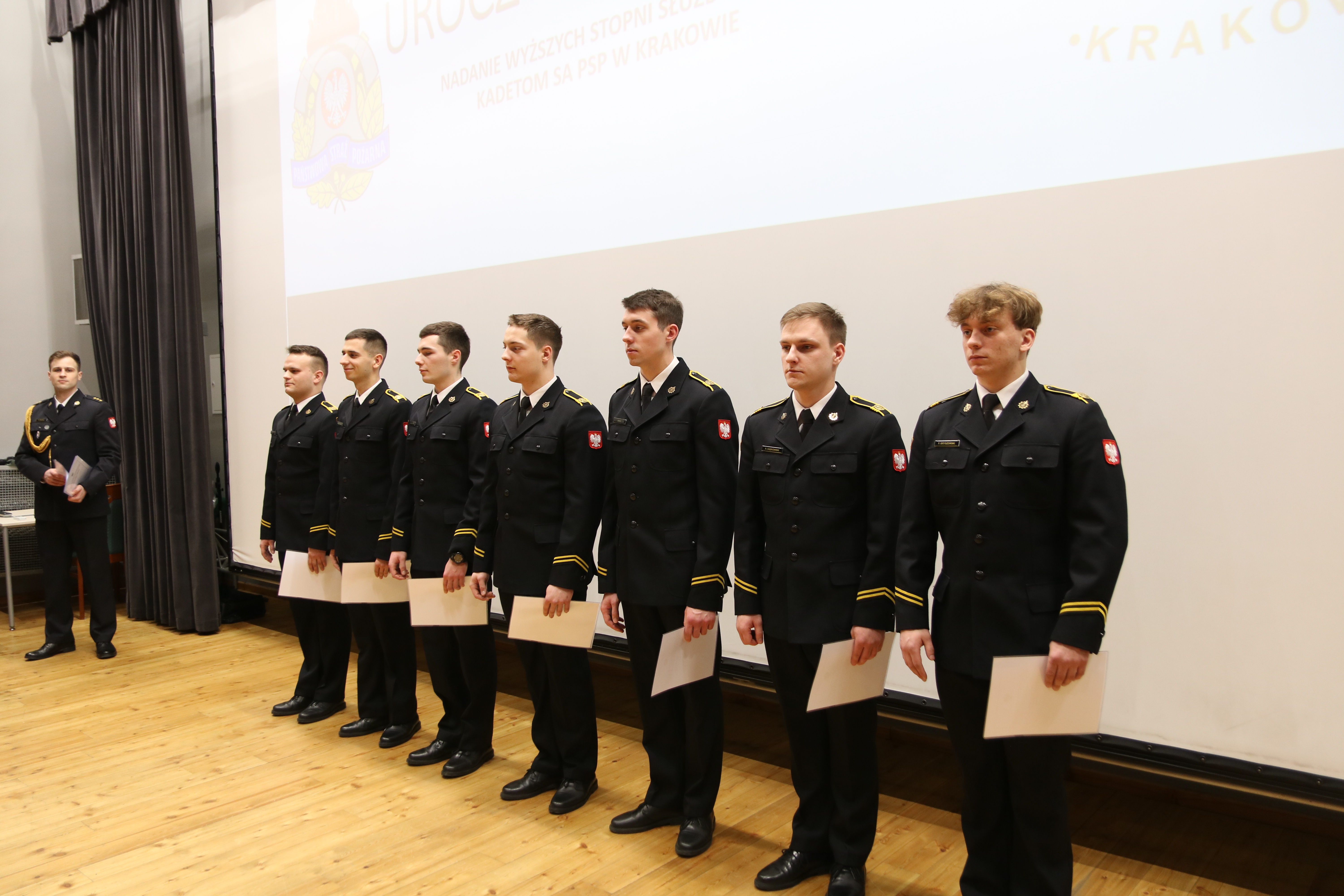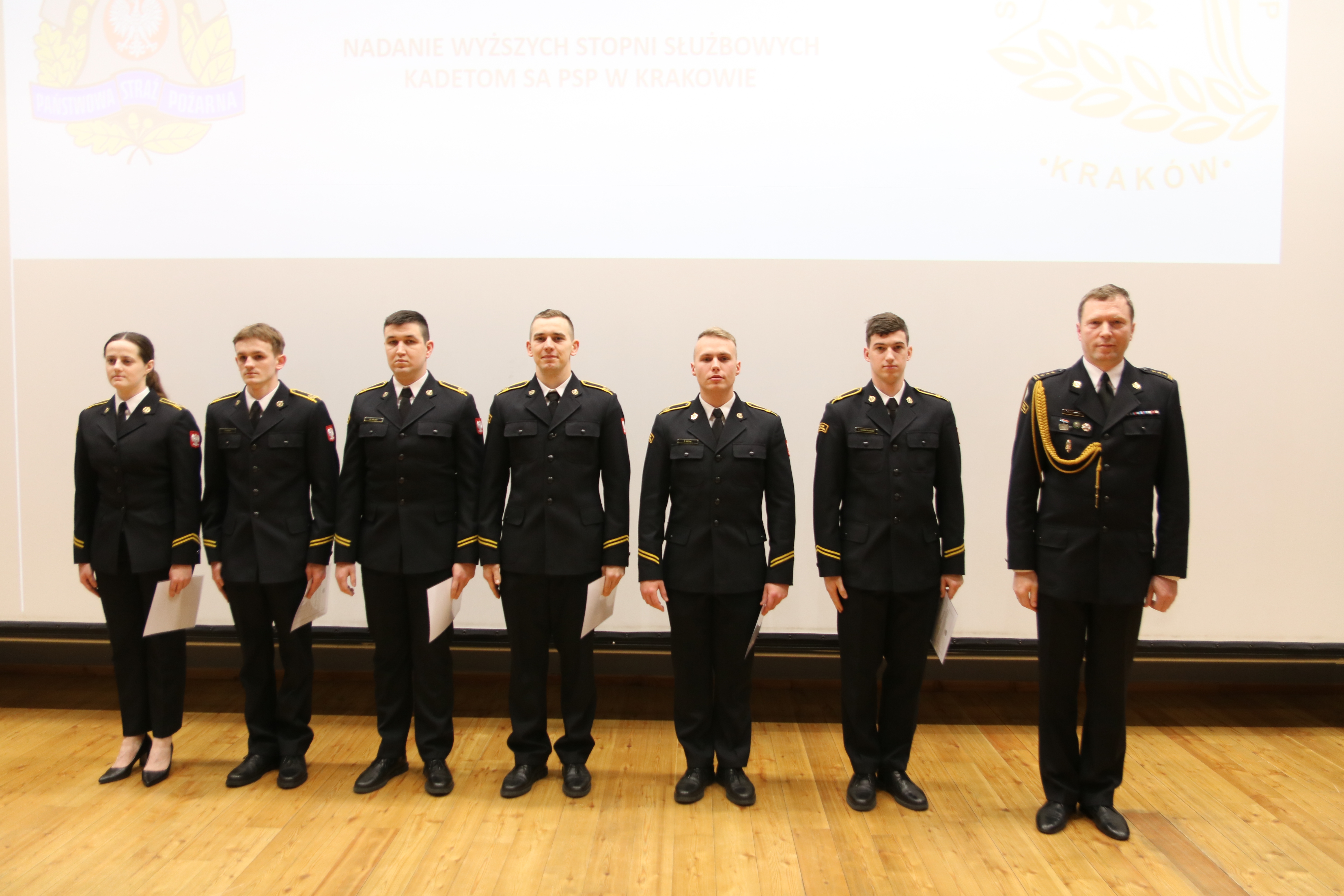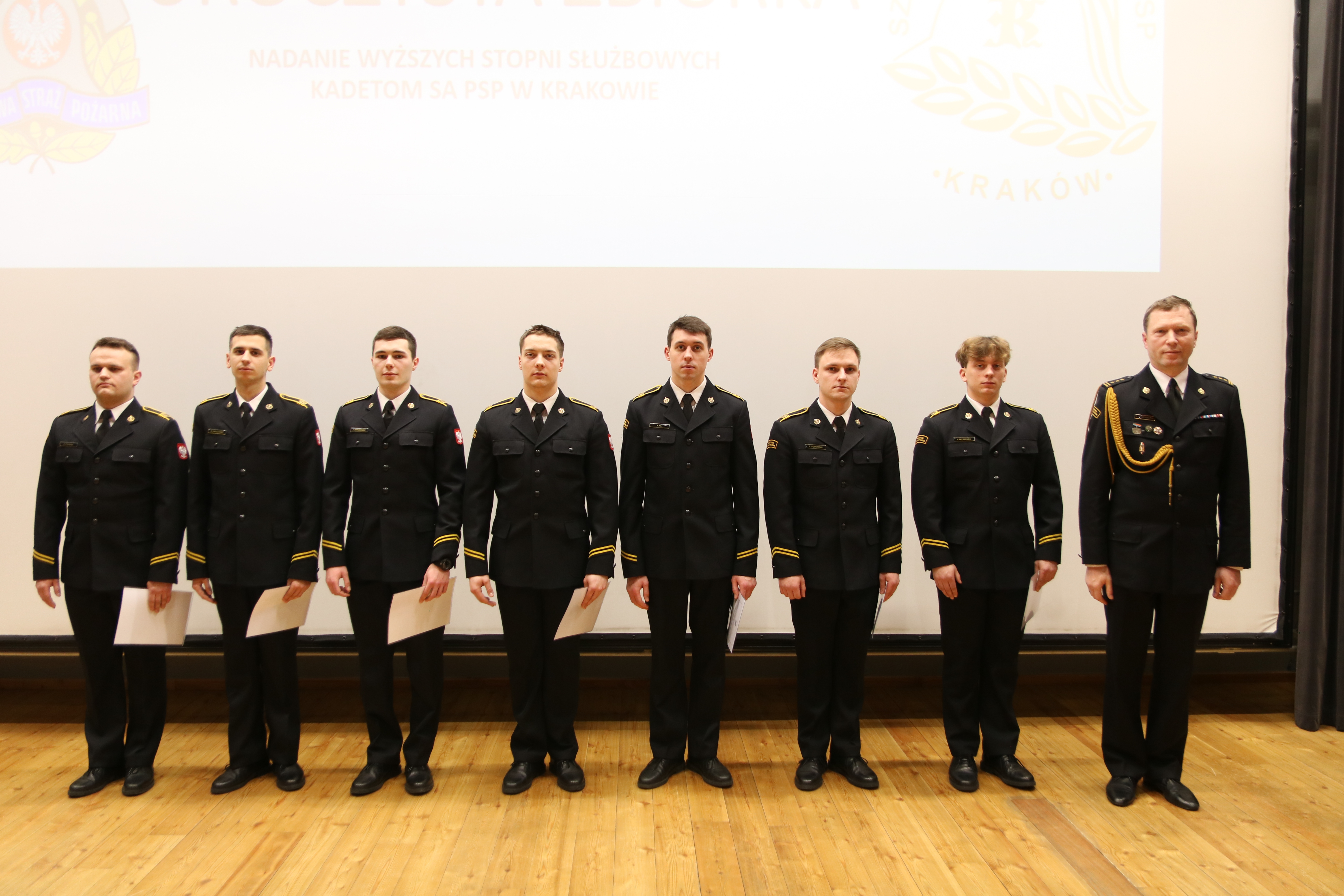 08 lutego 2024 roku w szkolnej auli odbyła się uroczysta zbiórka z okazji wręczenia aktów nadania wyższych stopni służbowych kadetkom i kadetom I oraz II kompanii XXXII i XXXIII turnusu kształcenia dziennego Szkoły Aspirantów Państwowej Straży Pożarnej w Krakowie. Za osiągnięcie bardzo dobrych wyników w nauce i wzorowe pełnienie służby w czasie I i III semestru wyróżnione zostały 23 osobowy.