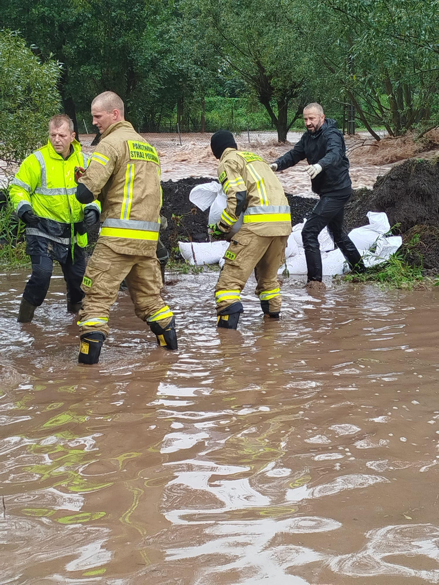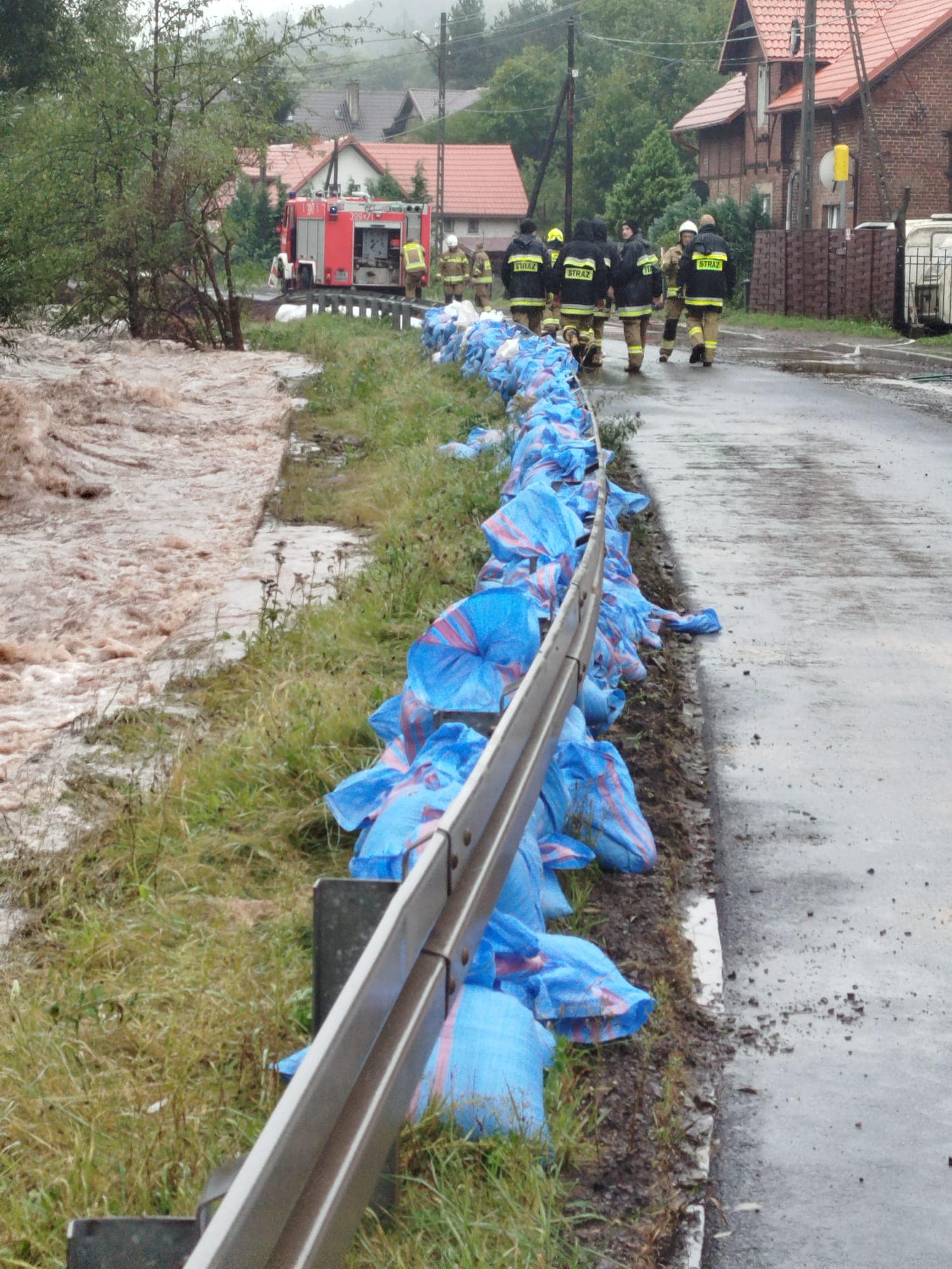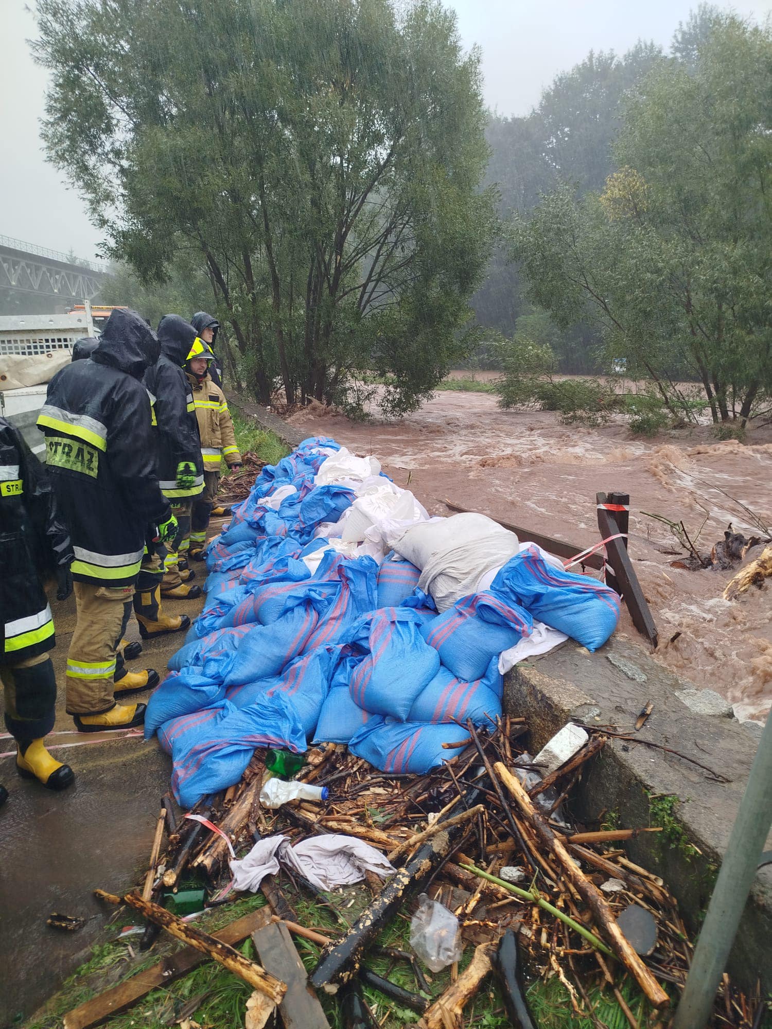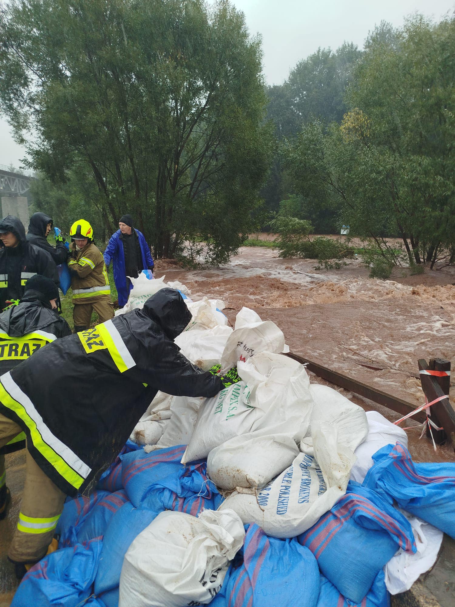 W dniu dzisiejszym działania kadetów Szkoły Aspirantów PSP w Poznaniu w ramach Centralnego Odwodu Operacyjnego skupiają się na umacnianiu brzegów rzeki Bystrzyca Kłodzka w miejscowości Jedlina k. Wałbrzycha.