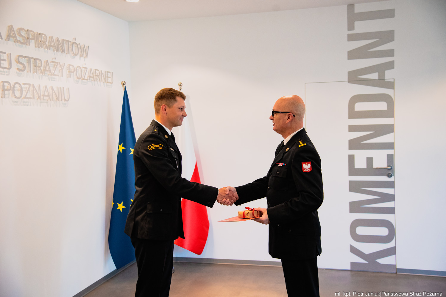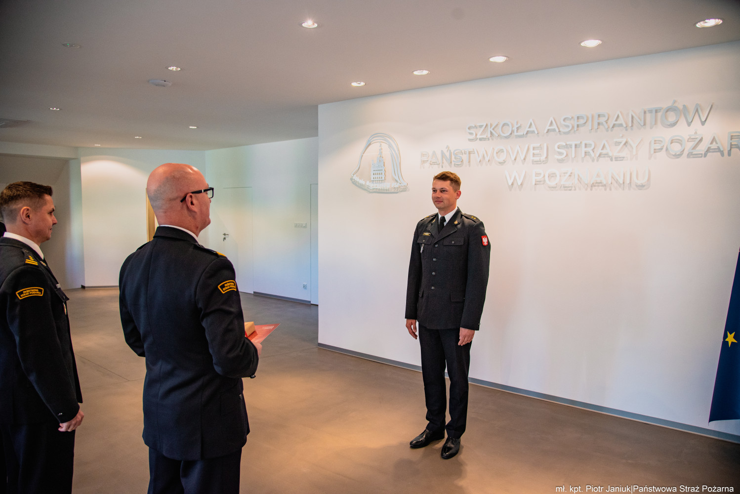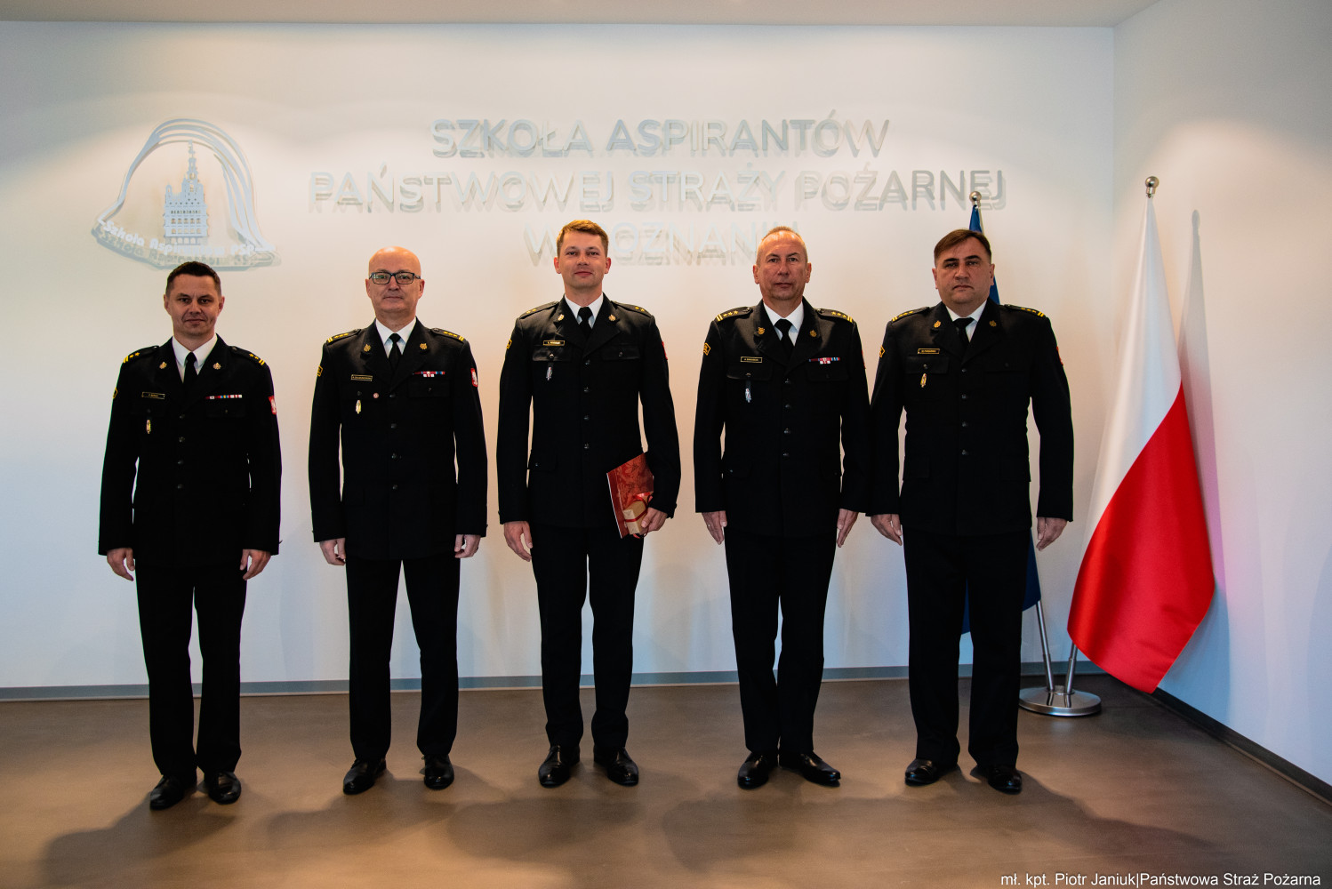 W dniu 13 maja 2025 roku w Szkole Aspirantów Państwowej Straży Pożarnej w Poznaniu odbyło się spotkanie, podczas którego Komendant Szkoły, st. bryg. Andrzej Zajączkowski, wraz ze swoimi zastępcami, st. bryg. Arturem Banasiakiem oraz bryg. Przemysławem Berusem, złożyli gratulacje mł. kpt. Łukaszowi Rodziakowi z okazji uzyskania stopnia oficerskiego.