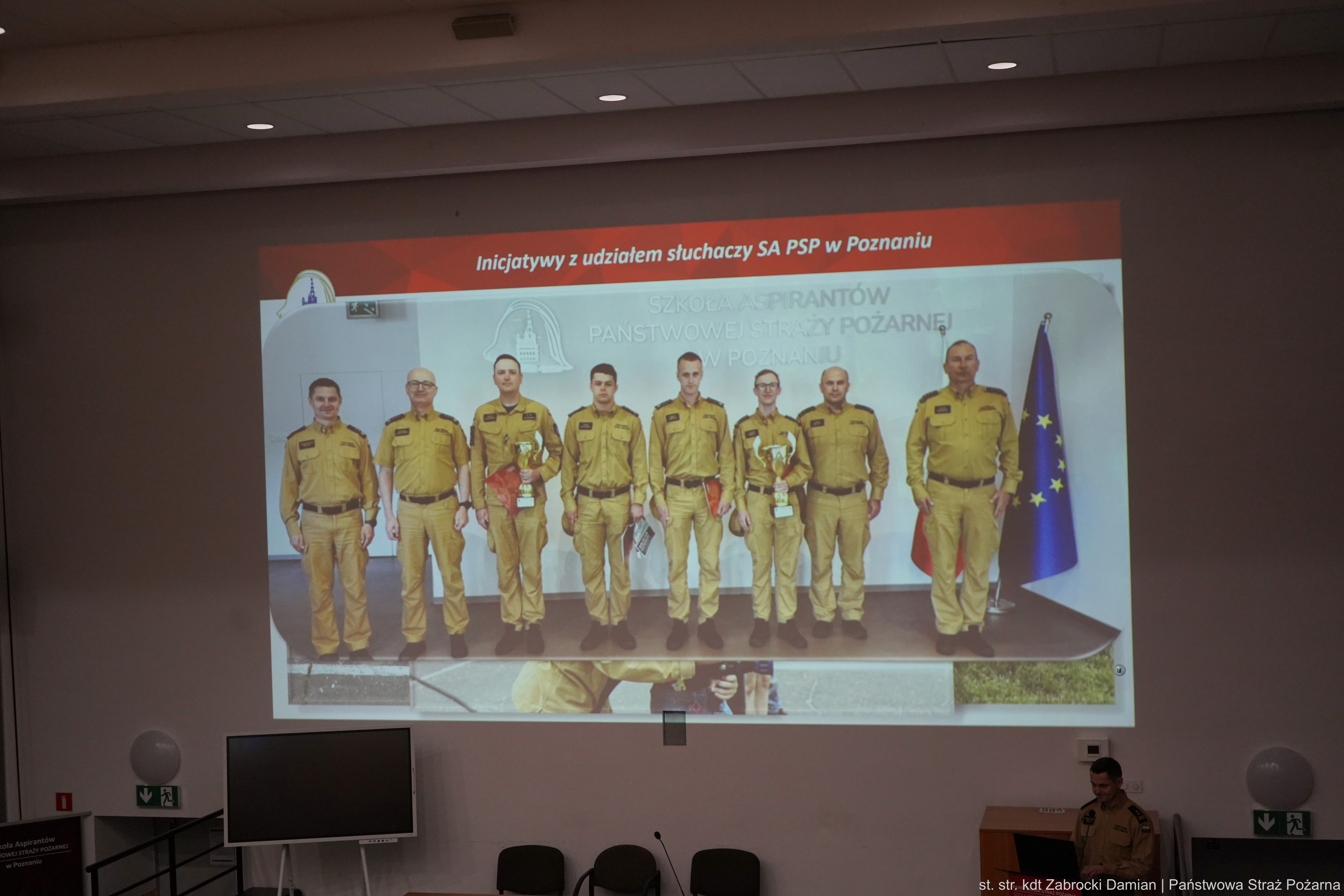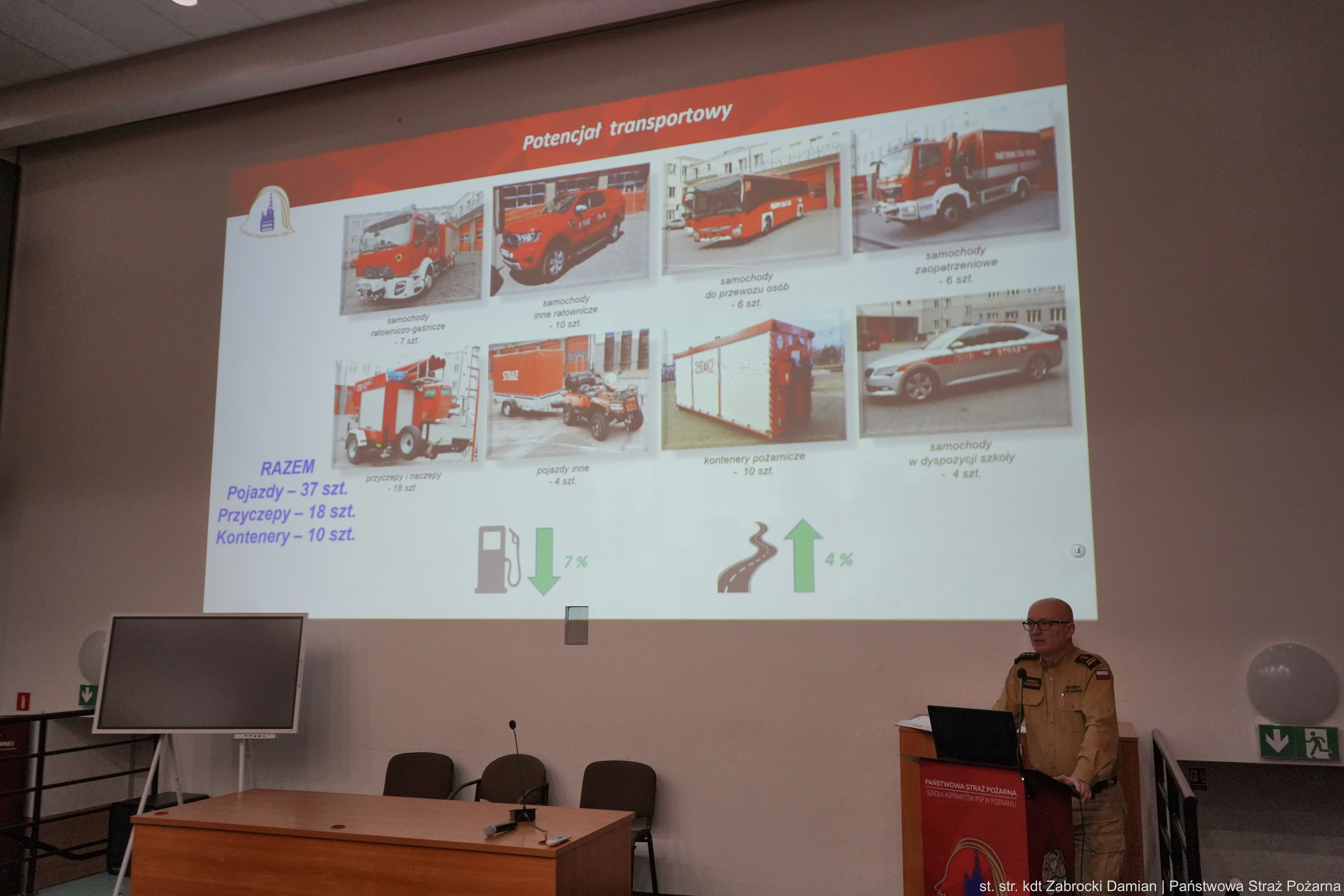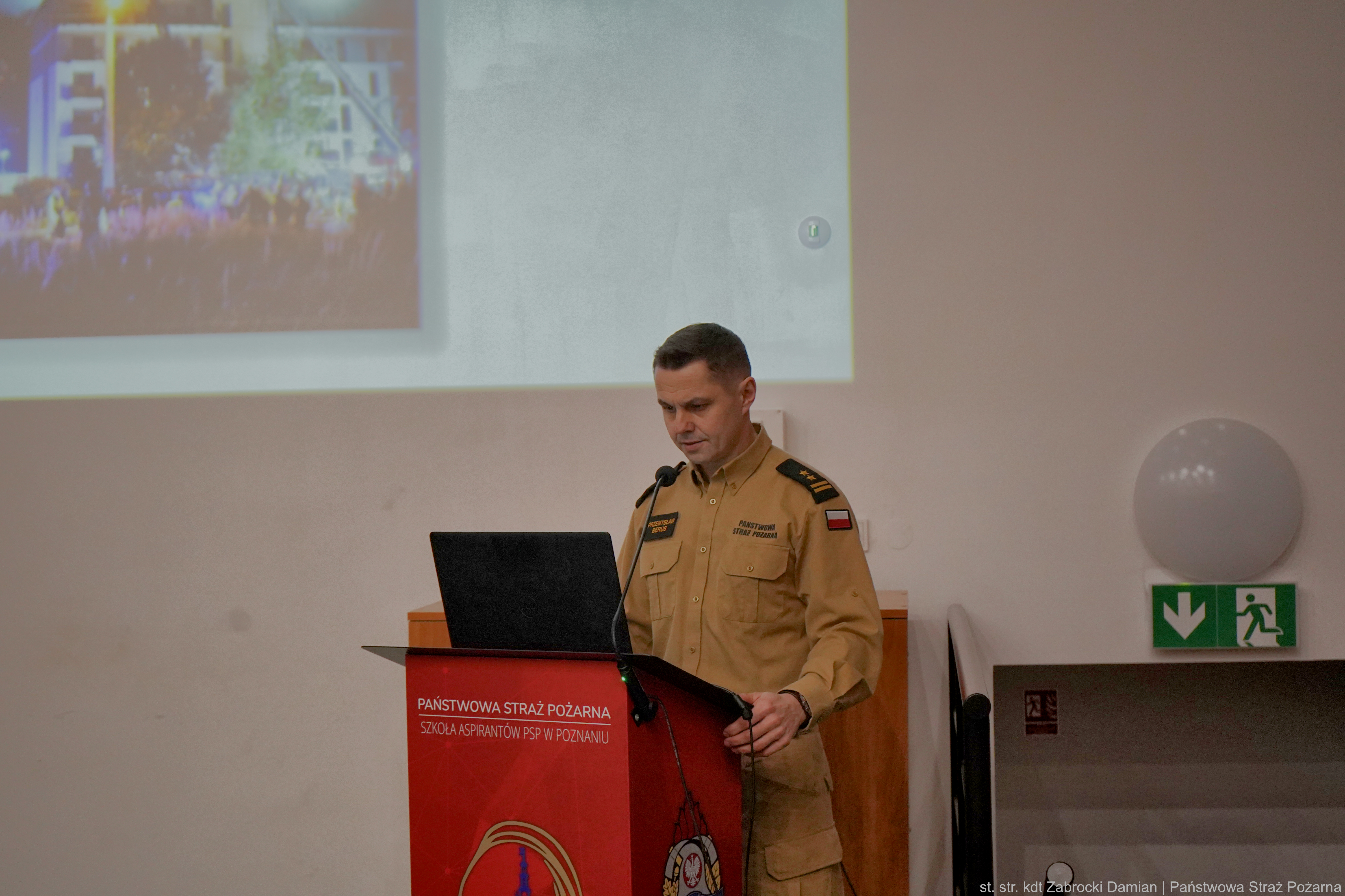 Następnie głos zabrał Zastępca Komendanta Szkoły bryg. Przemysław Berus, który skoncentrował się na zagadnieniach związanych z działalnością szkoleniową, prewencją społeczną oraz organizacją seminariów i konferencji. Przedstawił również funkcjonowanie Szkolnej Jednostki Ratowniczo-Gaśniczej, omawiając liczbę oraz charakter zdarzeń, w których brała ona udział. Podkreślił znaczenie regularnych szkoleń w procesie przygotowania przyszłych adeptów pożarnictwa do pełnienia służby.
