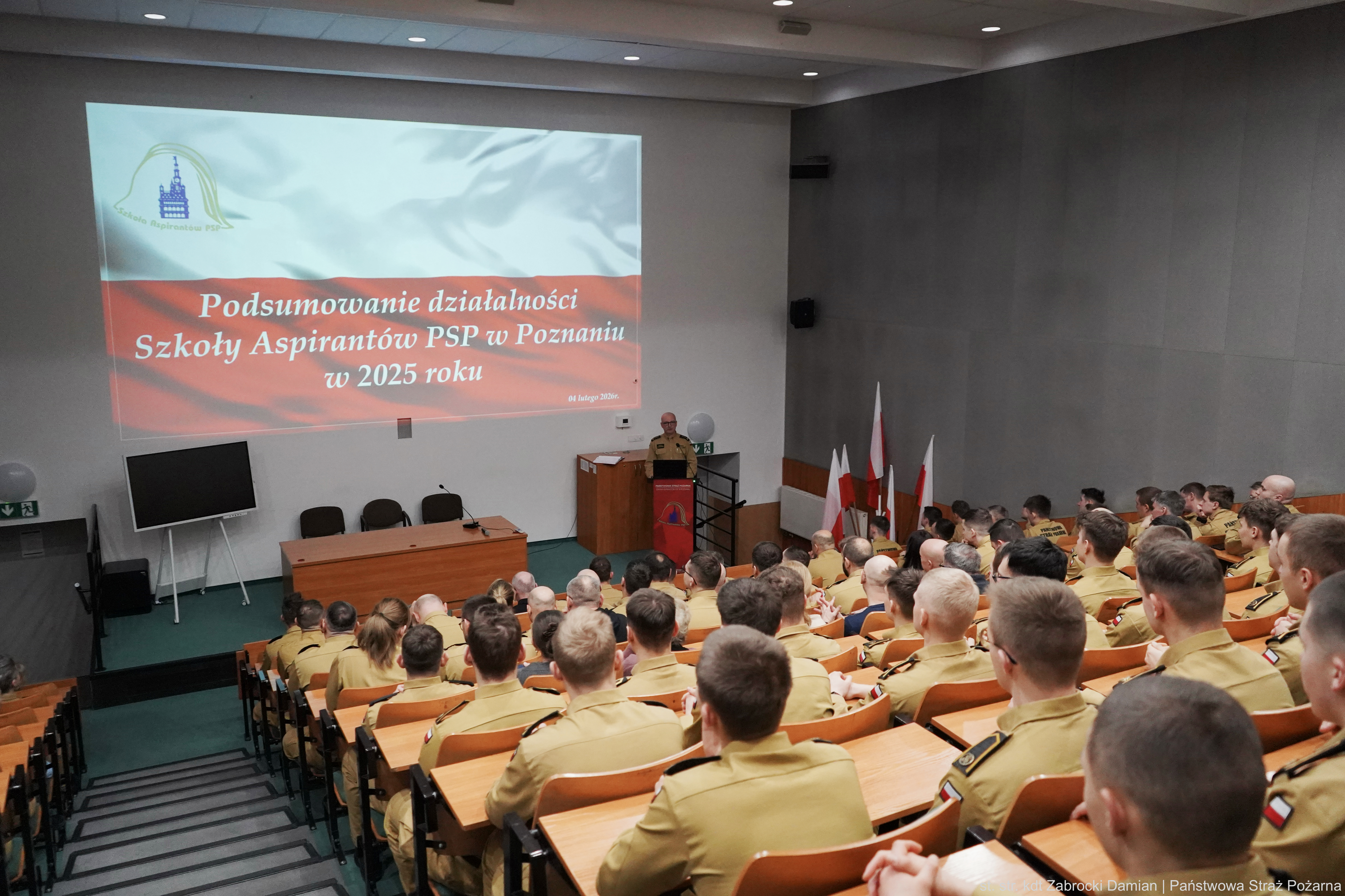 W dniu 4 lutego 2026 roku w Szkole Aspirantów Państwowej Straży Pożarnej w Poznaniu odbyła się coroczna narada roczna, podczas której dokonano podsumowania działalności w 2025 roku oraz określono główne kierunki jej dalszego rozwoju. W wydarzeniu uczestniczyło kierownictwo Szkoły oraz zaproszeni goście, wśród których znaleźli się Zastępca Komendanta Głównego PSP nadbryg. Paweł Frysztak oraz Zastępca Wielkopolskiego Komendanta Wojewódzkiego PSP st. bryg. Tomasz Grelak.