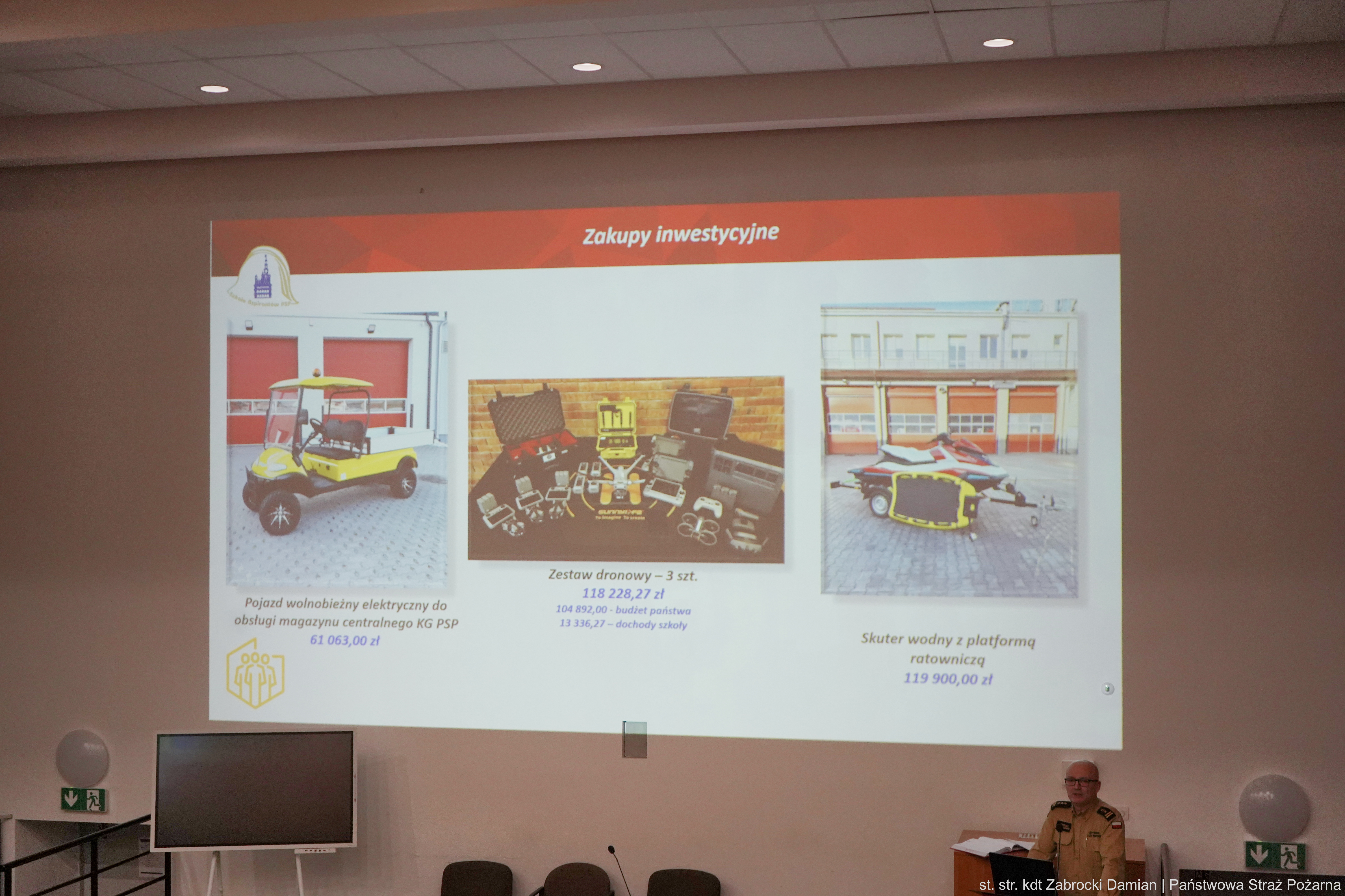 Komendant przedstawił także informacje dotyczące inwestycji zrealizowanych w 2025 roku, w tym m.in. rozbudowę budynku socjalno-garażowego oraz przebudowę hali magazynowej na potrzeby Centralnego Magazynu Komendanta Głównego PSP na szkolnym poligonie pożarniczym, a także przebudowę pomieszczeń II piętra wraz z klatkami schodowymi budynku internatu. Omówił również realizację zadań związanych z doposażeniem jednostki w środki ochrony indywidualnej, odzież specjalną oraz wyposażenie na potrzeby ochrony ludności i obrony cywilnej. Wspomniał o licznych remontach prowadzonych na terenie Szkoły oraz o zakupach pojazdów i sprzętu transportowego, których celem było zwiększenie mobilności jednostki oraz poprawa warunków szkolenia.