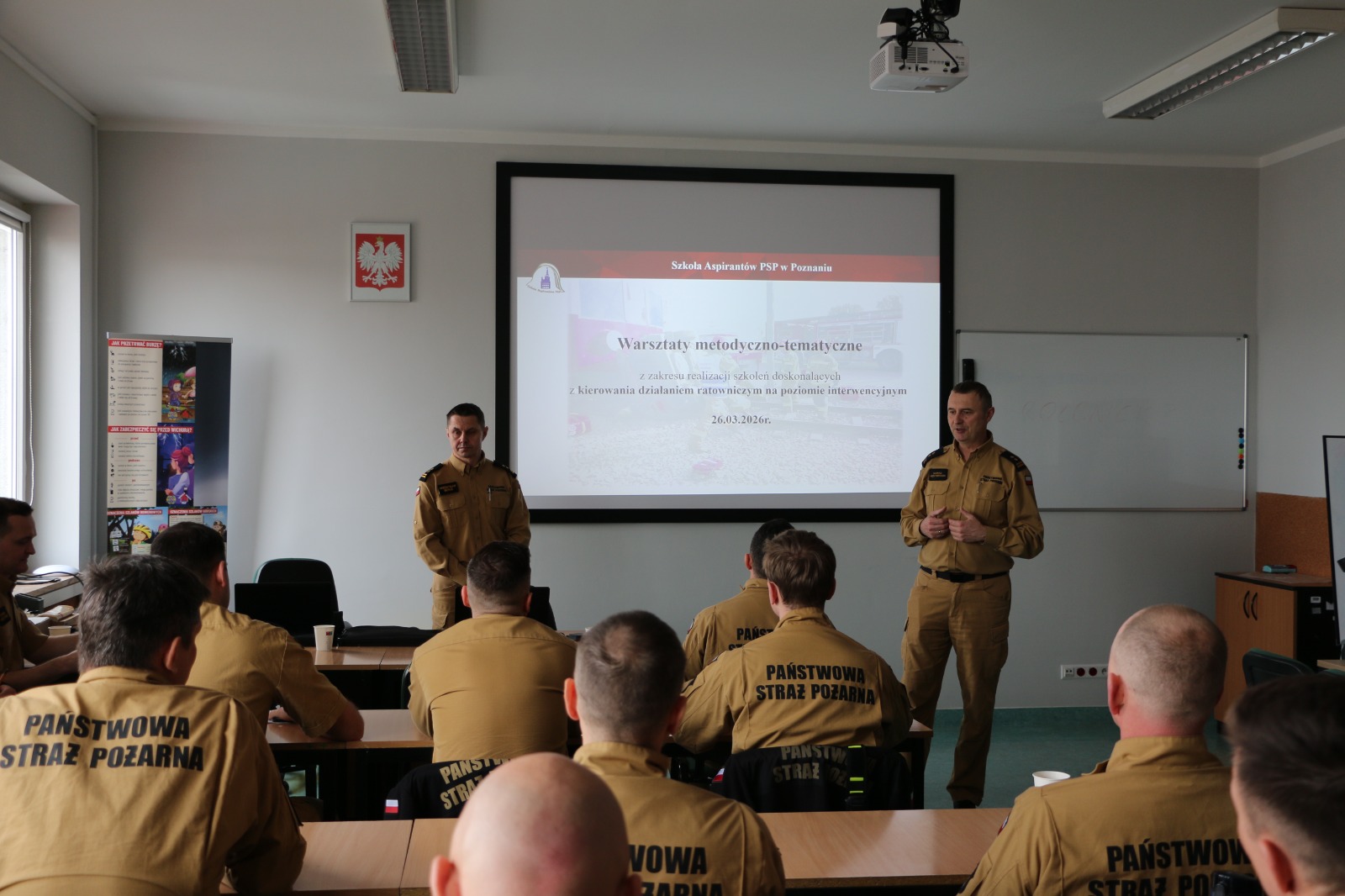 W dniu 26 marca 2026 r. odbyły się w Szkole Aspirantów Państwowej Straży Pożarnej w Poznaniu, pierwsze warsztaty metodyczno – tematyczne z zakresu realizacji szkoleń doskonalących z kierowania działaniem ratowniczym na poziomie interwencyjnym.