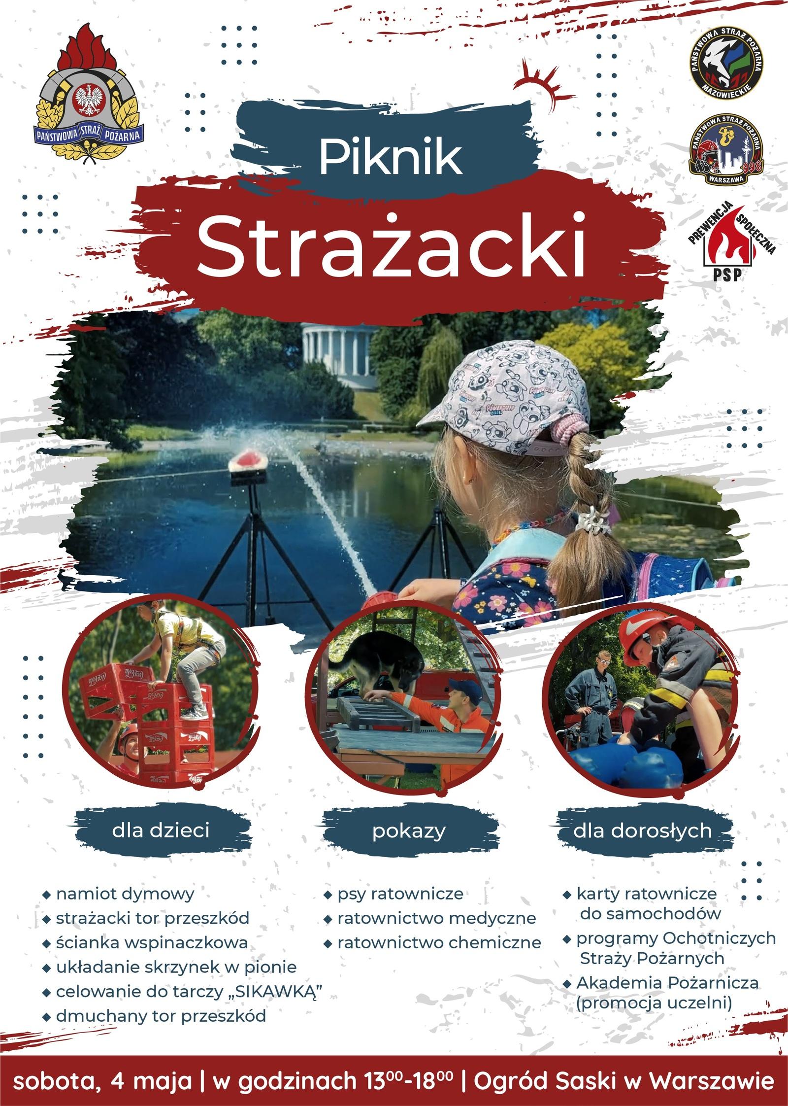 W dniu 4 maja br. od godz. 13.00 do 18.00 zapraszamy całe rodziny do odwiedzenia Pikniku Strażackiego w Ogrodzie Saskim w Warszawie, podczas którego przygotowane będzie wiele atrakcji dla dzieci, ale również dorosłych, m.in.: namiot dymowy, strażacki tor przeszkód, celowanie do tarczy ,,SIKAWKĄ", pokazy psów ratowniczych, pokazy ratownictwa medycznego i chemicznego, program OSP i wiele innych.