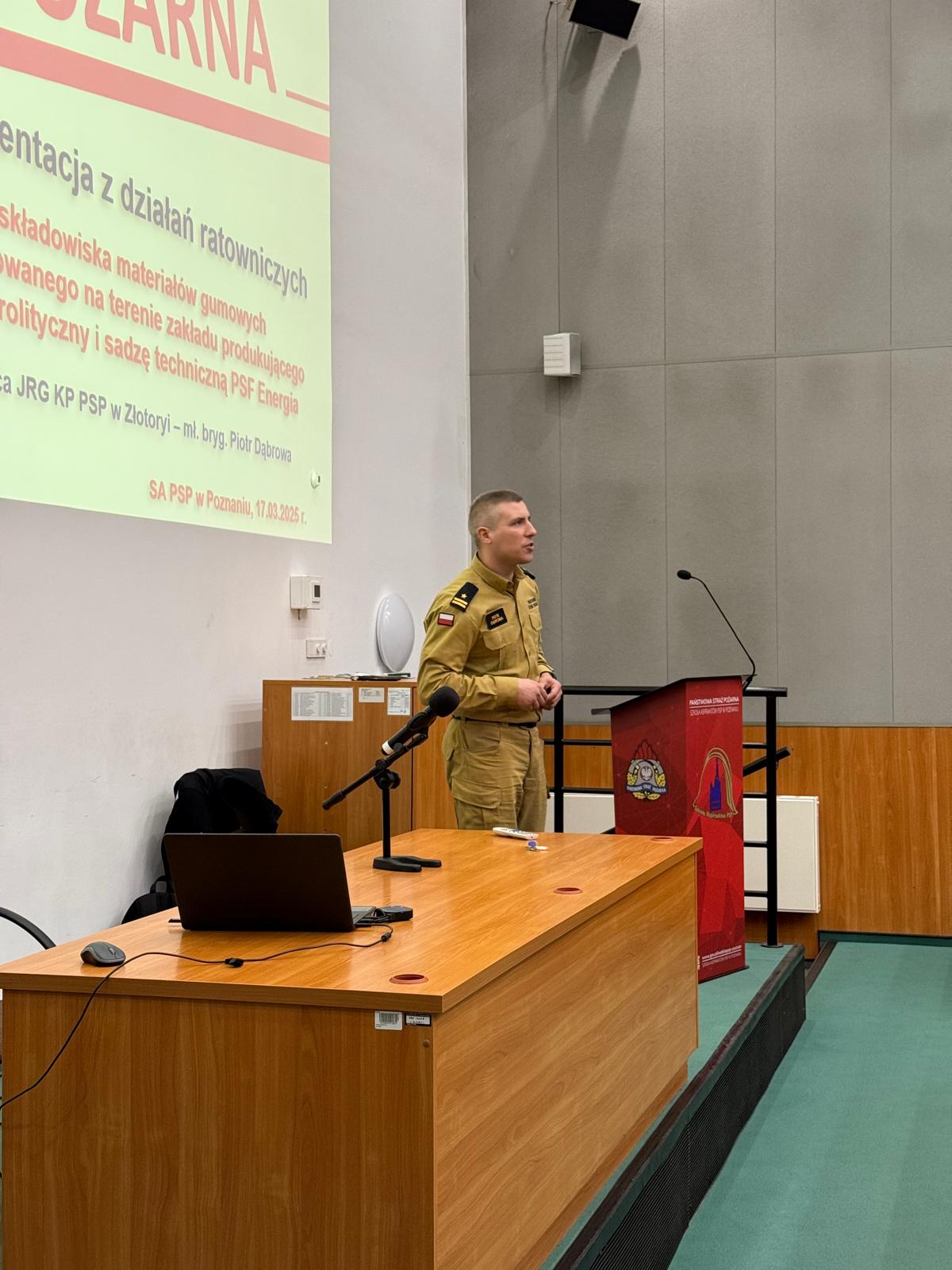W dniu 17.03.2025r. w SA PSP w Poznaniu zorganizowano prelekcję na temat organizacji działań ratowniczych podczas gaszenia pożaru składowiska materiałów gumowych. Prelekcję w formie sprawozdawczego studium przypadków przeprowadził mł. bryg. Piotr Dąbrowa, Dowódca JRG z KP PSP w Złotoryi, który na przykładzie zdarzenia, w którym brał udział omówił uczestnikom zajęć okoliczności wypracowywania decyzji dowódczych, kierowania działaniem ratowniczym z pełną konsekwencją wdrażanych praw i uprawnień władczych podczas gaszenia trwającego kilkanaście dni pożaru składowiska materiałów gumowych usytuowanego na terenie zakładu produkującego olej pirolityczny i sadzę techniczną.