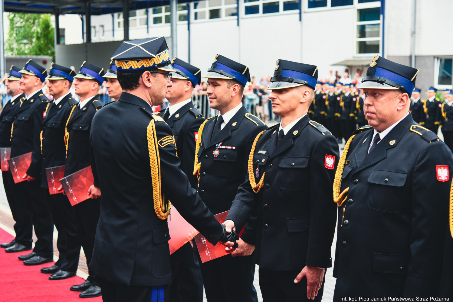 Komendant Główny PSP, nadbryg. Wojciech Kruczek, w swoim wystąpieniu pogratulował awansowanym funkcjonariuszom oraz odniósł się do rosnącego zakresu zadań powierzanych jednostkom ochrony przeciwpożarowej. Podkreślił, że służba w Państwowej Straży Pożarnej wymaga dziś nie tylko sprawności fizycznej i wiedzy technicznej, ale także empatii, zrozumienia i gotowości do działania w dynamicznych i nieprzewidywalnych sytuacjach. Komendant zwrócił również uwagę na założenia nowej Ustawy o ochronie ludności i obronie cywilnej, wskazując, że zmieniające się uwarunkowania bezpieczeństwa wymagają nowoczesnego podejścia do zarządzania kryzysowego oraz wzmocnienia roli PSP w systemie ochrony ludności. W swoim przemówieniu odniósł się także do obchodzonego w tym roku 30-lecia powołania Krajowego Systemu Ratowniczo-Gaśniczego, przypominając o ogromnym znaczeniu tej formuły współpracy dla skutecznego ratownictwa w Polsce. Zaznaczył, że KSRG nieustannie się rozwija i dziś stanowi fundament narodowego systemu reagowania na zagrożenia, którego skuteczność zależy od wyszkolenia i zaangażowania każdego funkcjonariusza.