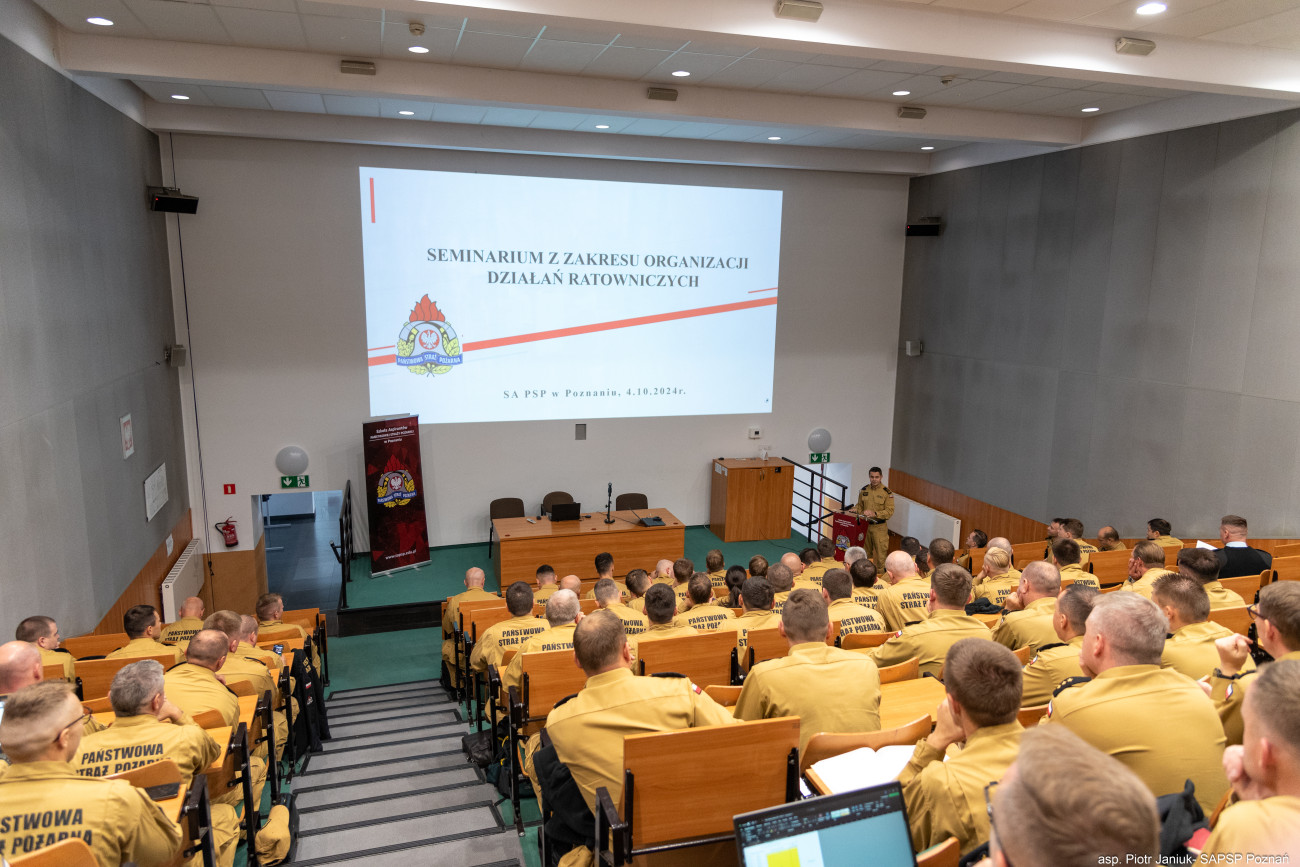 W dniu 4.10.2024r. w Szkole Aspirantów Państwowej Straży Pożarnej w Poznaniu odbyło się seminarium z zakresu „Organizacji działań ratowniczych”. W seminarium uczestniczyli przedstawiciele Komend Wojewódzkich oraz Szkół Państwowej Straży Pożarnej z terenu całego kraju. Podczas wydarzenia poruszano aspekty związane z uregulowaniami formalnoprawnymi związanymi z organizacją akcji oraz działań ratowniczych. Prowadzącymi poszczególne tematy byli według kolejności wystąpień: