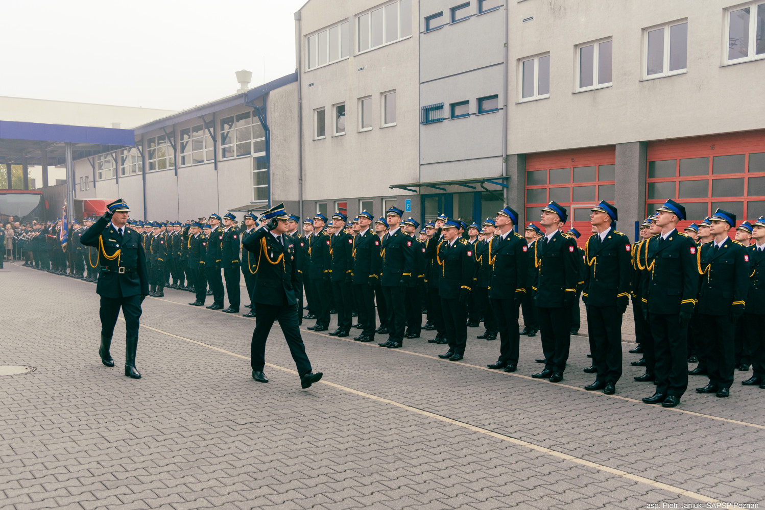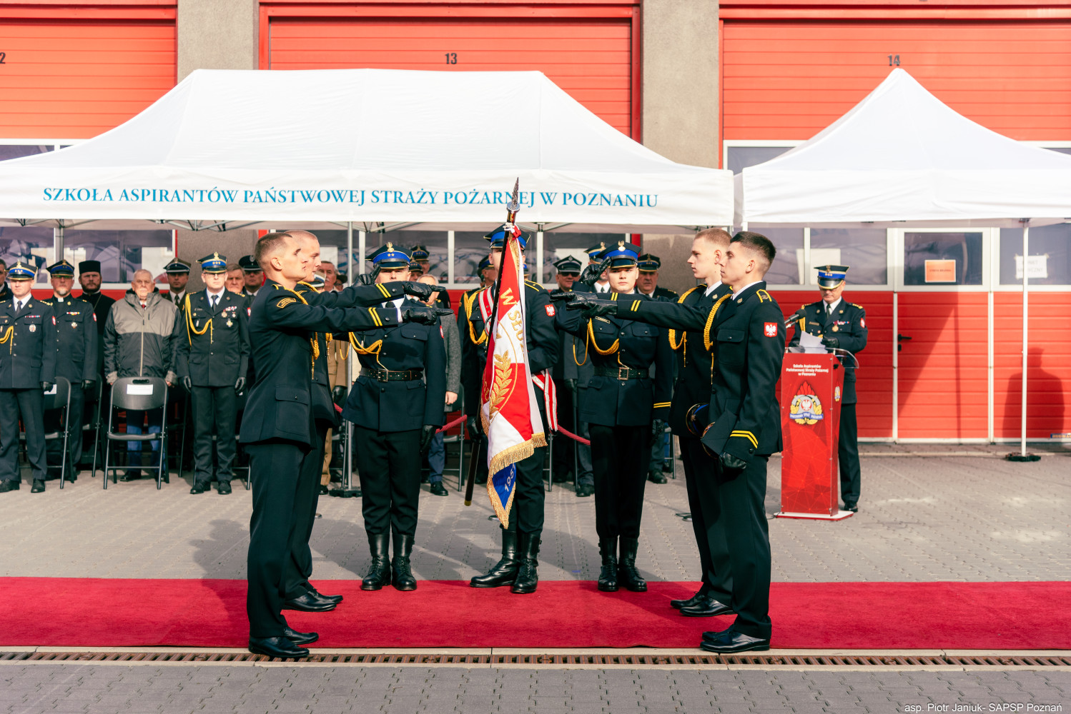 Meldunek o gotowości pododdziałów do apelu złożył st. bryg. mgr inż. Pawłowi Frysztakowi Zastępcy Komendanta Głównego PSP, dowódca uroczystości bryg. Mariusz Międzybrodzki. Przybyłych na uroczystość gości powitał Komendant Szkoły Aspirantów PSP w Poznaniu st. bryg. mgr inż. Andrzej Zajączkowski. W okolicznościowym przemówieniu, komendant podziękował kadrze, pracownikom szkoły, kadetom, słuchaczom oraz wszystkim przyjaciołom Szkoły za lata nauki, służby, pracy na rzecz rozwoju placówki. Komendant podziękował za przybycie przedstawicielom władz państwowych, duchowieństwu oraz służbom mundurowym, podkreślając wagę tego wyjątkowego dnia zarówno dla słuchaczy, jak i całej społeczności szkolnej. Jego słowa wprowadziły podniosły i uroczysty nastrój, stanowiąc wstęp do dalszych wydarzeń tego szczególnego dnia.