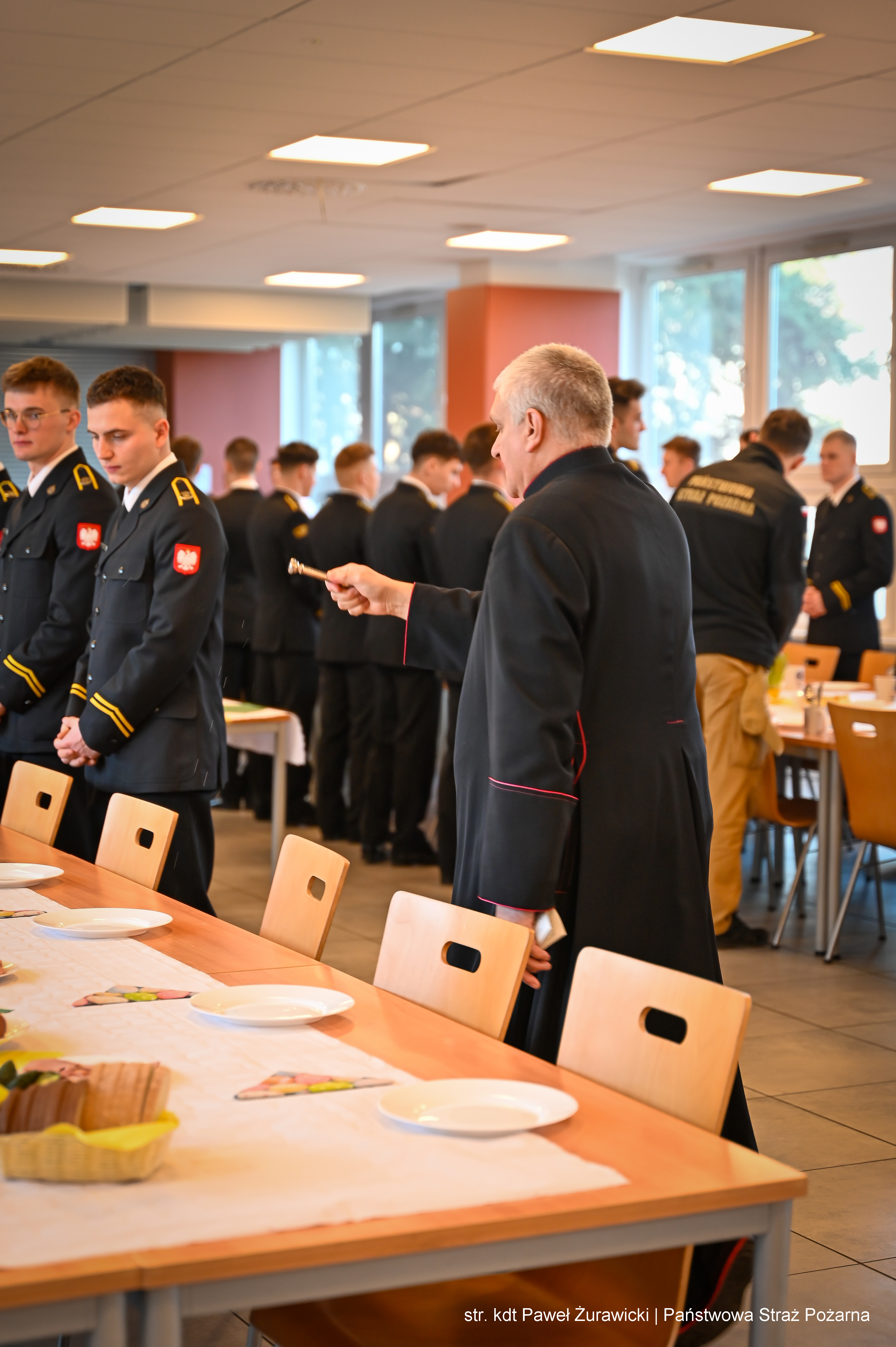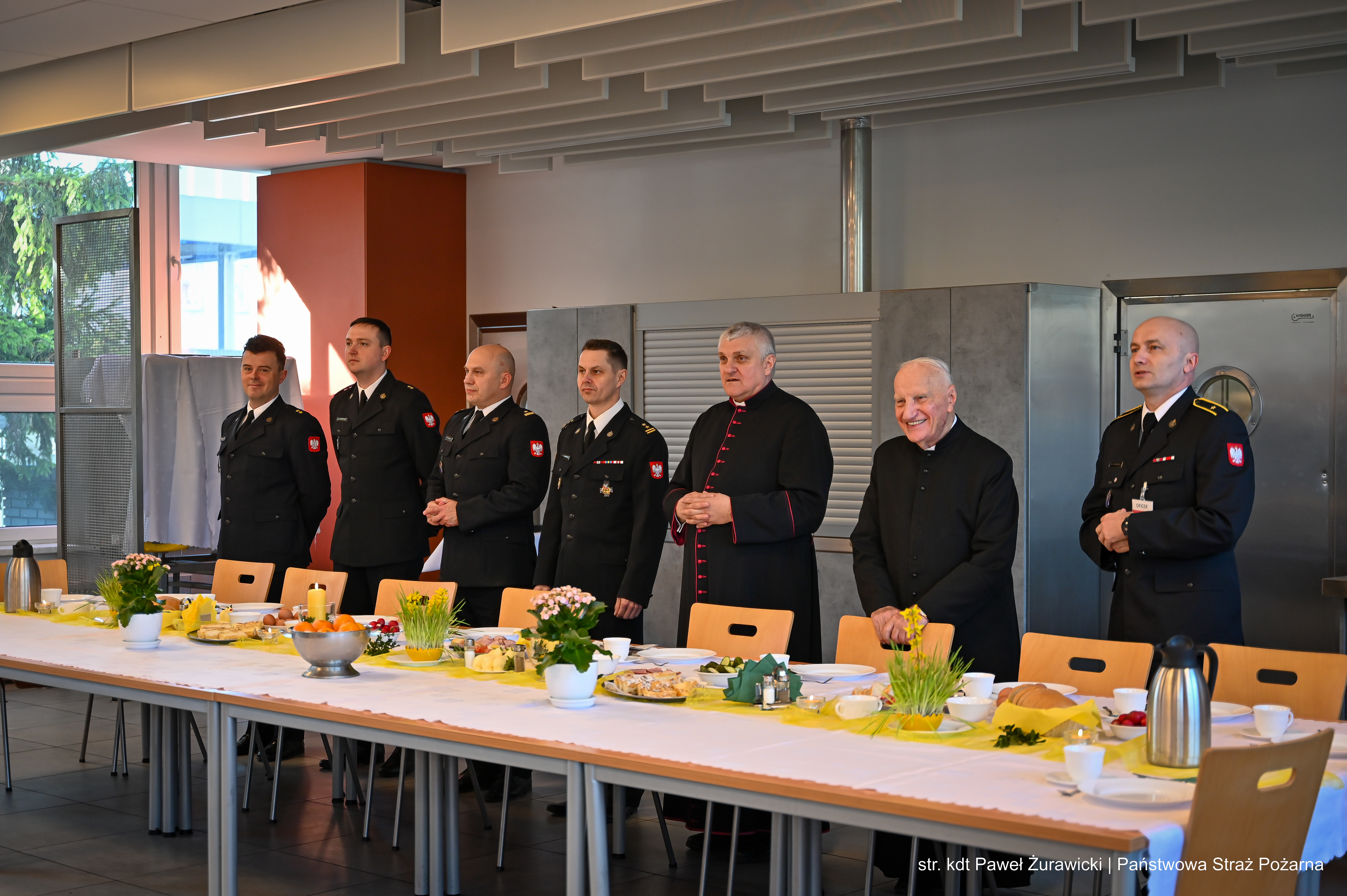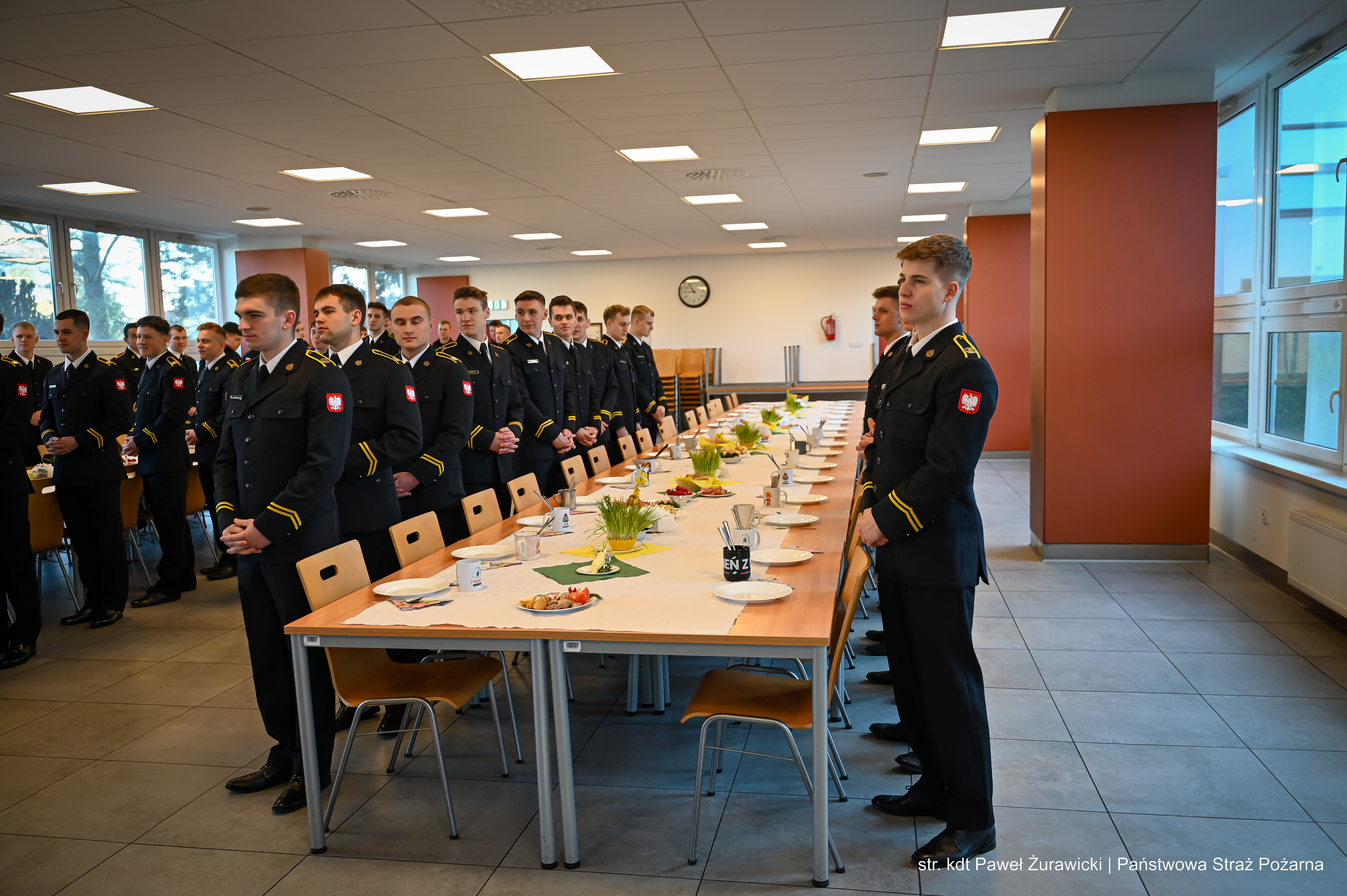 Poranek w Niedzielę Zmartwychwstania Pańskiego 05 kwietnia br. w Szkole Aspirantów PSP w Poznaniu miał wyjątkowy charakter. Do wspólnego śniadania przy wielkanocnym stole zasiadł Zastępca Komendanta Szkoły – bryg. Przemysław Berus wraz z funkcjonariuszami z Wydziału Pododdziałów Szkolnych oraz ze Szkolnej Jednostki Ratowniczo – Gaśniczej, a także z kadetami, którzy w świątecznej przerwie zostali w Szkole, aby zachować ciągłość operacyjną. Swoją obecnością zaszczycili nas również księża proboszczowie z poznańskiej Parafii pw. Świętej Trójcy – ks. prałat Stanisław Wojtaszek oraz ks. kan. Marek Matyba, który po poświęceniu pokarmów oraz wspólnej modlitwie złożyli wszystkim zebranym oraz ich bliskim najserdeczniejsze życzenia.