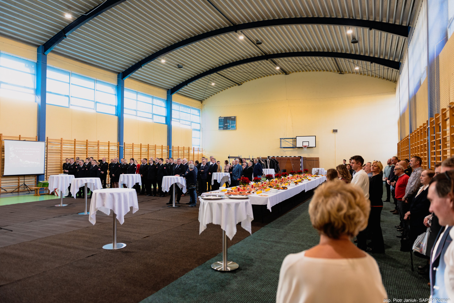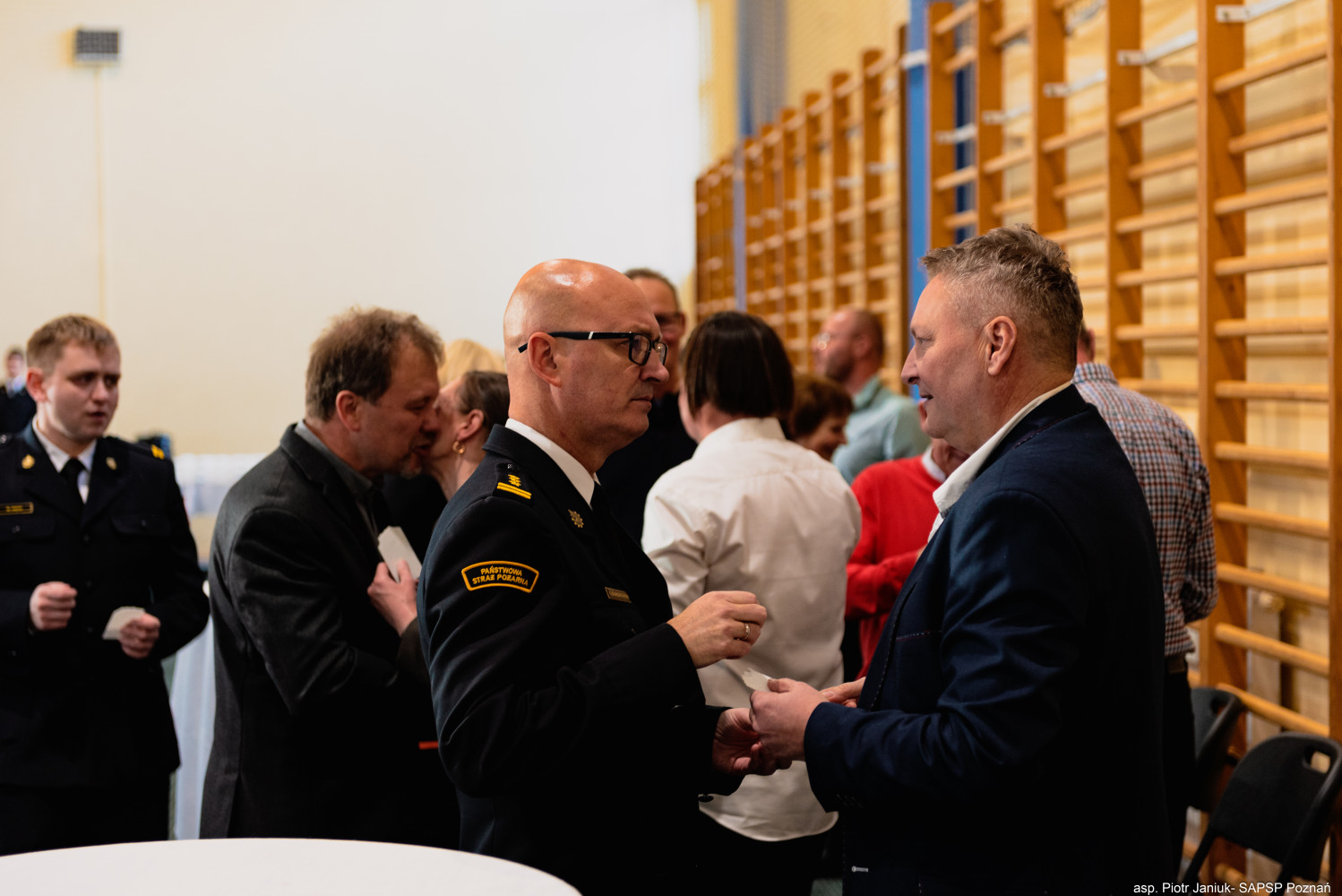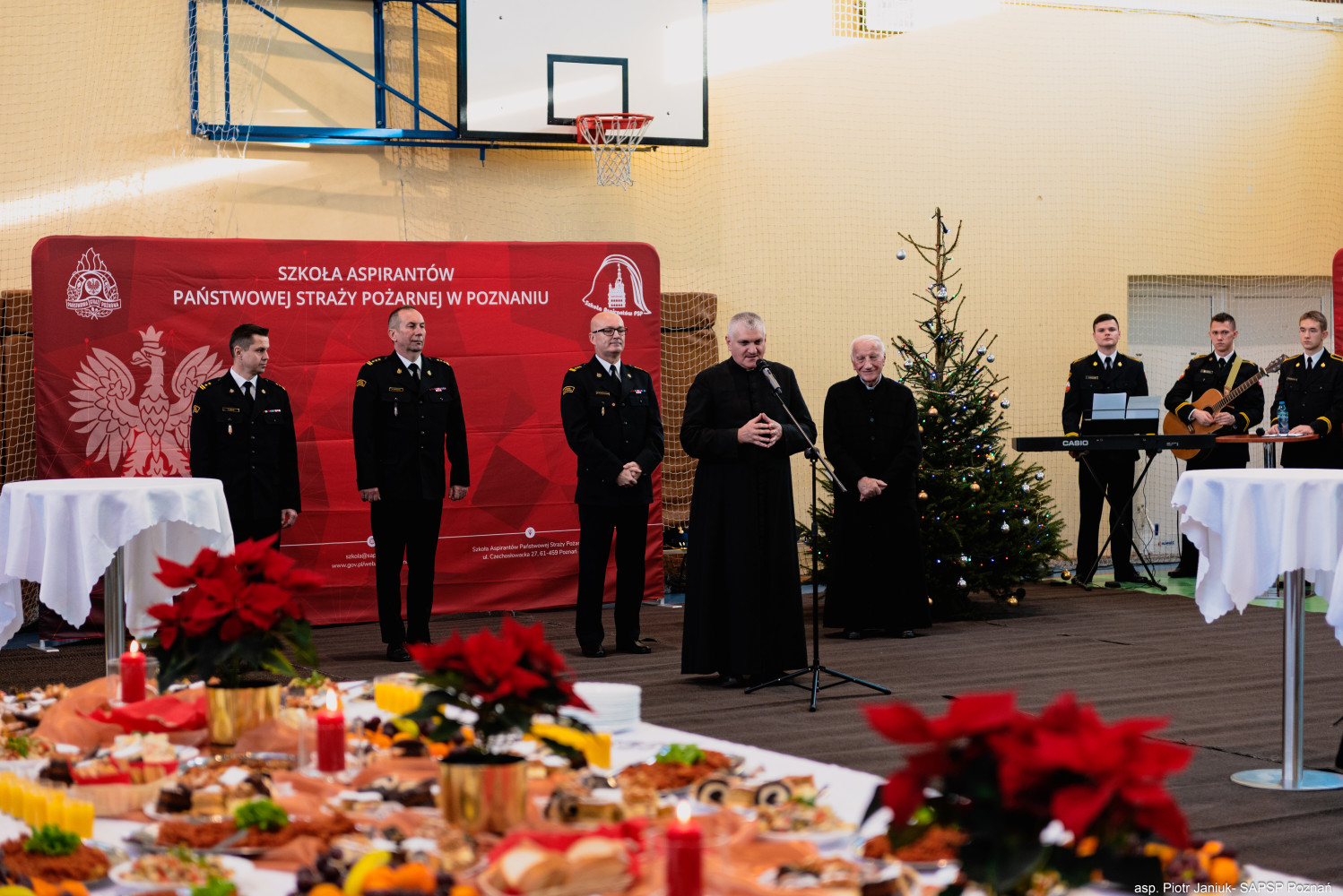 Spotkanie opłatkowe to wydarzenie, które ma miejsce przed Świętami Bożego Narodzenia i zarówno jak te święta, ma zachęcić ludzi do spędzania czasu z rodziną, bliskimi i przyjaciółmi, do składania życzeń i dzielenia się opłatkiem. Opłatek jest symbolem pojednania, dlatego należy przełamać się im, aby zjednoczyć się z obecnymi – jest to dawna tradycja katolicka towarzysząca Bożemu Narodzeniu. 18 grudnia 2024 roku odbyło się spotkanie opłatkowe funkcjonariuszy, pracowników cywilnych oraz zaproszonych gości w Szkole Aspirantów Państwowej Straży Pożarnej w Poznaniu. Komendant Szkoły Aspirantów Państwowej Straży Pożarnej w Poznaniu st. bryg. mgr inż. Andrzej Zajączkowski w imieniu własnym oraz zastępców przekazał wszystkim zebranym oraz ich rodzinom życzenia bożonarodzeniowe i noworoczne. W swoim wystąpieniu podziękował także za zaangażowanie w pracę w ciągu całego, mijającego już roku. Boże błogosławieństwo przekazali obecni na spotkaniu kapłani zaprzyjaźnieni ze Szkołą; ksiądz prałat Stanisław Wojtaszek – kapelan Szkoły oraz ksiądz Marek Matyba, proboszcz parafii pw. Świętej Trójcy na Poznańskim Dębcu. Podczas spotkania odbyło się symboliczne przełamanie opłatkiem.