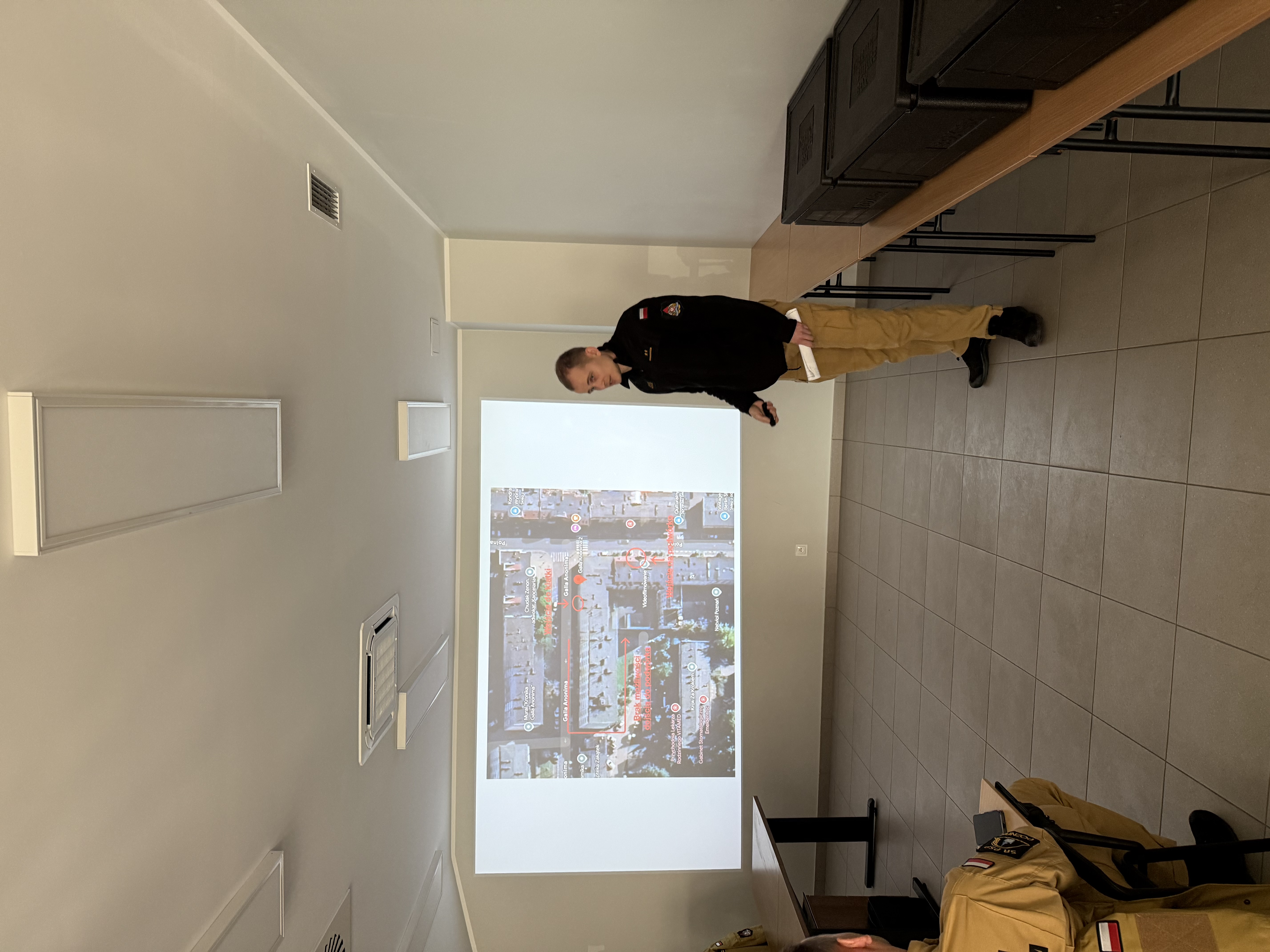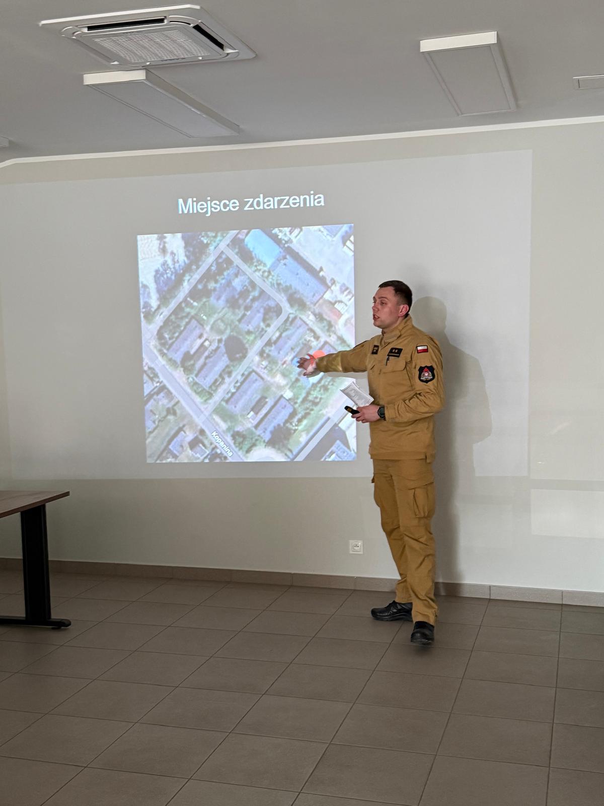 Kolejnym prelegentem był mł. bryg. Sławomir Kozłowski, który zaprezentował zakres zadań związanych z ustalaniem przyczyn powstawania pożarów. Zajęcia obejmowały zarówno część teoretyczną, jak i praktyczną z zakresu czynności dochodzeniowych po zdarzeniach pożarowych.