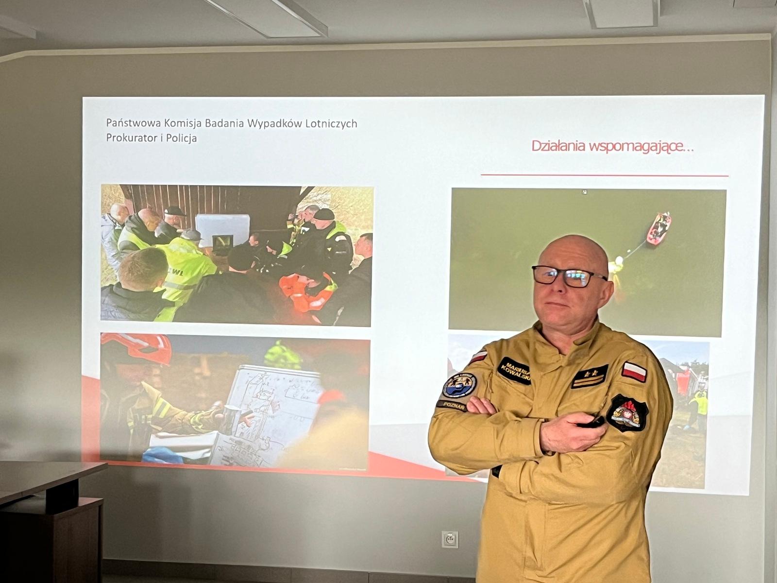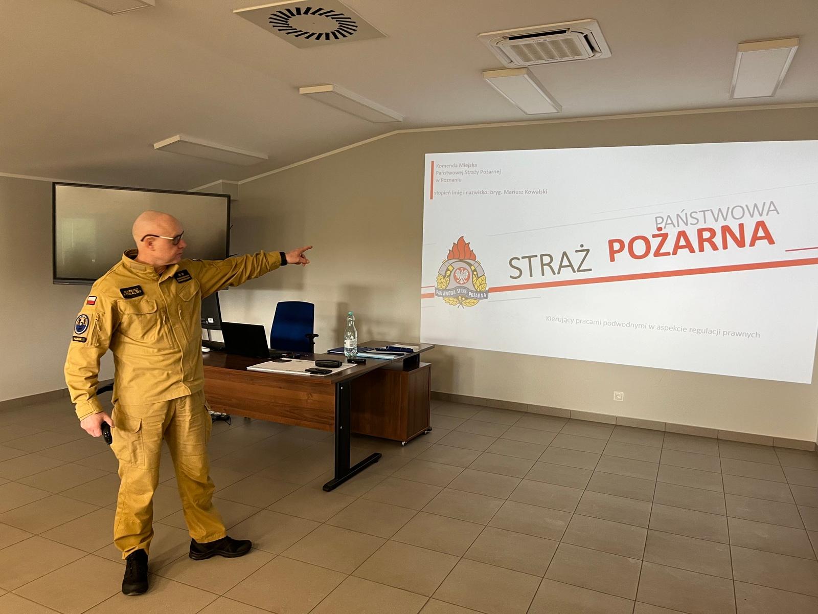 W dniach 25-26.04.2024r., w SA PSP w Poznaniu przeprowadzono szkolenie doskonalące z zakresu kierowania działaniem ratowniczym na poziomie taktycznym. Tematycznie szkolenie ukierunkowane było na analizę formalnoprawnych zagadnień związanych z kierowaniem działaniem ratowniczym, organizację strefy działań oraz właściwe definiowanie władztwa sprawowanego przez kierującego działaniem ratowniczym (KDR). Szkolenie mając na uwadze temat główny jakim było omówienie zagadnień związanych z pełnieniem władztwa na poszczególnych poziomach kierowania ukierunkowane było również na aspekty ratownictwa wodno-nurkowego w KSRG. Uwzględniając tematykę szkolenia poszczególne bloki tematyczne prowadzili odpowiednio bryg. Przemysław Berus - aspekty formalnoprawne związane z kierowaniem działaniem ratowniczym (SA PSP w Poznaniu), bryg. Mariusz Kowalski - tematyka organizacji ratownictwa wodno-nurkowego w KSRG (KM PSP w Poznaniu) oraz mł. kpt. Szymon Pieczyński - korzystanie z prerogatyw władczych oraz źródła odpowiedzialności KDR(KW PSP w Poznaniu). W poszczególnych blokach tematycznych omówiono zakres praw, uprawnień oraz obowiązków przypisanych KDR, doprecyzowano ideę trójpoziomowej struktury kierowania działaniem ratowniczym oraz omówiono na wybranych przykładach stosowanie katalogu uprawnień władczych. Niezwykle istotnym elementem szkolenia była możliwość wymiany doświadczeń z zakresu organizacji działań ratowniczych z dziedziny ratownictwa wodno-nurkowego, co zarówno w aspekcie podstaw prawnych jak i w oparciu o studium przypadków omówione zostało przez prelegentów. Zgodnie z planem szkolenia zrealizowano również jego część praktyczną w postaci przeprowadzenia aplikacyjnych działań ratowniczych, podczas których uczestnicy szkolenia mieli możliwość zweryfikowania przydatności informacji przekazywanych w trakcie zajęć. W szkoleniu uczestniczyli funkcjonariusze PSP z województwa wielkopolskiego, zachodniopomorskiego, pomorskiego oraz lubuskiego łącznie 19 osób, w większości nadzorujący obszar ratownictwa wodno - nurkowego w KSRG w podległych jednostkach organizacyjnych.