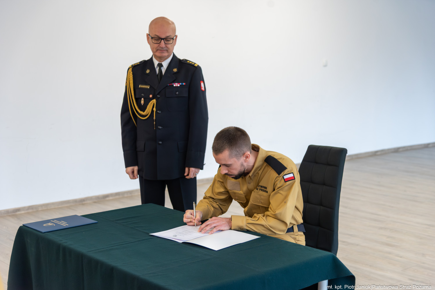 "Ja, obywatel Rzeczypospolitej Polskiej, świadom podejmowanych obowiązków strażaka, uroczyście ślubuję być ofiarnym i mężnym w ratowaniu zagrożonego życia ludzkiego i wszelkiego mienia - nawet z narażeniem życia. Wykonując powierzone mi zadania, ślubuję przestrzegać prawa, dyscypliny służbowej oraz wykonywać polecenia przełożonych. Ślubuję strzec tajemnic związanych ze służbą, a także honoru, godności i dobrego imienia służby oraz przestrzegać zasad etyki zawodowej."