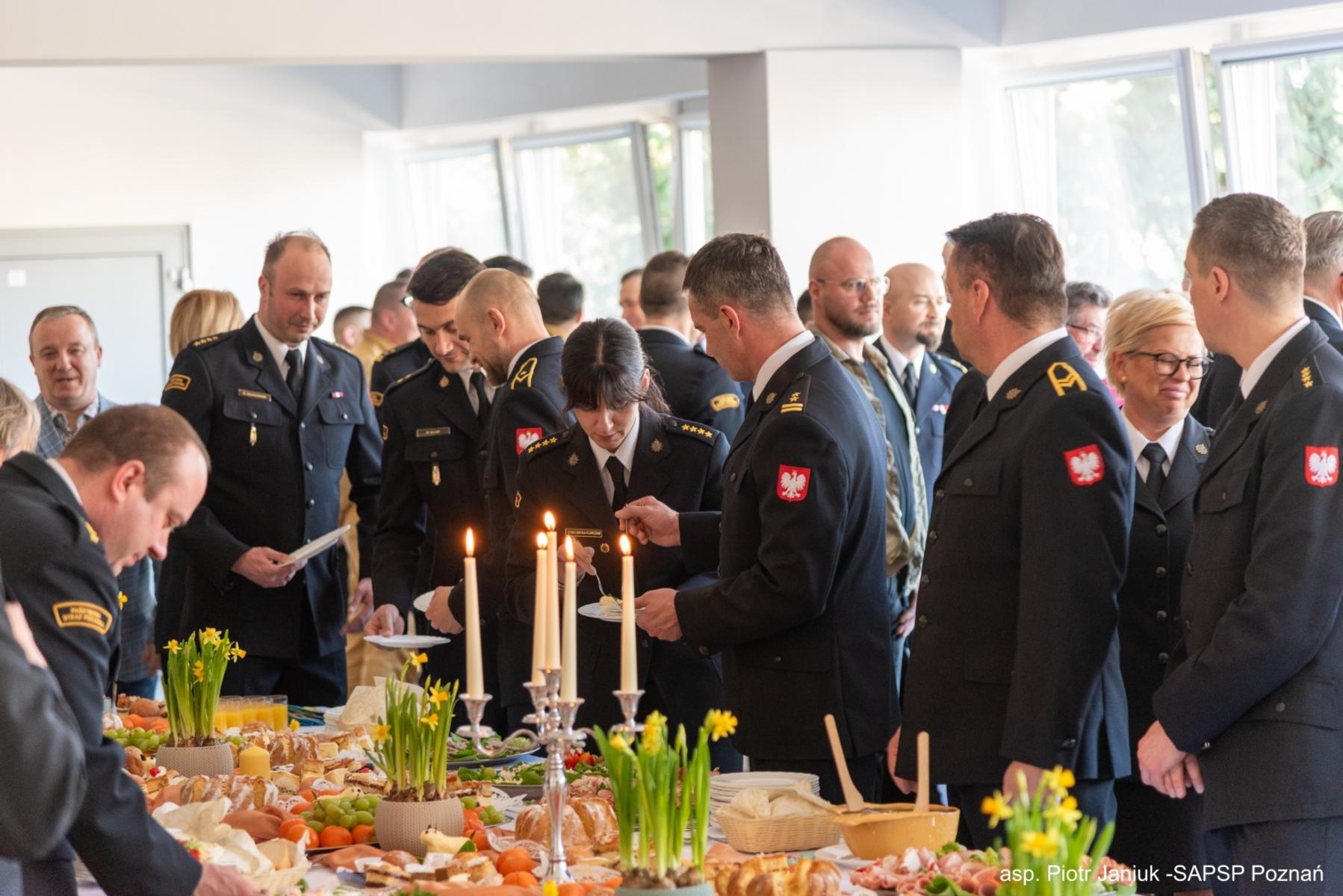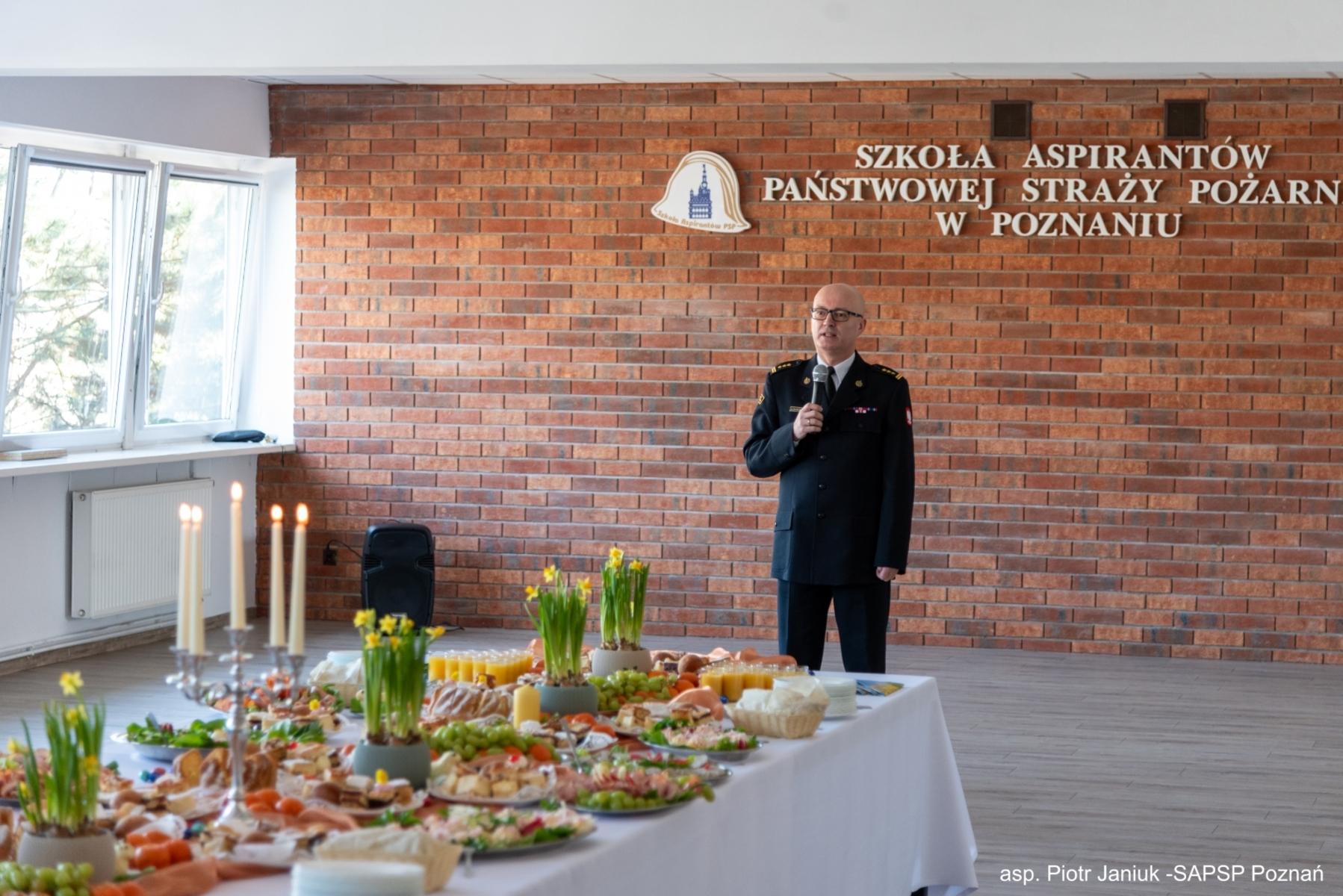W dniu 26.03.2024r., w Szkole Aspirantów Państwowej Straży Pożarnej w Poznaniu, tradycyjnie jak co roku, odbyło się przedświąteczne spotkanie kadry, pracowników cywilnych oraz słuchaczy Szkoły. Spotkanie otworzył p.o. Komendanta Szkoły, st. bryg. Andrzej Zajączkowski wraz z bryg. Przemysławem Berusem, p.o. Zastępcy Komendanta Szkoły, witając wszystkich zebranych. Mając na uwadze świąteczny charakter spotkania uczestniczyli w nim również przedstawiciele duchowieństwa Kościoła Rzymskokatolickiego w osobach księdza Matuesza Droba - Kapelana Wielkopolskich Strażaków oraz Proboszcza parafii pw. "Świętej Trójcy" na poznańskim Dębcu - księdza Marka Matyby. Spotkanie było dobrą okazją do złożenia sobie wzajemnych życzeń oraz spędzenia kilku spokojniejszych chwil pomiędzy codziennymi obowiązkami służbowymi. Korzystając z okazji Komendant SA PSP w Poznaniu złożył wszystkim zebranym jak i tym, których zatrzymały obowiązki służbowe Najserdeczniejsze Życzenia Pomyślności oraz Zdrowia i Szczęścia z okazji zbliżających się Świąt Wielkanocnych.