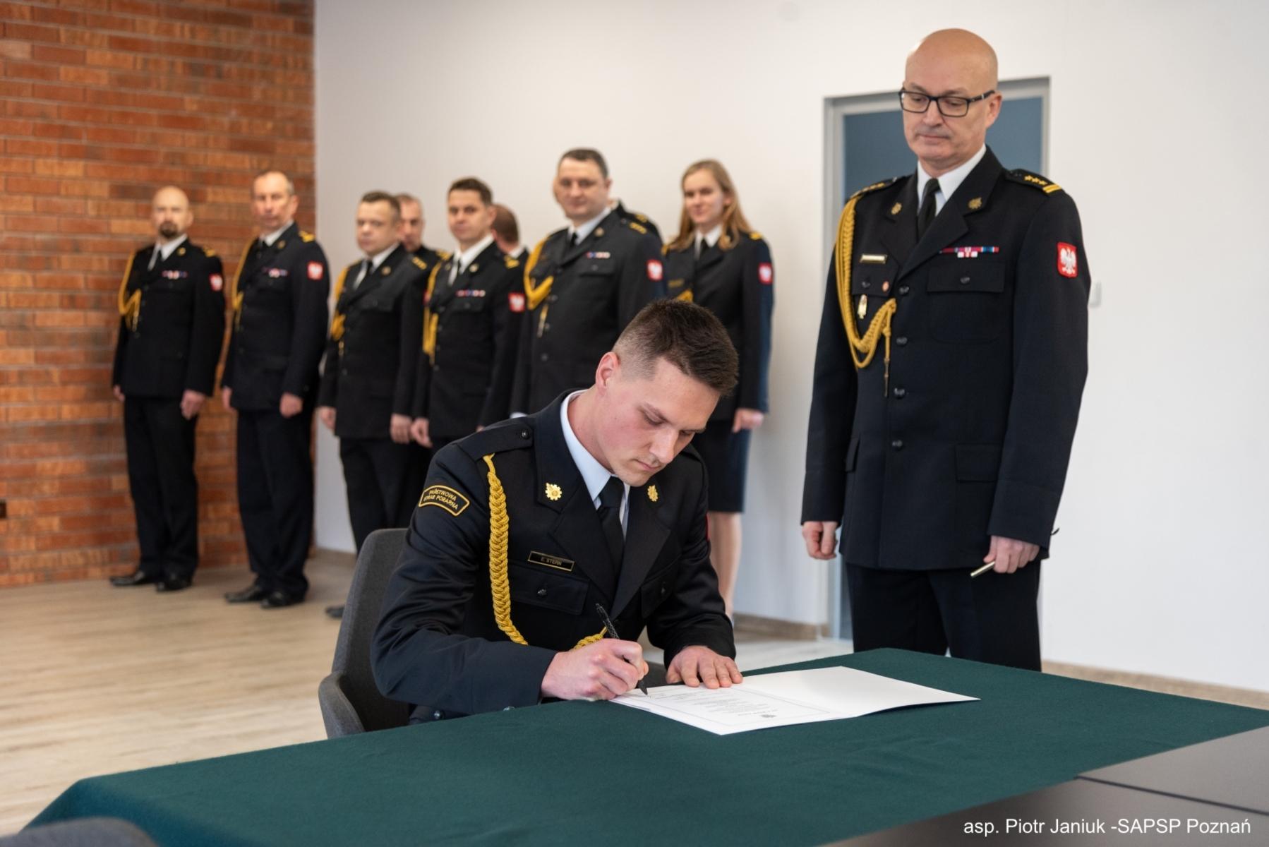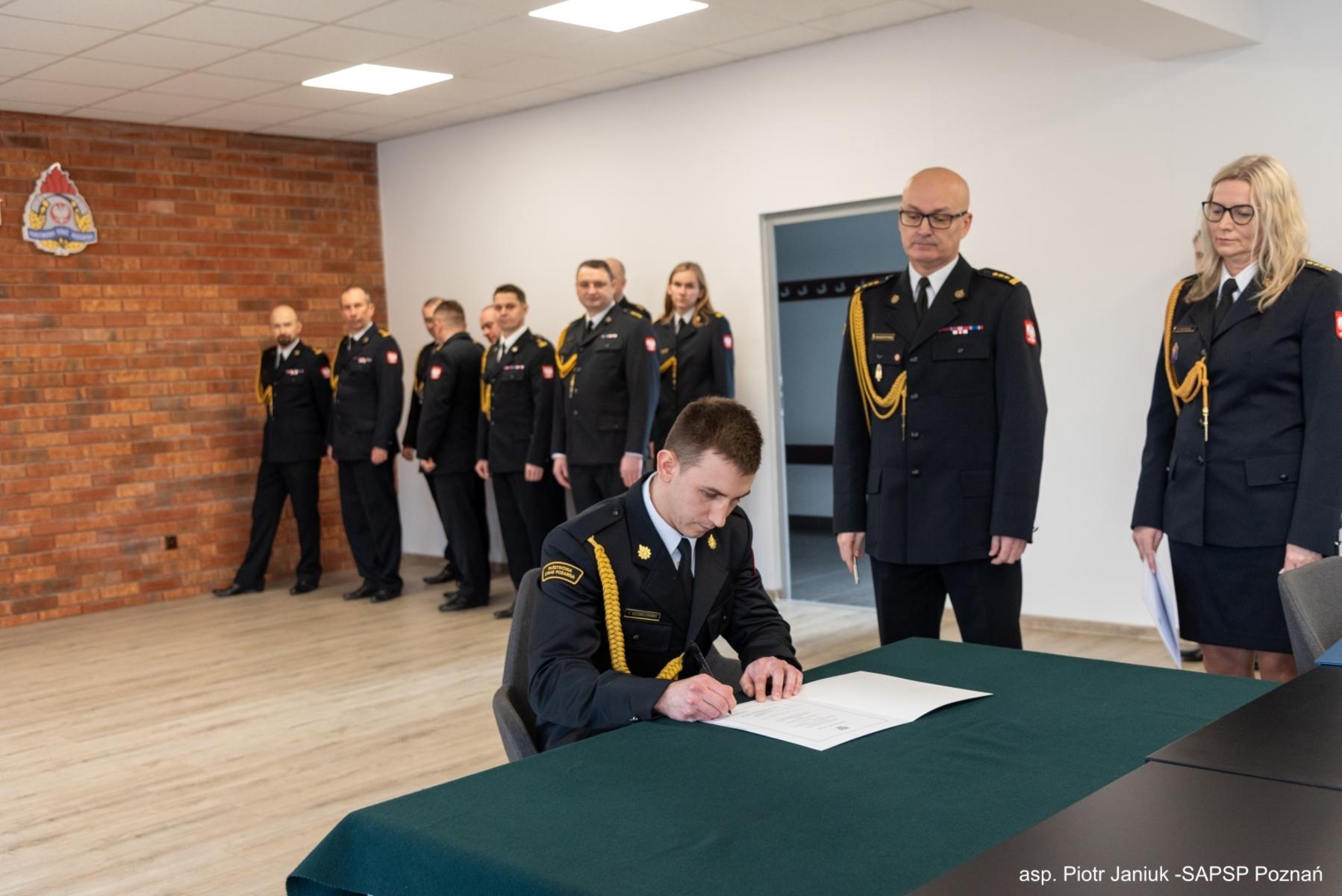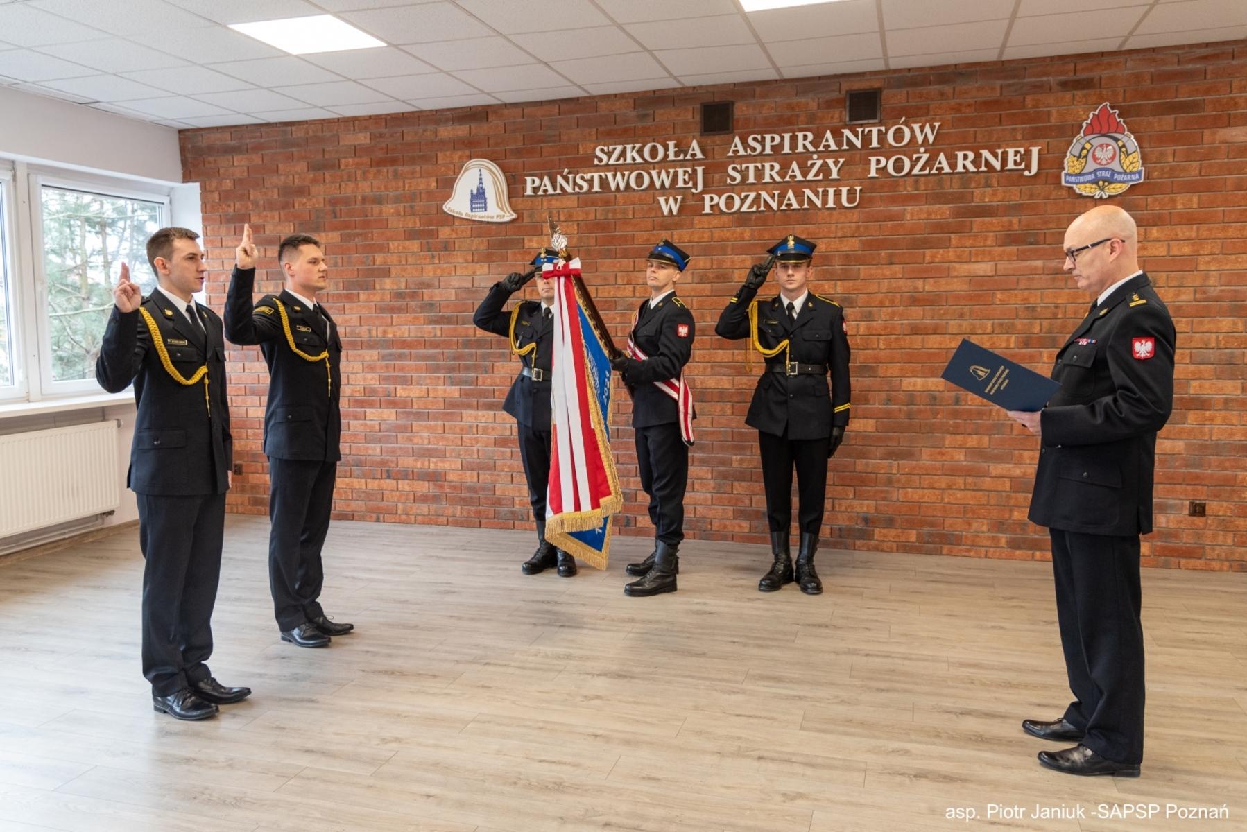 W dniu 13.02.2024 roku w SA PSP w Poznaniu, dwóch nowoprzyjętych do służby funkcjonariuszy złożyło ślubowanie na Sztandar wstępując w szeregi Państwowej Straży Pożarnej. Ślubowanie w obecności kadry kierowniczej od nowoprzyjętych funkcjonariuszy przyjął p.o. Komendanta Szkoły, st. bryg. mgr inż. Andrzej Zajączkowski. Złożenie ślubowania na Sztandar dla każdego strażaka jak i całego środowiska pożarniczego jest wydarzeniem wyjątkowym, czego wyrazem są słowa części roty ślubowania mówiące o świadomym wypełnianiu obowiązków strażaka, cyt. "...nawet z narażeniem życia".
