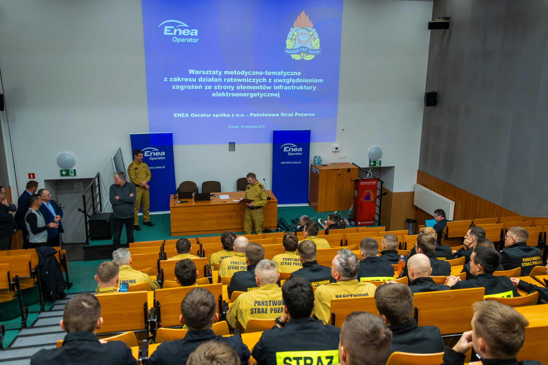 W dniach 25 listopada 2025 r. w Szkole Aspirantów Państwowej Straży Pożarnej w Poznaniu odbyły się warsztaty tematyczne dotyczące organizacji działań ratowniczych z uwzględnieniem zagrożeń wynikających z obecności elementów infrastruktury elektroenergetycznej.