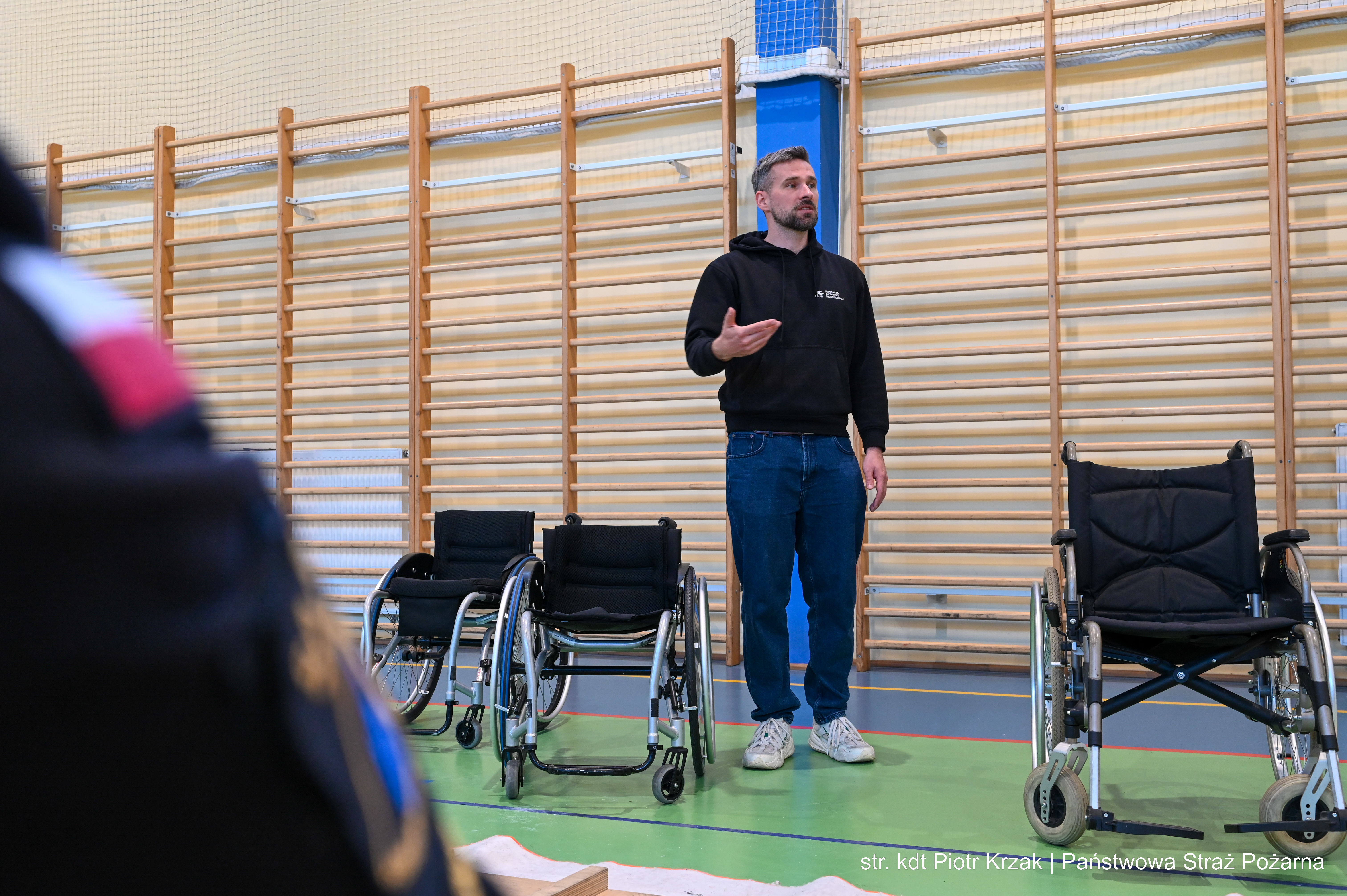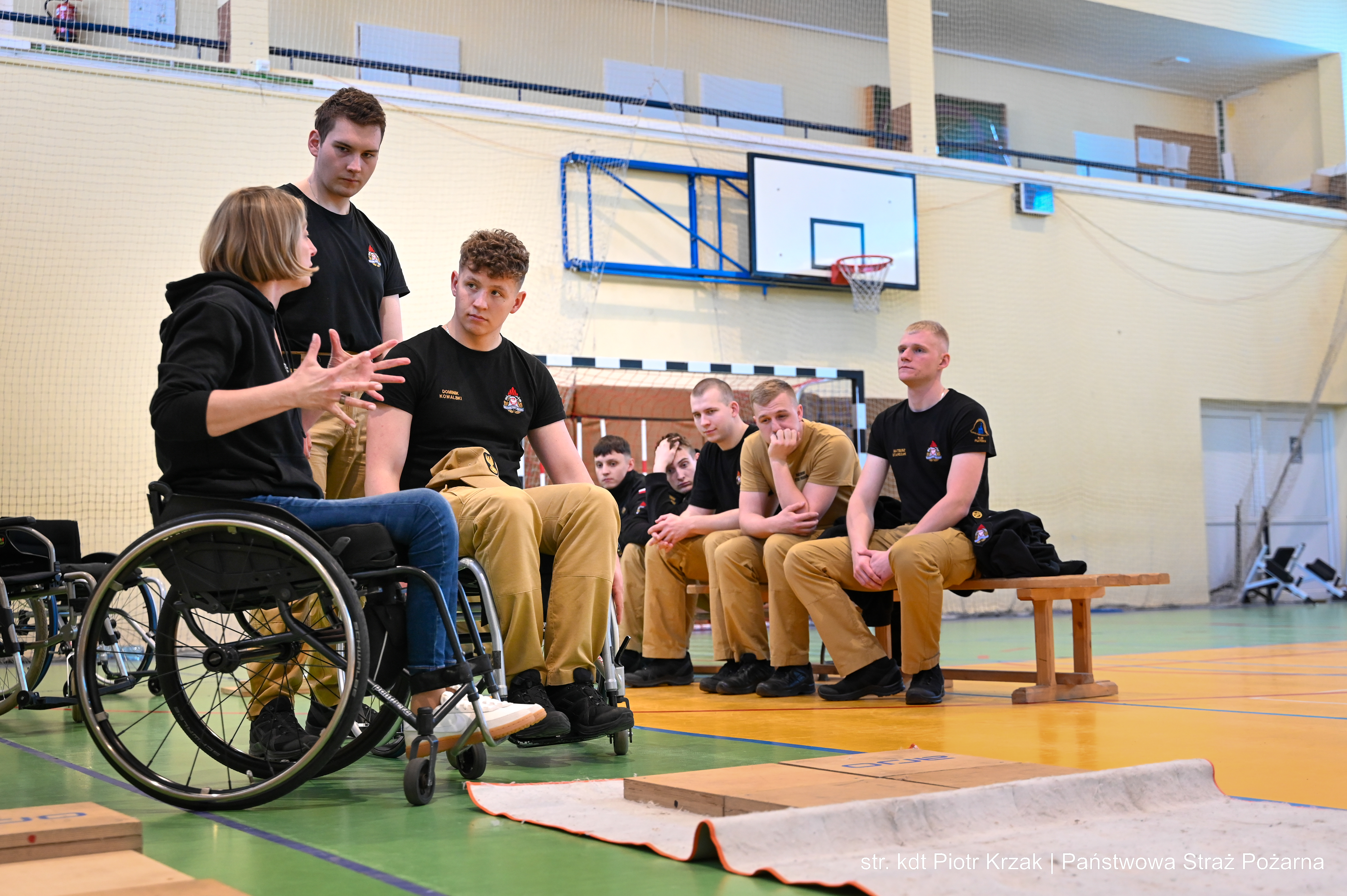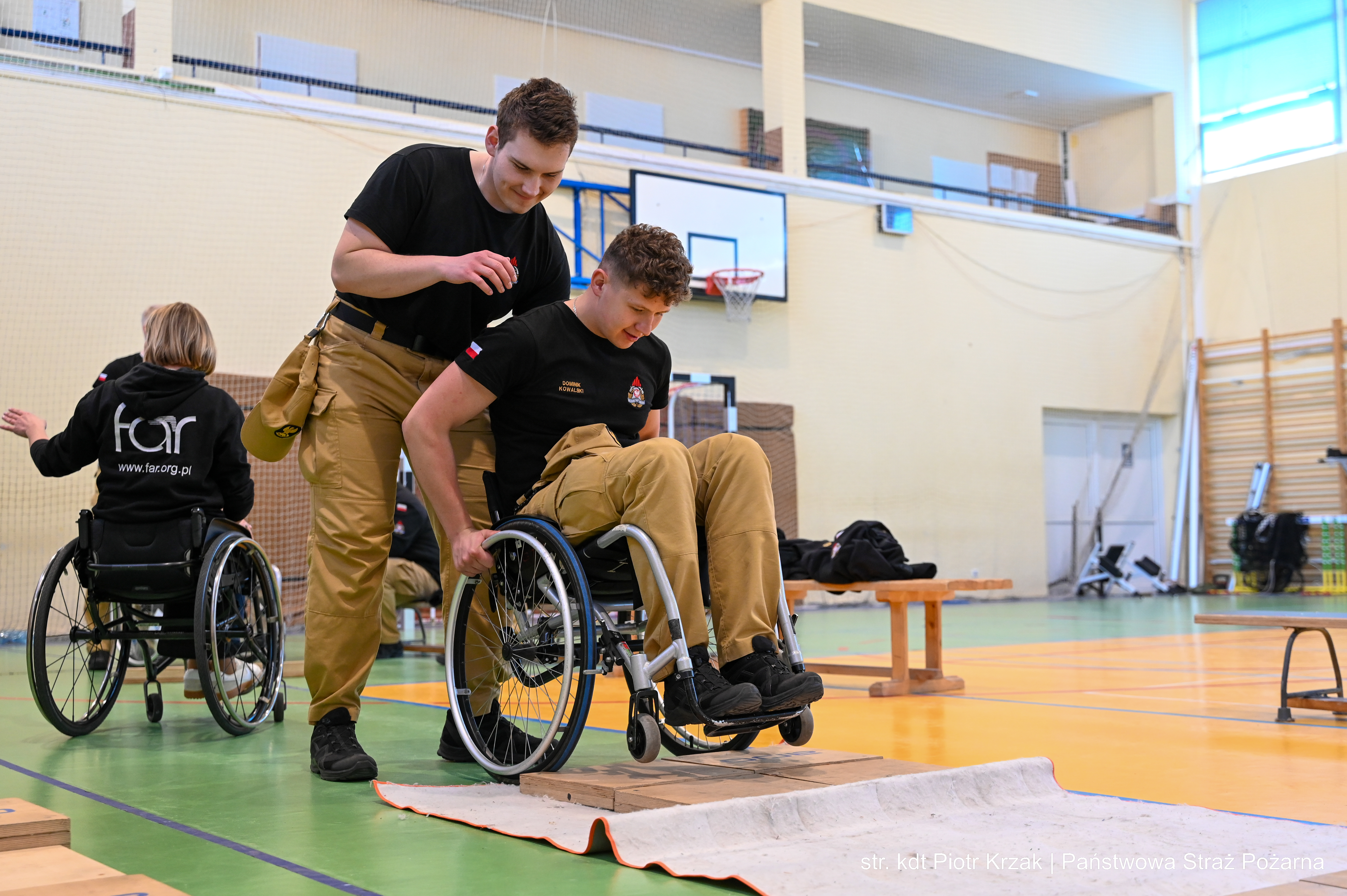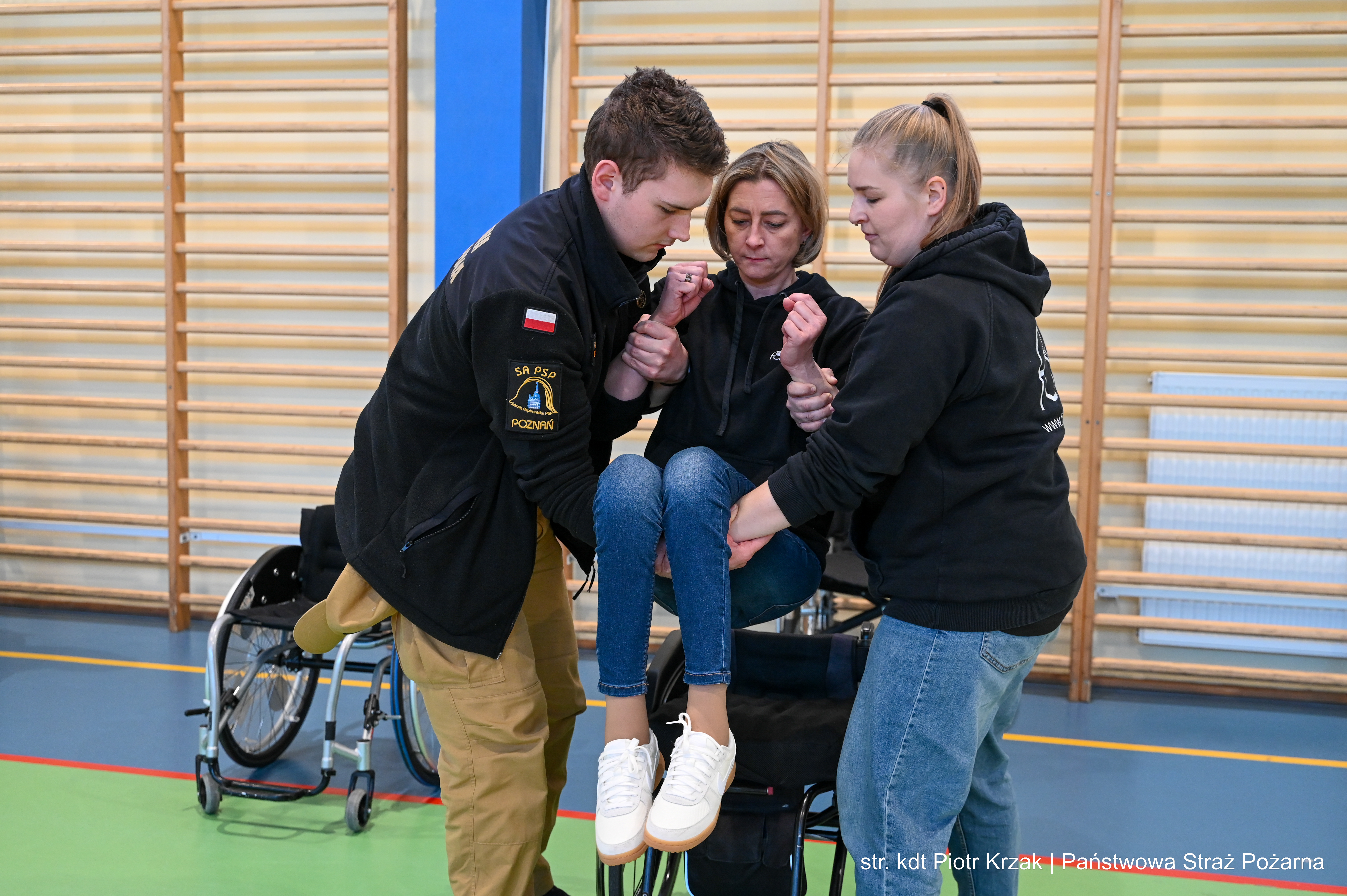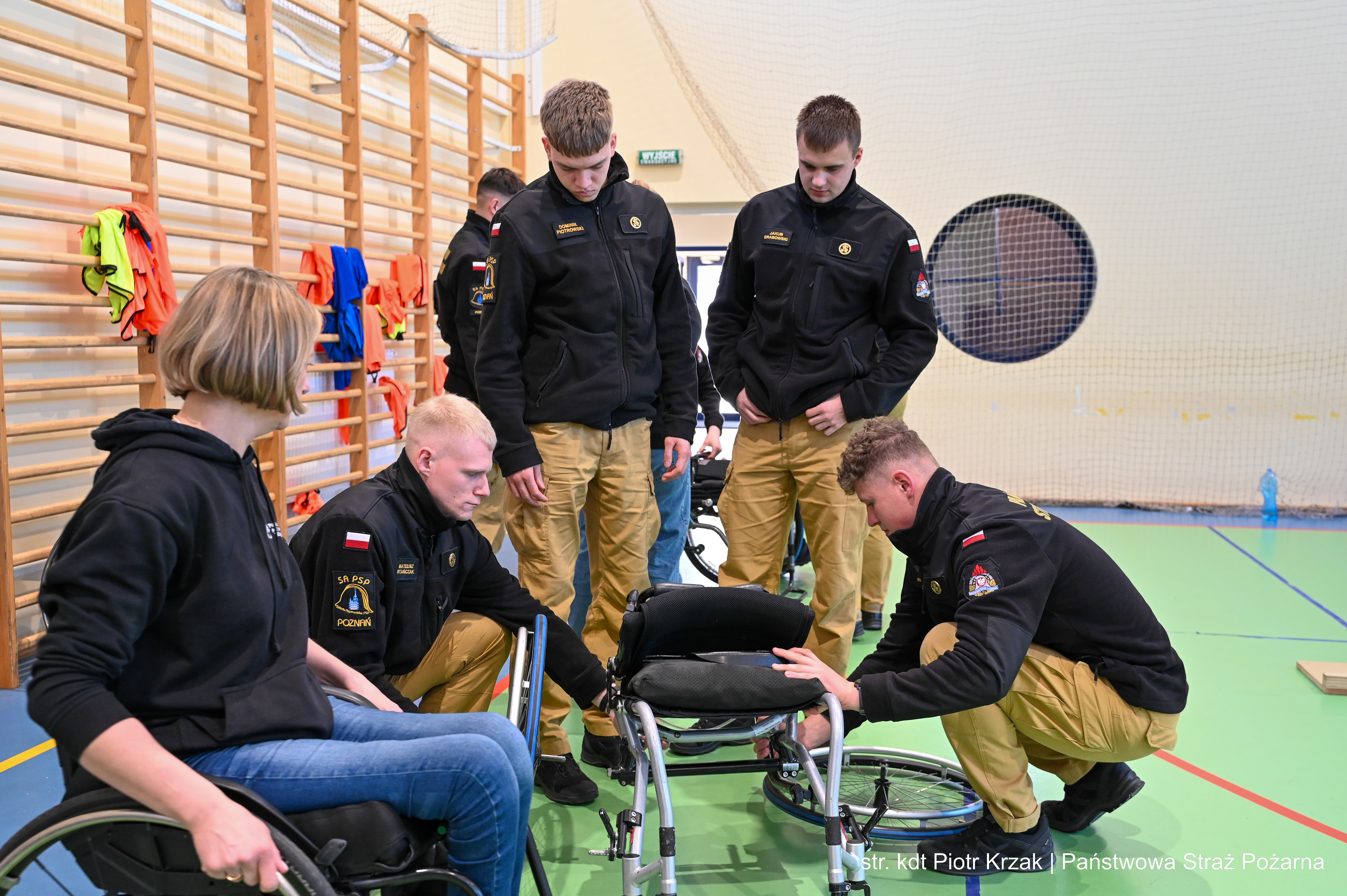 Szczególną wartością warsztatów była część praktyczna – kadeci mieli możliwość nauczyć się technik i chwytów pomocnych podczas ewakuacji oraz udzielania wsparcia osobom z niepełnosprawnościami ruchowymi. Nie zabrakło również elementu doświadczenia – uczestnicy sami mogli spróbować poruszania się na wózkach, co pozwoliło lepiej zrozumieć codzienne bariery i wyzwania.