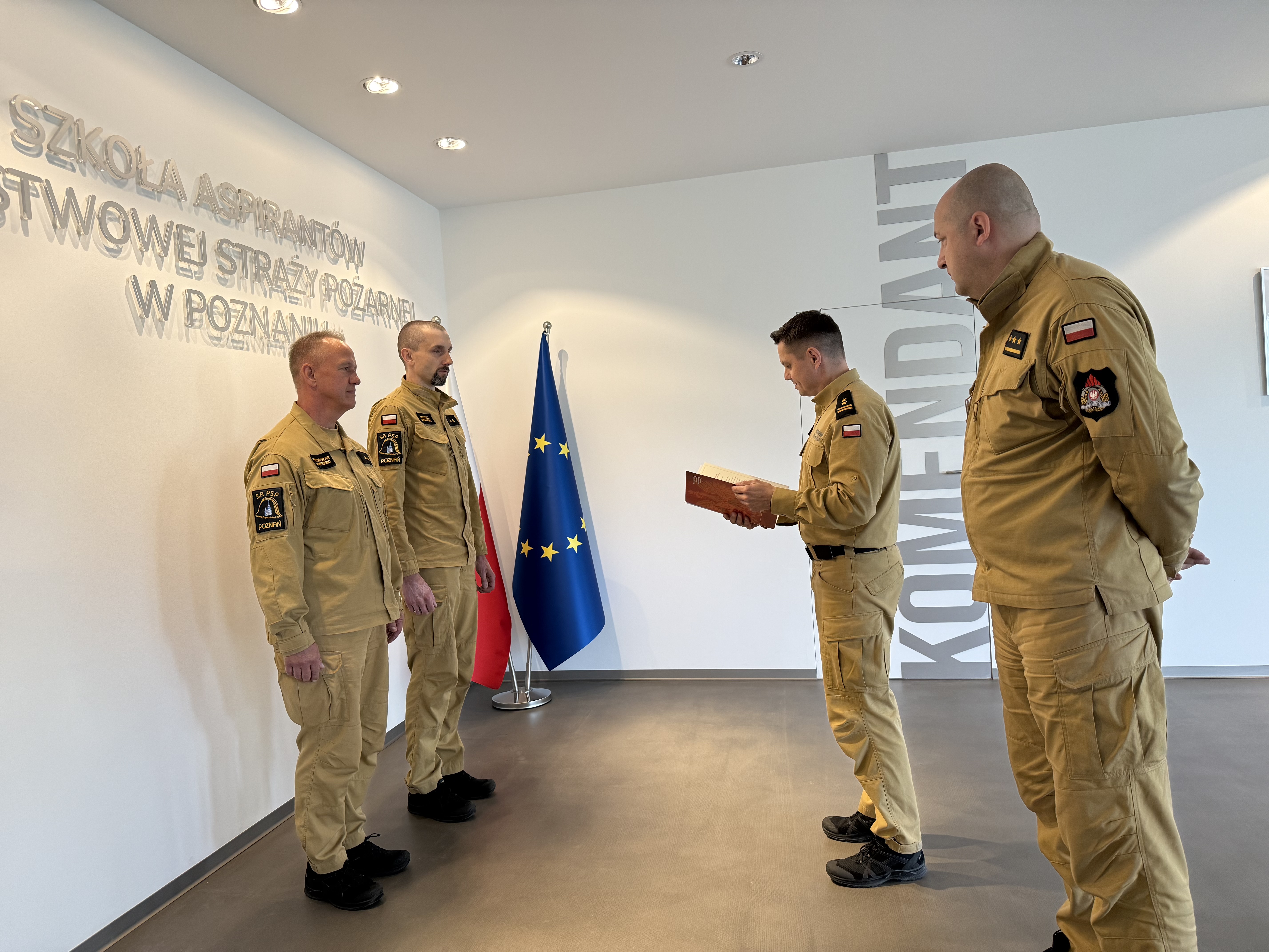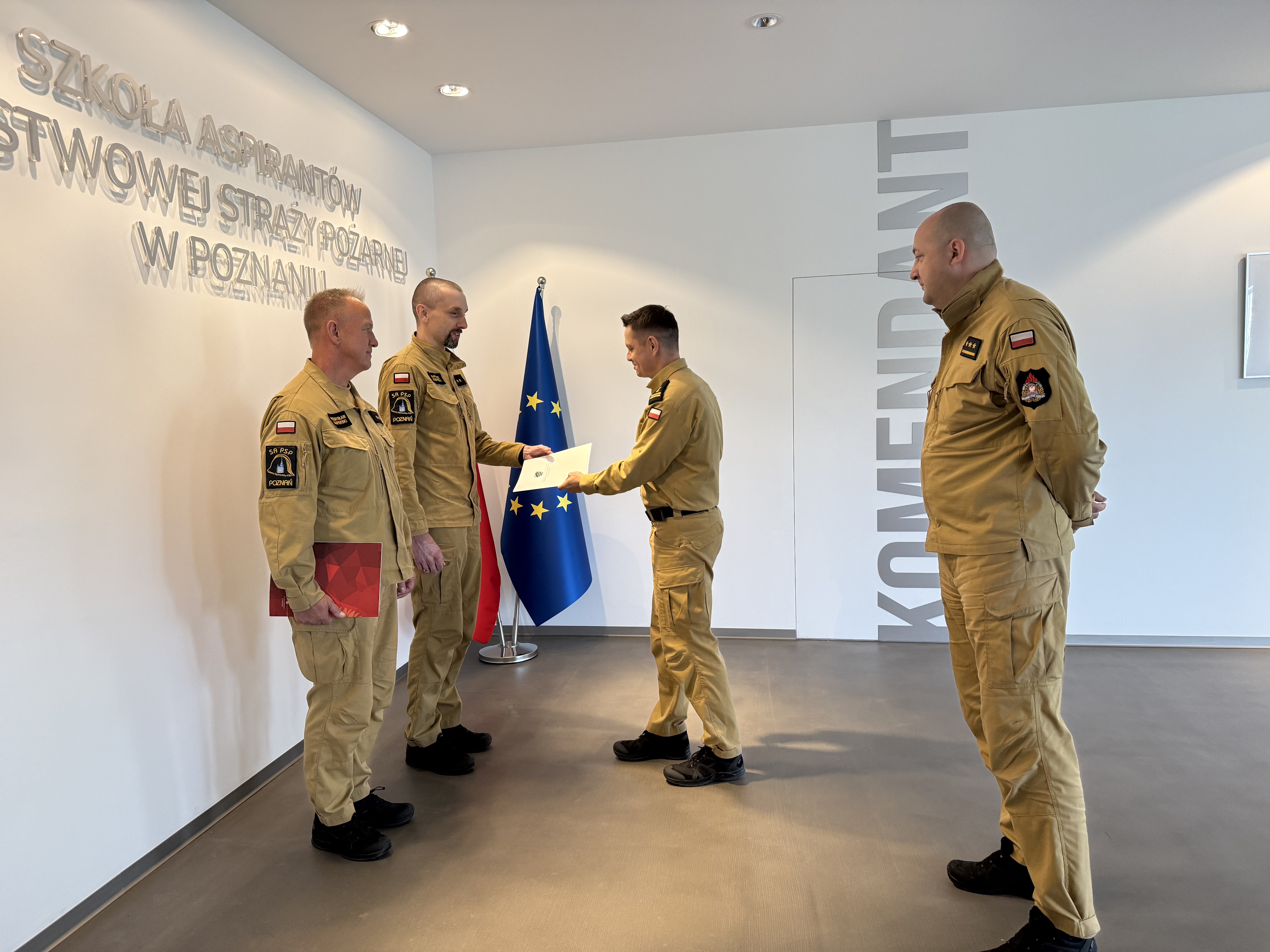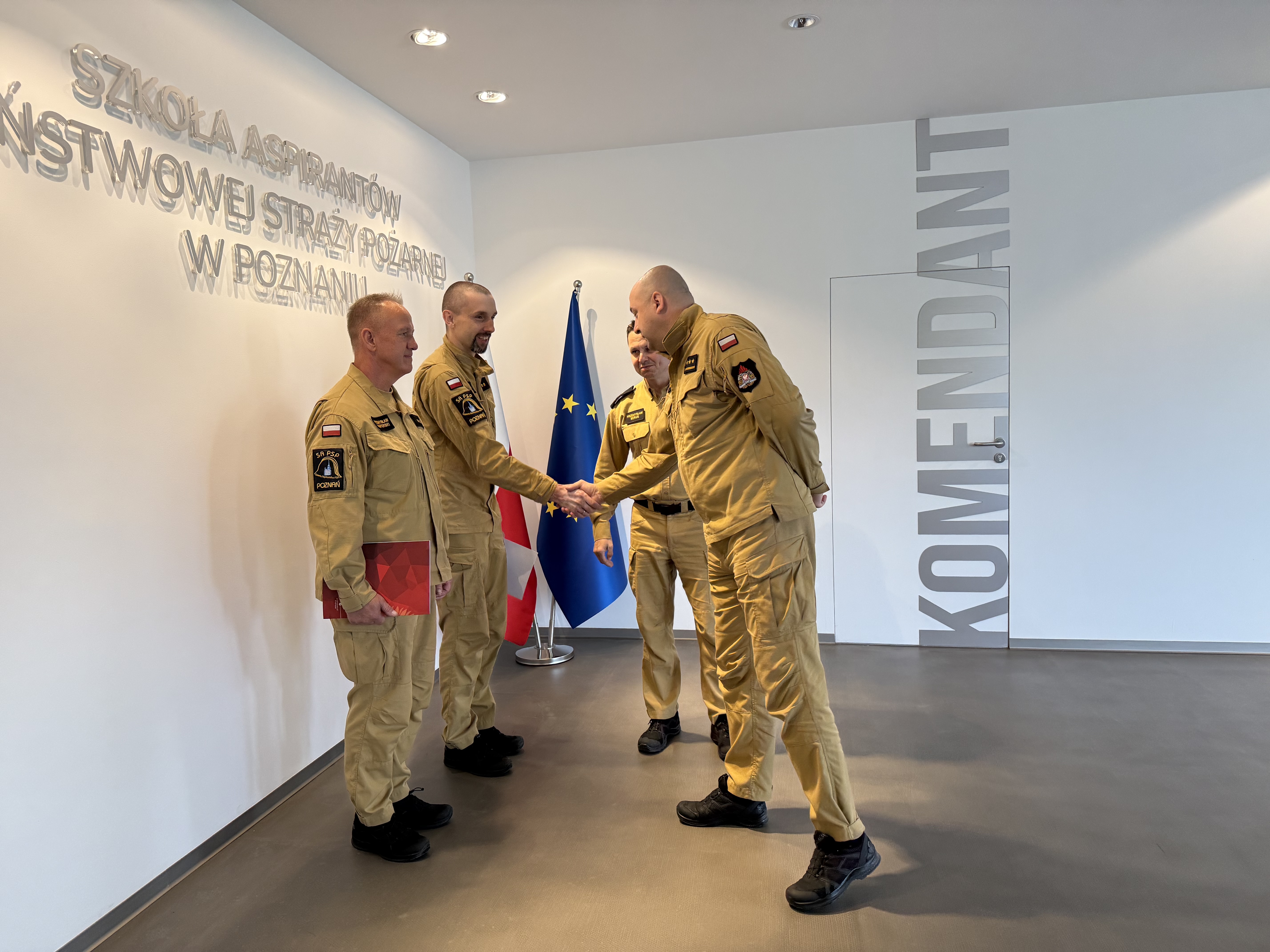 W dniu 18 czerwca 2025 roku Komendant Szkoły Aspirantów PSP w Poznaniu, bryg. Przemysław Berus, w obecności dowódcy Szkolnej Jednostki Ratowniczo-Gaśniczej, kpt. Grzegorza Matczaka, spotkał się z funkcjonariuszami: st. asp. Bartoszem Urbańskim oraz st. asp. Przemysławem Lamperskim, aby uroczyście wręczyć im listy gratulacyjne w uznaniu za wzorową postawę służbową.