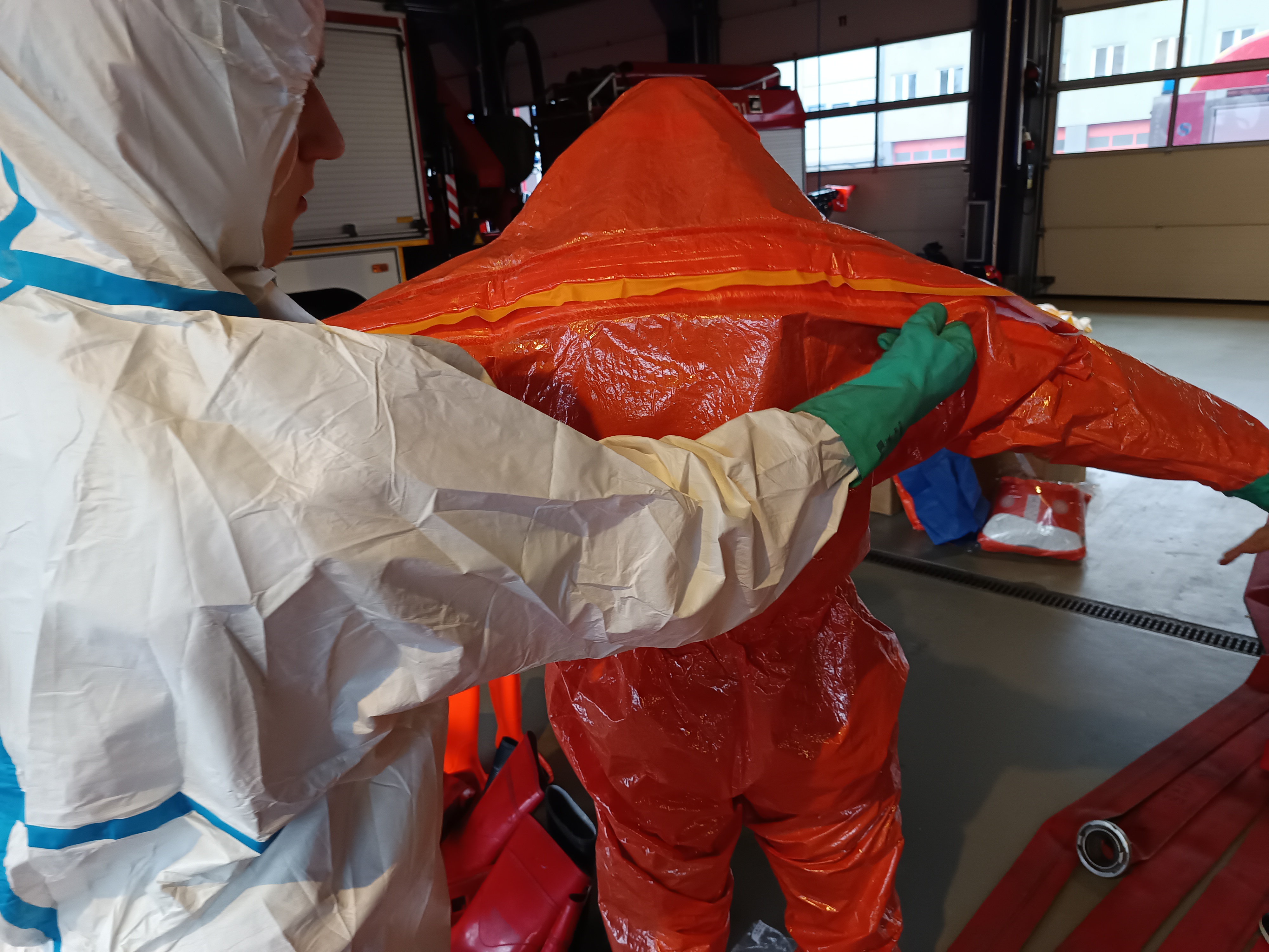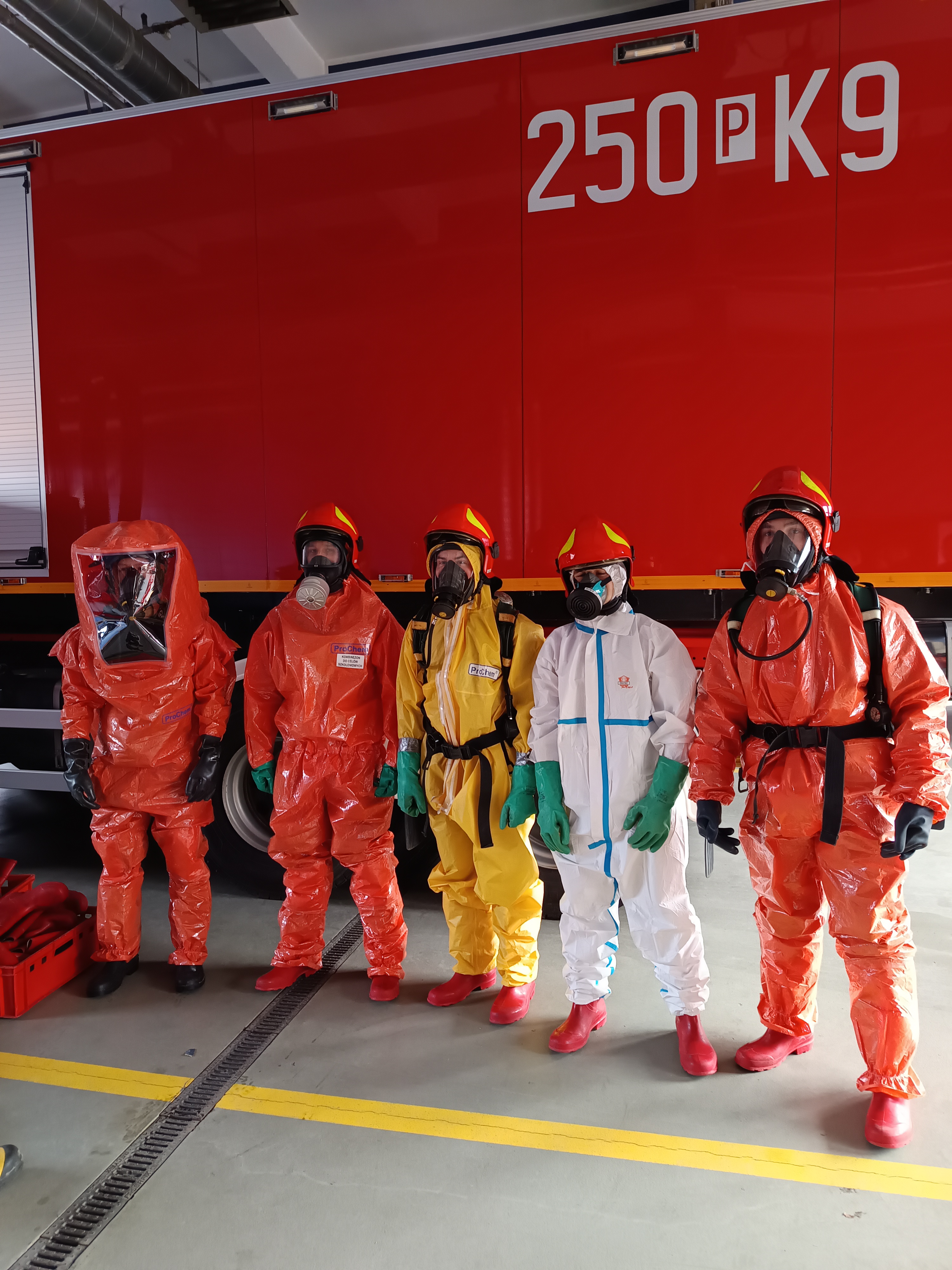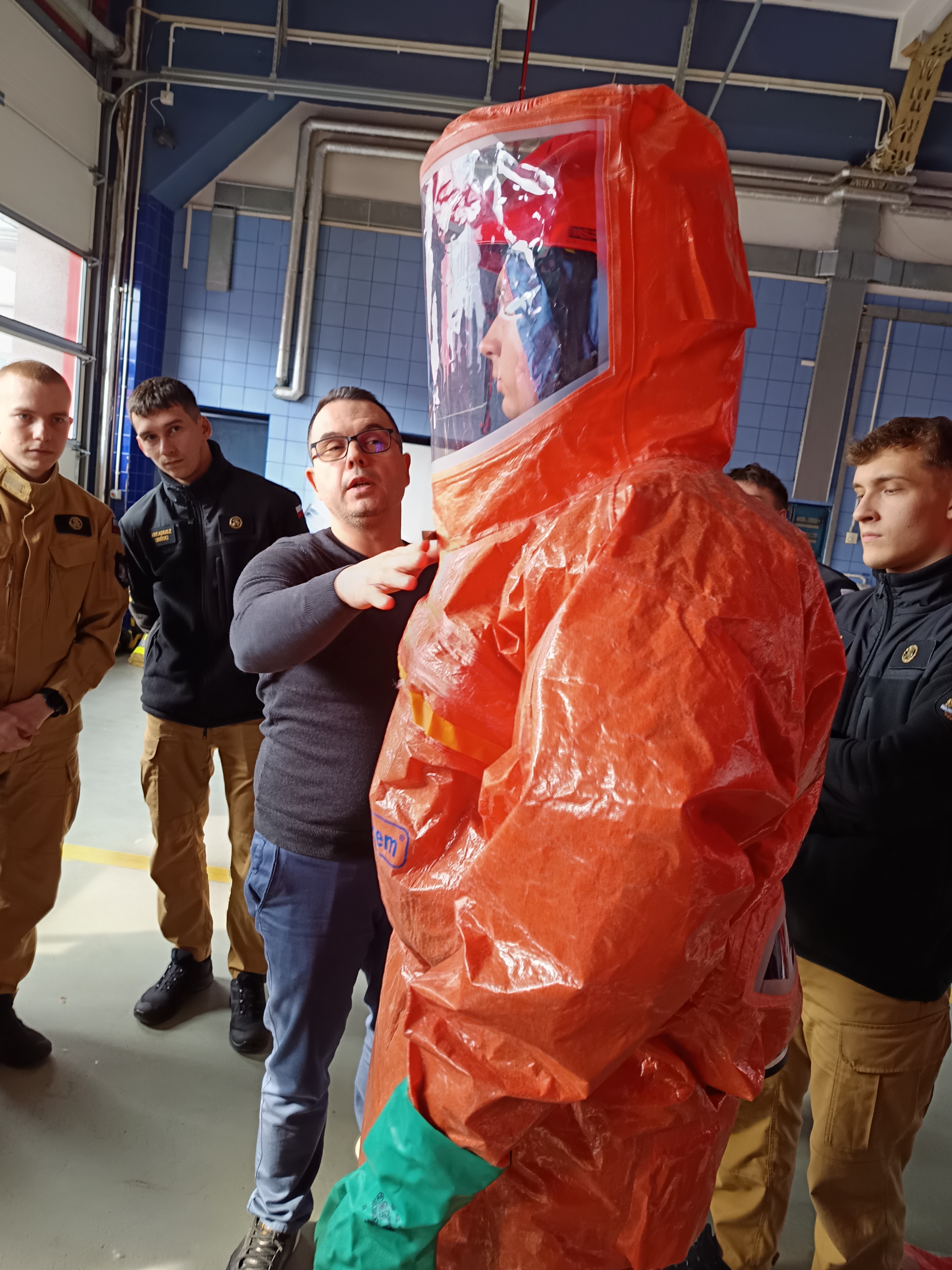 Na zajęciach tych szczegółowo w części teoretycznej, prelegent p. Tomasz Andrzejewski, omówił budowę ubrań chemoodpornych i zaprezentował materiały konstrukcyjne stosowane na poszczególne ich elementy. W części praktycznej przećwiczono prawidłowe ubieranie ratowników w różne modele ubrań przeciwochlapaniowych oraz rozbieranie z nich po dekontaminacji wstępnej. W dalszej części zajęć zaprezentowane zostały również najnowsze rozwiązania związane z konstrukcją ubrań tego typu, umożliwiającą pracę w sprzęcie filtrującym wraz z systemem wentylacji podnoszącym komfort pracy ratownika, polegającym też na minimalizacji ciężaru sprzętu ochrony dróg oddechowych oraz na zdalnej kontroli parametrów pracy sprzętu filtrującego.