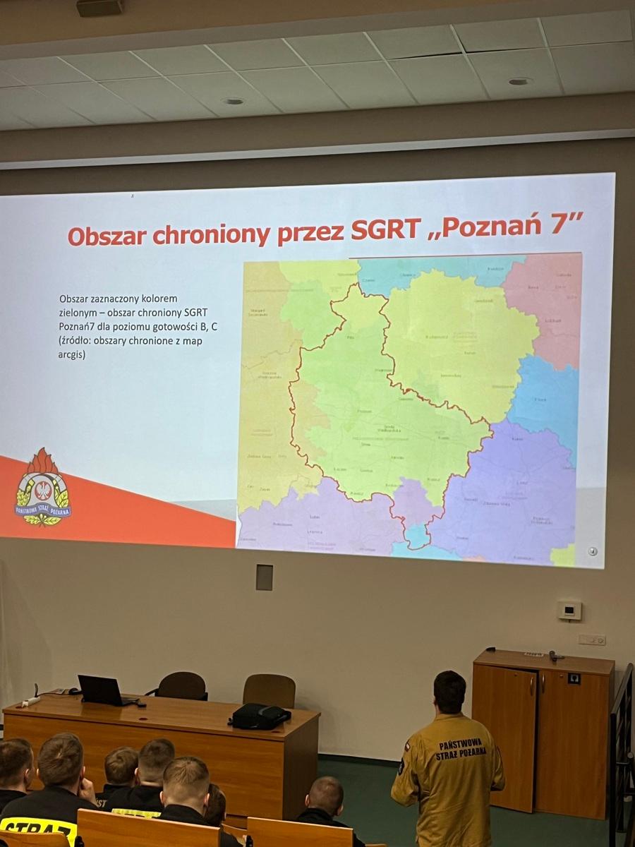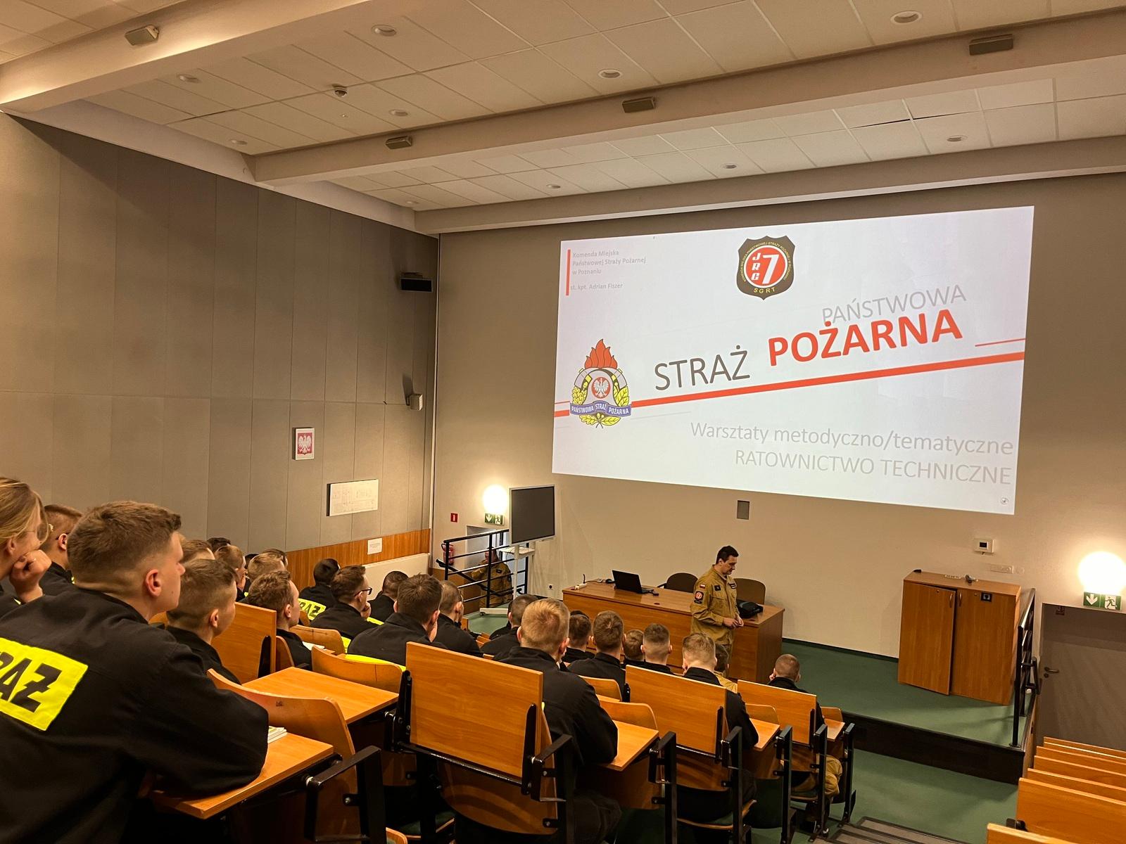 W dniu 4 kwietnia 2024 roku, funkcjonariusze Szkoły Aspirantów Państwowej Straży Pożarnej w Poznaniu oraz słuchacze kształcenia dziennego w zawodzie technik pożarnictwa uczestniczyli w zajęciach uzupełniających z zakresu organizacji ratownictwa technicznego w KSRG. Zajęcia tematycznie ukierunkowane były na aspekty formalne precyzujące przedmiotowy zakres ratownictwa zarówno w zakresie podstawowym jak i specjalistycznym. Zajęcia poprowadził dowódca JRG 7 KM PSP w Poznaniu st. kpt. Adrian Fiszer, będący jednocześnie dowódcą Specjalistycznej Grupy Ratownictwa Technicznego COO (SGRT Poznań 7). Ogromne doświadczenie zawodowe prelegenta, ugruntowana wiedza oraz umiejętność jej przekazu, pozwoliły na efektywny jej transfer dla grona uczestników, którzy będąc na początku swojej drogi służbowej mieli doskonałą okazję uczyć się od najlepszych. W trakcie prelekcji nie zabrakło również przykładów działań rzeczywistych z dziedziny ratownictwa technicznego z całym bagażem uwag i spostrzeżeń, stanowiących potężną porcję wiedzy niezbędnej w codziennej służbie. Prelekcja była jedną z wielu form zajęć uzupełniających realizowanych w SA PSP w Poznaniu, dzięki którym słuchacze mają możliwość nabywania wiedzy dziedzinowej.