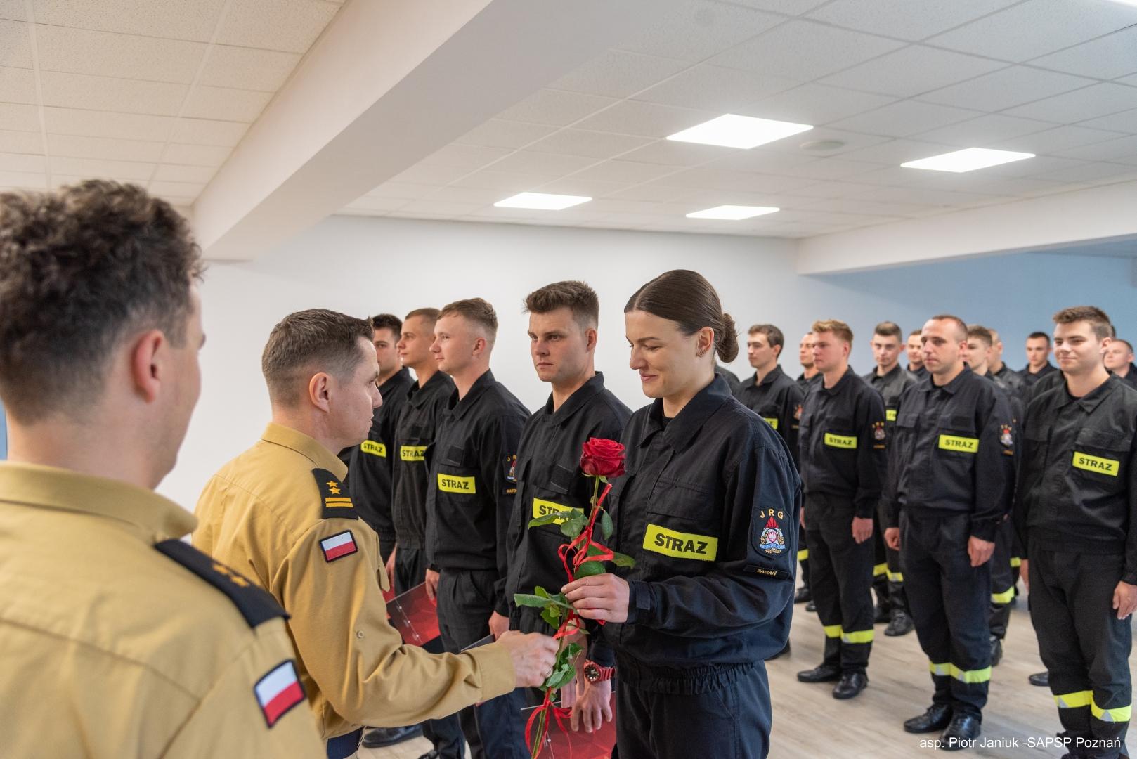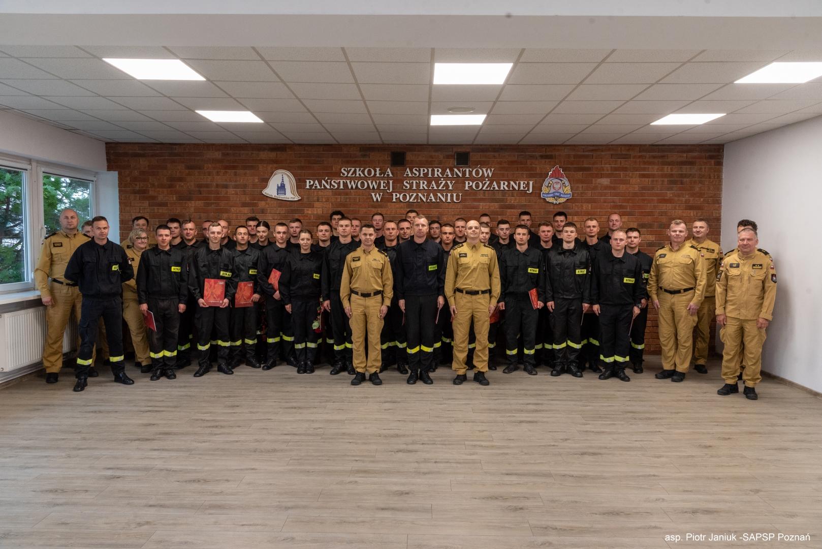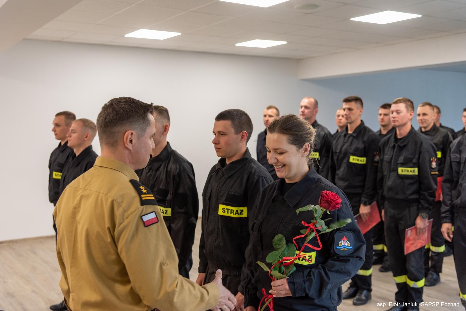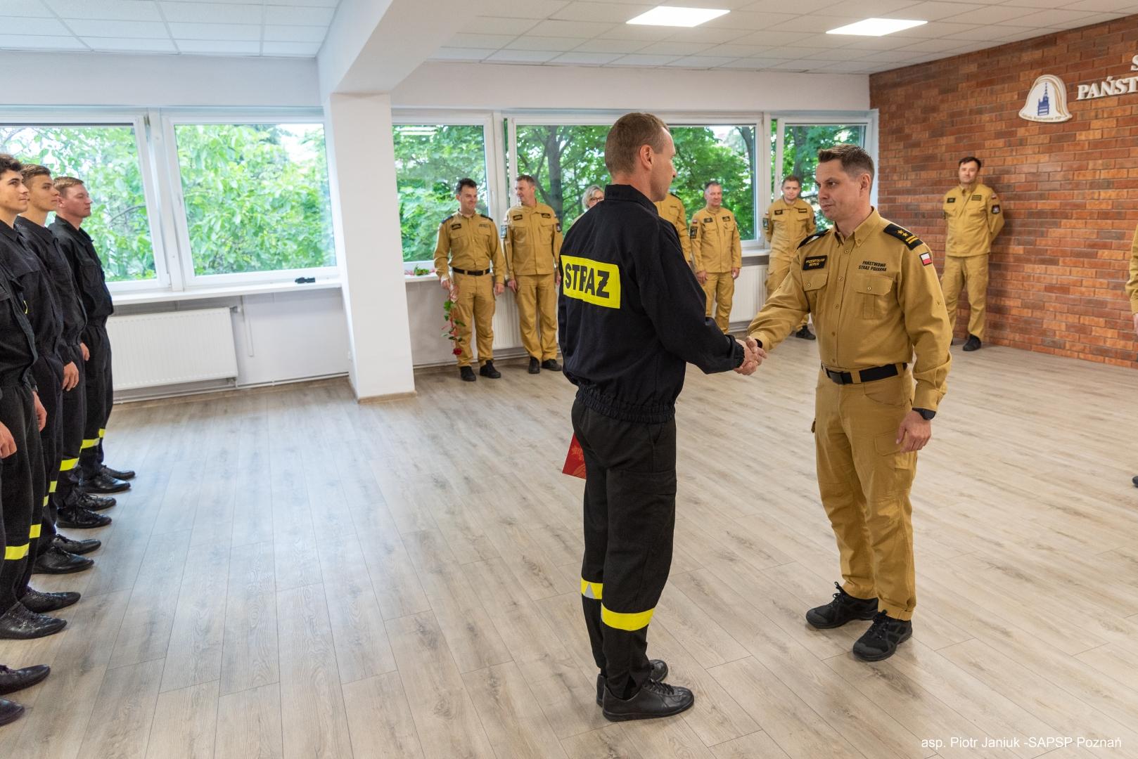 W dniu 13 czerwca 2024r. w SA PSP w Poznaniu odbyło się uroczyste zakończenie "Szkolenia podstawowego w zawodzie strażak", KS-19. Uczestnikami Szkolenia byli funkcjonariusze oraz pracownicy Jednostek Ochrony Przeciwpożarowej, którzy począwszy od dnia 26 lutego br. uczestniczyli w zajęciach kierunkowych zgodnie z planem zajęć Szkolenia. Uczestnicy Szkolenia w ramach zajęć nabyli podstawową wiedzę z zakresu ochrony przeciwpożarowej oraz z zakresu poszczególnych rodzajów ratownictw realizowanych przez podmioty ksrg. W dniach 11-12 czerwca 2024r. odbyły się egzaminy końcowe, na które składały się sprawdzian wiedzy teoretycznej oraz praktyczna weryfikacja nabytych umiejętności ratowniczych. Wszyscy przystępujący do egzaminów (37 osób) uzyskali oceny pozytywne nabywając tym samym kwalifikacje podstawowe w zawodzie strażak. W uroczystym zakończeniu Szkolenia uczestniczył Zastępca Komendanta Szkoły, bryg. Przemysław Berus, który osobiście wręczył świadectwa uczestnikom szkolenia.