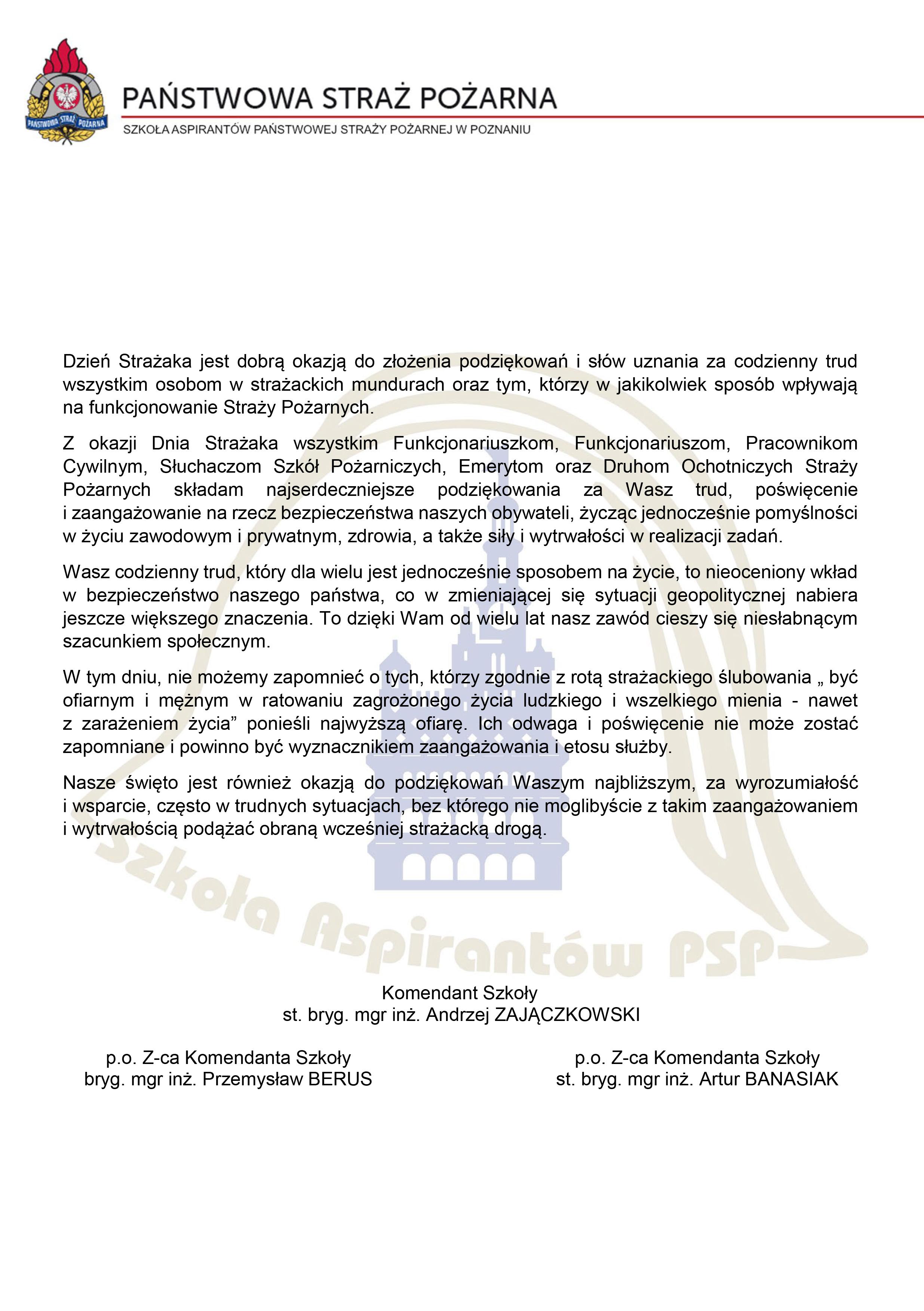 Życzenia Kierownictwa Szkoły Aspirantów PSP w Poznaniu