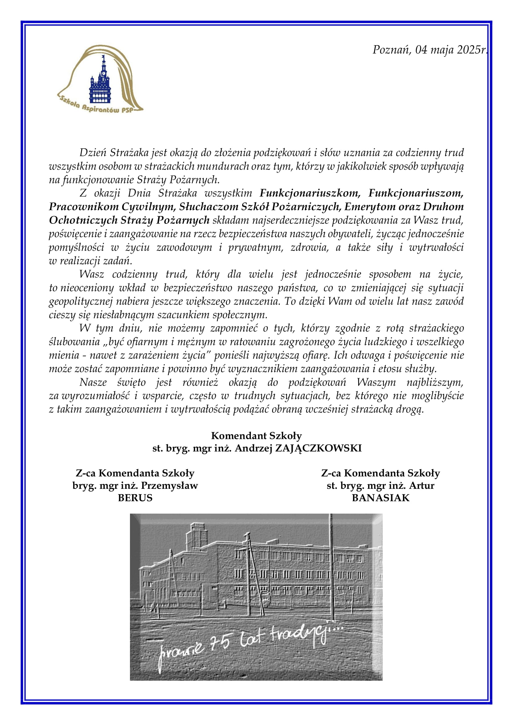 Życzenia Komendanta Szkoły Aspirantów Państwowej Straży Pożarnej w Poznaniu z okazji Dnia Strażaka