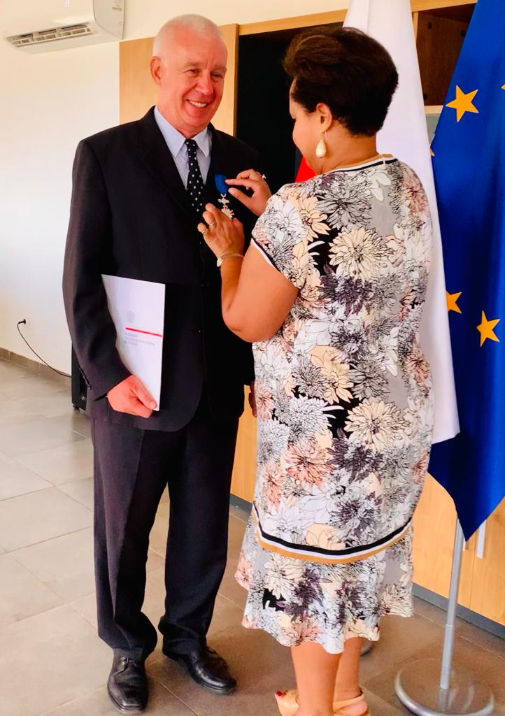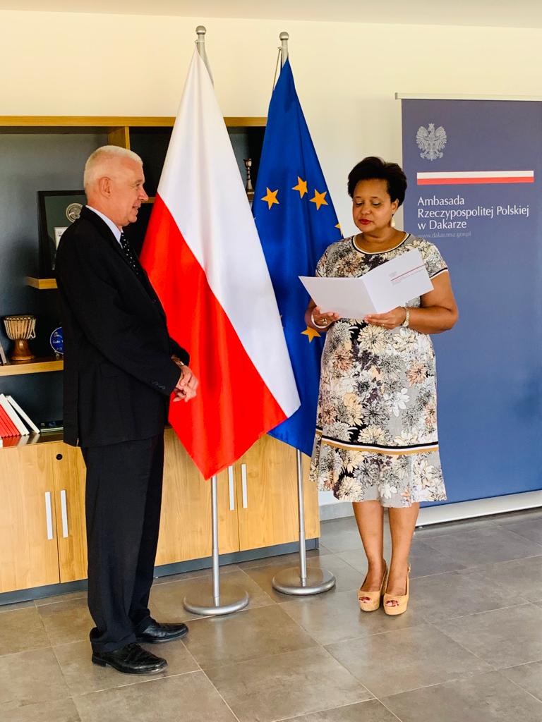 Le 26 août, à l'Ambassade de la République de Pologne à Dakar, au nom du Président de la République de Pologne, Madame l'Ambassadeur Margareta Kassangana a remis la Croix de Chevalier de l'Ordre du Mérite de la République de Pologne à Monsieur le prof. Włodzimierz Szymaniak.